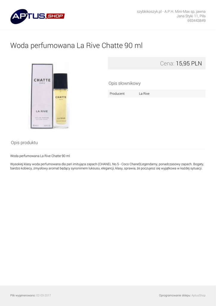 szybkikoszyk.pl - A.P.H. Mini-Max sp, jawna Jana Styki 11, Piła 693443849 Woda perfumowana La Rive Chatte 90 ml Cena: 15,95 PLN Opis słownikowy Producent La Rive Opis produktu Woda perfumowana La Rive Chatte 90 ml Wysokiej klasy woda perfumowana dla pań imitująca zapach (CHANEL No.5 - Coco Chanel)Legendarny, ponadczasowy zapach. Bogaty, bardzo kobiecy, zmysłowy aromat będący synonimem luksusu, elegancji, klasy, sprawia, że poczujesz się wyjątkowa w każdej sytuacji. Plik wygenerowano: 02-03-2017 Powered by TCPDF (www.tcpdf.org) Oprogramowanie sklepu: AptusShop