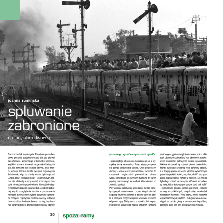 joanna rumiñska spluwanie zabronione fot. AGORA na indyjskim dworcu porannego rytua³u czyszczenia gard³a Dworzec budził się do życia. Poowijane po czubek głowy postacie zaczęły poruszać się, gdy pierwsi pasażerowie, zmierzając w kierunku peronów, szybkimi krokami wybierali drogę wśród leżących ciał. Na zewnątrz było jeszcze ciemno, a na dworcu jedynym źródłem światła była para migoczących świetlówek, więc co chwilę można było usłyszeć „Chalo, bhai!” (uważaj bracie!) – ze strony tych, którym nie udało się w porę usunąć spod nóg co bardziej nieuważnych przechodniów. Na wpół obudzeni mężczyźni zapalali pierwsze bidi, a kobiety zabierały się do przeglądania tobołów w poszukiwaniu menażek z prowiantem: ryżem, soczewicą i plackami chappati. Pojedyncze postacie zaczęły wstawać i wychodzić za budynek dworca i na tory, by dokonać porannej toalety. Stamtąd też dobiegały odgłosy 30 – przeciągłego charczenia kojarzącego się z wymyślną formą samotortury. Przed stojącą na peronie pompą ustawiła się kolejka. Choć poranek był chłodny – słońce jeszcze nie wzeszło – rozebrani do spodenek mężczyźni polewali się zimną wodą, namydlając się szybkimi ruchami, by czym prędzej móc zawinąć się w dhoti, które dopiero co zwinęli z podłogi. Przy wejściu rozłożyli się sprzedawcy świeżo naciętych gałązek drzewa neem. Ludzie, których nie stać na pastę do zębów kupowali je za kilka paise od sztuki, a następnie rozgryzali i pilnie szorowali czerwone od paanu zęby. Ślady paanu – używki z liści pieprzu betelowego, gaszonego wapna, przypraw i orzecha spoza spotkanie rozmowa ramy arekowego – gęsto znaczyły teren dworca, mimo tabliczek „Spluwanie zabronione” czy obecności plastikowych pingwinów, pełniących funkcję spluwaczek. Wkrótce też zaczęli się pojawiać pierwsi chai-wallahs, którzy, dźwigając w jednej ręce ogromny czajnik, a w drugiej gliniane miseczki, głosem wyćwiczonym przez lata praktyki wołali „chai, chai, chaiii!”, zachęcając do kupna słodkiej herbaty z mlekiem. Nie trzeba było długo czekać, by zaczęli im wtórować sprzedawcy kawy, którzy świdrującymi seriami „kofi, kofi, kofiii!” – wyrzucanymi głosami cienkim jak struna – stawiali na nogi wszystkich tych, których dotąd nie obudził narastający harmider. Tylko sadhu, święci mężowie w pomarańczowych szatach i o długich włosach zwiniętych na czubku głowy w kok na cześć boga Siwy, spokojnie dalej śnili sny, jakie przyniosła im ganja. fot. AGORA fot. jerzy gillert fot. jerzy gillert fot. AGORA Nie wiadomo, kiedy dworzec z noclegowni dającej schronienie znużonemu tłumowi – pielgrzymom odbywającym podróż do świętych miejsc, prowincjuszom udającym się do metropolii w nadziei na lepsze życie, rodzinom noszącym dorobek całego życia w paru tobołkach, eunuchom wymuszającym datki od podróżnych pod groźbą rzucenia klątwy (i pokazania tego, co mają pod sari), wiecznie brudnym chłopcom zarabiającym na życie zmiataniem podłóg pociągów – stał się bazarem. Kramy z jedzeniem – jajkami na twardo, samosą czy puri – rozświetliły się blaskiem lamp naftowych, z telewizorów zawieszonych pod dachem peronu popłynął przenikliwy, wysoki kobiecy głos, śpiewający pieśni religijne, bagażowi, równoważąc niemal kobiecym ruchem bioder ciężar waliz niesionych na głowie, podążali truchtem za co zamożniejszymi klientami, a przed wejściem na dworzec zaroiło się od riksz rowerowych przywożących pasażerów na pierwszy pociąg do Bombaju. Dworzec w Nasik w pełni obudził się do życia. Koleje są jedną z najważniejszych instytucji w Indiach. Jak pisze W. Dalrymple w „The Age of Kali”, koleje uczyniły z Indii naród – bo dopiero wtedy, gdy położono tory łączące Himalaje z morzem Arabskim, gdy stworzono sieć łączącą tysiące indyjskich wiosek, a czas podróży z północy na południe subkontynentu skrócił się do kilku dni (najdłuższa trasa kolejowa w Indiach z Jammu w Kaszmirze do Kannyakumari na najdalej wysuniętym na południe cyplu Indii zabiera obecnie trzy dni), Indie spostrzeg³y, ¿e stanowi¹ jednoœæ. Koleje przyniosły także rodzaj rewolucji obyczajowej, gdy okazało się, że bramini – najwyższa kasta 31 w hierarchii społecznej Indii – zmuszeni są dzielić ramię w ramię trudy podróży z tymi, którzy w tej hierarchii od wieków zajmowali najniższe miejsce – nietykalnymi. W ten to sposób instytucja wprowadzona przez Brytyjczyków, po to aby ulepszyć administrowanie kolonią, zmieniła oblicze subkontynentu. Sama zresztą nie zdołała oprzeć się oddziaływaniu Indii. Wraz z powstawaniem sieci coraz gęściej oplatającej subkontynent, wykształcała się, na wzór systemu kastowego, machina do obsługi kolei – cała ta biurokratyczna piramida wznosząca się, szczebel po szczeblu, od zamiataczy, bagażowych, pracowników od pobierania bagażu w depozyt oraz pracowników od wydawania bagażu z depozytu, poprzez zawiadowców, konduktorów, kontrolerów biletów, młodszych i starszych inspektorów, aż po kierowników stacji i urzędników ministerstwa do spraw kolei. Trudno jest zrozumieć istotę indyjskiej biurokracji kolejowej, gdy nie zostało się wychowanym w kulturze, w której czci się bogów o wielu twarzach i inkarnacjach, a odwiecznym cyklem karmy rządzą szczegółowe kodeksy wyznaczające każdemu stałe miejsce w porządku społecznym. Dla większości przybyszów z Zachodu koleje indyjskie są objawieniem. Gdy czeka się godzinami na spóźniony pociąg – a bywa, że trzeba czekać i cały dzień – cała indyjska rzeczywistość przewija się przed oczami: chaotyczna, barwna, magnetyzująca i... opresywna. W Indiach bowiem nigdy nie pozostaje się jedynie biernym obserwatorem, lecz szybko staje się uczestnikiem wydarzeń: tłum zawłaszcza naszą przestrzeń i odbier