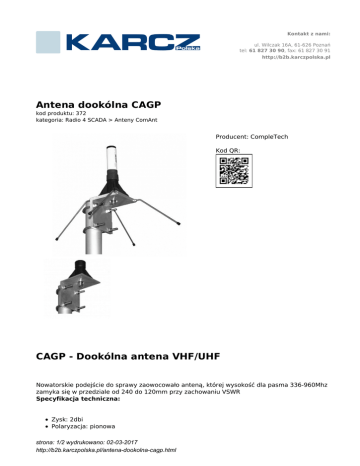 Kontakt z nami: ul. Wilczak 16A, 61-626 Poznań tel: 61 827 30 90, fax: 61 827 30 91 http://b2b.karczpolska.pl Antena dookólna CAGP kod produktu: 372 kategoria: Radio 4 SCADA > Anteny ComAnt Producent: CompleTech Kod QR: CAGP - Dookólna antena VHF/UHF Nowatorskie podejście do sprawy zaowocowało anteną, której wysokość dla pasma 336-960Mhz zamyka się w przedziale od 240 do 120mm przy zachowaniu VSWR Specyfikacja techniczna: Zysk: 2dbi Polaryzacja: pionowa strona: 1/2 wydrukowano: 02-03-2017 http://b2b.karczpolska.pl/antena-dookolna-cagp.html Radiacja: dookólna VSWR: <1.5 Radiator: miedziany Waga: ~950g Zakończenie: N(f) Wartość L określa długość promiennika (wysokość anteny) w mm. Anteny serii CAGP dostępne są dla częstotliwości od 60 do 5725MHz. CompleTech jest fińską firmą specjalizującą się w projektowaniu, produkcji i sprzedaży wysokiej jakości anten łączności dla profesjonalistów od 1990 roku. CompleTech stosuje innowacyjne podejście do technologii antenowej, co odbija się w filozofii modułowej i elastycznej konstrukcji. Prowadzi to do unikalnej konstrukcji anteny i zastosowań ComAnt®. Anteny ComAnt® wykonane są z materiałów, które są bezpieczne dla środowiska. Anteny ComAnt® są zgodne z dyrektywami WEEE i RoHS. System jakości został opracowany zgodnie z normą ISO 9001. Wszystkie produkty ComAnt® są testowane przed wysłaniem do odbiorcy. strona: 2/2 wydrukowano: 02-03-2017 http://b2b.karczpolska.pl/antena-dookolna-cagp.html