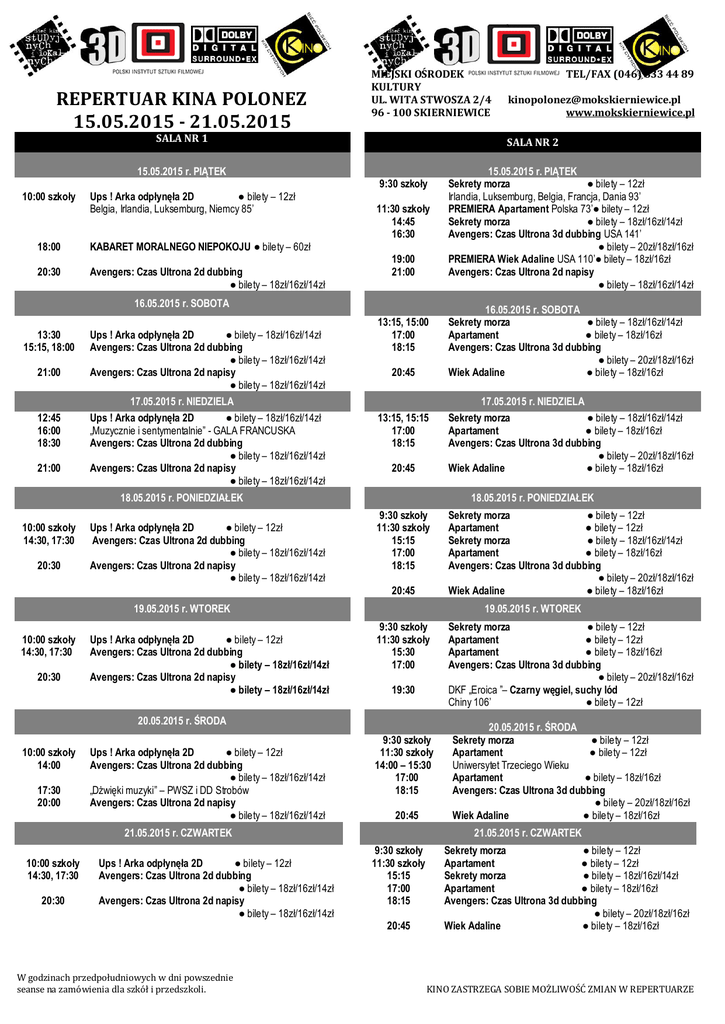 ` REPERTUAR KINA POLONEZ 15.05.2015 - 21.05.2015 MIEJSKI OŚRODEK KULTURY UL. WITA STWOSZA 2/4 96 - 100 SKIERNIEWICE SALA NR 1 15.05.2015 r. PIĄTEK 10:00 szkoły Ups ! Arka odpłynęła 2D ● bilety – 12zł Belgia, Irlandia, Luksemburg, Niemcy 85’ 18:00 KABARET MORALNEGO NIEPOKOJU ● bilety – 60zł 20:30 Avengers: Czas Ultrona 2d dubbing ● bilety – 18zł/16zł/14zł 21:00 12:45 16:00 18:30 21:00 Ups ! Arka odpłynęła 2D ● bilety – 18zł/16zł/14zł Avengers: Czas Ultrona 2d dubbing ● bilety – 18zł/16zł/14zł Avengers: Czas Ultrona 2d napisy ● bilety – 18zł/16zł/14zł 17.05.2015 r. NIEDZIELA Ups ! Arka odpłynęła 2D ● bilety – 18zł/16zł/14zł „Muzycznie i sentymentalnie” - GALA FRANCUSKA Avengers: Czas Ultrona 2d dubbing ● bilety – 18zł/16zł/14zł Avengers: Czas Ultrona 2d napisy ● bilety – 18zł/16zł/14zł 9:30 szkoły 11:30 szkoły 14:45 16:30 19:00 21:00 13:15, 15:00 17:00 18:15 20:45 13:15, 15:15 17:00 18:15 20:45 18.05.2015 r. PONIEDZIAŁEK 10:00 szkoły 14:30, 17:30 20:30 Ups ! Arka odpłynęła 2D ● bilety – 12zł Avengers: Czas Ultrona 2d dubbing ● bilety – 18zł/16zł/14zł Avengers: Czas Ultrona 2d napisy ● bilety – 18zł/16zł/14zł 20:45 20:30 Ups ! Arka odpłynęła 2D ● bilety – 12zł Avengers: Czas Ultrona 2d dubbing ● bilety – 18zł/16zł/14zł Avengers: Czas Ultrona 2d napisy ● bilety – 18zł/16zł/14zł 17:30 20:00 Ups ! Arka odpłynęła 2D ● bilety – 12zł Avengers: Czas Ultrona 2d dubbing ● bilety – 18zł/16zł/14zł „Dżwięki muzyki” – PWSZ i DD Strobów Avengers: Czas Ultrona 2d napisy ● bilety – 18zł/16zł/14zł 9:30 szkoły 11:30 szkoły 15:30 17:00 19:30 9:30 szkoły 11:30 szkoły 14:00 – 15:30 17:00 18:15 20:45 21.05.2015 r. CZWARTEK 10:00 szkoły 14:30, 17:30 20:30 Ups ! Arka odpłynęła 2D ● bilety – 12zł Avengers: Czas Ultrona 2d dubbing ● bilety – 18zł/16zł/14zł Avengers: Czas Ultrona 2d napisy ● bilety – 18zł/16zł/14zł W godzinach przedpołudniowych w dni powszednie seanse na zamówienia dla szkół i przedszkoli. 16.05.2015 r. SOBOTA Sekrety morza ● bilety – 18zł/16zł/14zł Apartament ● bilety – 18zł/16zł Avengers: Czas Ultrona 3d dubbing ● bilety – 20zł/18zł/16zł Wiek Adaline ● bilety – 18zł/16zł 17.05.2015 r. NIEDZIELA Sekrety morza ● bilety – 18zł/16zł/14zł Apartament ● bilety – 18zł/16zł Avengers: Czas Ultrona 3d dubbing ● bilety – 20zł/18zł/16zł Wiek Adaline ● bilety – 18zł/16zł Sekrety morza ● bilety – 12zł Apartament ● bilety – 12zł Sekrety morza ● bilety – 18zł/16zł/14zł Apartament ● bilety – 18zł/16zł Avengers: Czas Ultrona 3d dubbing ● bilety – 20zł/18zł/16zł Wiek Adaline ● bilety – 18zł/16zł 19.05.2015 r. WTOREK 20.05.2015 r. ŚRODA 10:00 szkoły 14:00 15.05.2015 r. PIĄTEK Sekrety morza ● bilety – 12zł Irlandia, Luksemburg, Belgia, Francja, Dania 93’ PREMIERA Apartament Polska 73’● bilety – 12zł Sekrety morza ● bilety – 18zł/16zł/14zł Avengers: Czas Ultrona 3d dubbing USA 141’ ● bilety – 20zł/18zł/16zł PREMIERA Wiek Adaline USA 110’● bilety – 18zł/16zł Avengers: Czas Ultrona 2d napisy ● bilety – 18zł/16zł/14zł 18.05.2015 r. PONIEDZIAŁEK 9:30 szkoły 11:30 szkoły 15:15 17:00 18:15 19.05.2015 r. WTOREK 10:00 szkoły 14:30, 17:30 [email protected] www.mokskierniewice.pl SALA NR 2 16.05.2015 r. SOBOTA 13:30 15:15, 18:00 TEL/FAX (046) 833 44 89 Sekrety morza ● bilety – 12zł Apartament ● bilety – 12zł Apartament ● bilety – 18zł/16zł Avengers: Czas Ultrona 3d dubbing ● bilety – 20zł/18zł/16zł DKF „Eroica ”– Czarny węgiel, suchy lód Chiny 106’ ● bilety – 12zł 20.05.2015 r. ŚRODA Sekrety morza ● bilety – 12zł Apartament ● bilety – 12zł Uniwersytet Trzeciego Wieku Apartament ● bilety – 18zł/16zł Avengers: Czas Ultrona 3d dubbing ● bilety – 20zł/18zł/16zł Wiek Adaline ● bilety – 18zł/16zł 21.05.2015 r. CZWARTEK 9:30 szkoły 11:30 szkoły 15:15 17:00 18:15 20:45 Sekrety morza ● bilety – 12zł Apartament ● bilety – 12zł Sekrety morza ● bilety – 18zł/16zł/14zł Apartament ● bilety – 18zł/16zł Avengers: Czas Ultrona 3d dubbing ● bilety – 20zł/18zł/16zł Wiek Adaline ● bilety – 18zł/16zł KINO ZASTRZEGA SOBIE MOŻLIWOŚĆ ZMIAN W REPERTUARZE