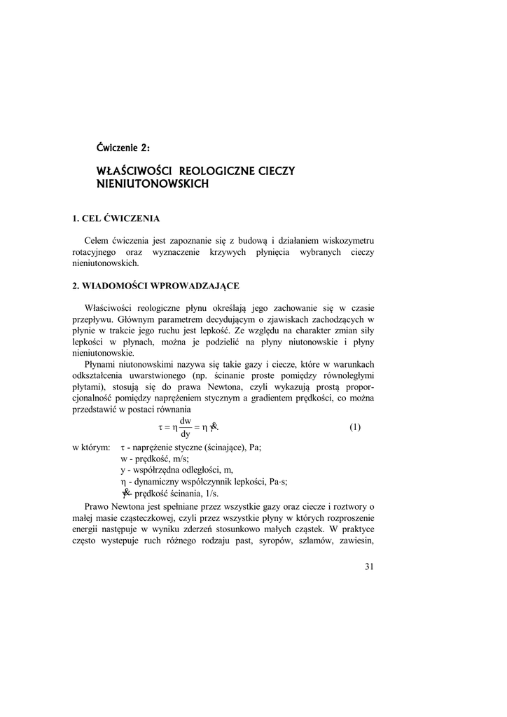 Ćwiczenie 2: WŁAŚCIWOŚCI REOLOGICZNE CIECZY NIENIUTONOWSKICH 1. CEL ĆWICZENIA Celem ćwiczenia jest zapoznanie się z budową i działaniem wiskozymetru rotacyjnego oraz wyznaczenie krzywych płynięcia wybranych cieczy nieniutonowskich. 2. WIADOMOŚCI WPROWADZAJĄCE Właściwości reologiczne płynu określają jego zachowanie się w czasie przepływu. Głównym parametrem decydującym o zjawiskach zachodzących w płynie w trakcie jego ruchu jest lepkość. Ze względu na charakter zmian siły lepkości w płynach, można je podzielić na płyny niutonowskie i płyny nieniutonowskie. Płynami niutonowskimi nazywa się takie gazy i ciecze, które w warunkach odkształcenia uwarstwionego (np. ścinanie proste pomiędzy równoległymi płytami), stosują się do prawa Newtona, czyli wykazują prostą proporcjonalność pomiędzy naprężeniem stycznym a gradientem prędkości, co można przedstawić w postaci równania dw &. (1) dy w którym: - naprężenie styczne (ścinające), Pa; w - prędkość, m/s; y - współrzędna odległości, m, - dynamiczny współczynnik lepkości, Pas; &- prędkość ścinania, 1/s. Prawo Newtona jest spełniane przez wszystkie gazy oraz ciecze i roztwory o małej masie cząsteczkowej, czyli przez wszystkie płyny w których rozproszenie energii następuje w wyniku zderzeń stosunkowo małych cząstek. W praktyce często wystepuje ruch różnego rodzaju past, syropów, szlamów, zawiesin, 31 32 naprężenie styczne, roztworów lub stopów polimerów dla których prawo Newtona nie jest spełnione. Tę właśnie grupę płynów określa się mianem nieniutonowskich. Graficzna zależność naprężenia stycznego od gradientu prędkości (tzw. prędkości ścinania) nosi nazwę krzywej płynięcia. Krzywa płynięcia płynu niutonowskiego jest linią prostą przechodzącą przez początek układu współrzędnych. Nachylenie tej linii, czyli tangens kąta jaki tworzy ona z osią odciętych, równe jest współczynnikowi lepkości dynamicznej płynu. Wszystkie ciecze, których krzywe płynięcia nie są liniami prostymi, zalicza się do cieczy nieniutonowskich. Lepkość cieczy nieniutonowskich, w określonych warun-kach ciśnienia i temperatury, nie jest więc wartością stałą lecz zmienia się w zależności od wielu czynników np. od szybkości ścinania, od kształtu naczynia lub aparatu w którym ciecz jest zawarta, albo też od rodzaju procesu jakiemu uprzednio ją poddawano. Ciecze nieniutonowskie można podzielić na trzy podstawowe typy: Typ I. Ciecze, dla których w dowolnym punkcie szybkość ścinania jest funkcją wyłącznie naprężenia stycznego panującego w danym punkcie. Typ II. Ciecze, dla których zależność pomiędzy naprężeniem stycznym i szybkością ścinania zależy również od czasu lub też sposobu ścinania cieczy. Typ III. Układy przejawiające pewne cechy charakterystyczne zarówno dla ciał stałych jak i dla cieczy, wykazujące częściowy powrót sprężysty po odkształceniu. Są to tzw. ciecze lepkosprężyste. Ciecze zaliczane do typu I, można podzielić na trzy podgrupy: ciecze binghamowskie (liniowo plastyczne), ciecze pseudoplastyczne oraz ciecze wykazujące dilatancję. Ich krzywe płynięcia przedstawiono na rys. 1. 1 2 3 4 o 0 . prędkość ścinania, Rys. 1. Krzywe płynięcia cieczy niutonowskiej i cieczy typu I. 33 1 - ciecz binghamowska, 2 - ciecz pseudoplastyczna, 3 - ciecz niutonowska, 4 - ciecz wykazująca dilatancję. o - granica płynięcia cieczy binghamowskiej (plastycznej) Ciecz binghamowska (plastyczna) Krzywa płynięcia cieczy binghamowskiej ma postać linii prostej, która przecina oś naprężenia stycznego w punkcie o. Minimalna wartość naprężenia stycznego powyżej której następuje płynięcie ciała, nosi nazwę granicy płynięcia. Równanie reologiczne cieczy plastycznej jest następujące o p &; > o (2) gdzie: - naprężenie styczne, Pa; o- granica płynięcia, Pa; p- lepkość plastyczna (współczynnik sztywności), Pas; &- prędkość ścinania, 1/s. Hipoteza wyjaśniająca własności ciał plastycznych zakłada, że w stanie spoczynku mają one strukturę trójwymiarową, której sprężystość jest dostatecznie duża, by oprzeć się każdemu naprężeniu stycznemu, mniejszemu od granicy płynięcia o . Jeśli granica płynięcia zostanie przekroczona, struktura ta ulega zniszczeniu i układ przybiera cechy cieczy niutonowskiej, na którą działa naprężenie - o. Z chwilą, gdy naprężenie styczne jest mniejsze od granicy płynięcia, struktura zostaje ponownie odbudowana. Typowymi przykładami cieczy binghamowskiej (plastycznej) są zawiesiny, szlamy, farby olejne, pasta do zębów, osady odstojnikowe, itp. Ciecz pseudoplastyczna Ciecze pseudoplastyczne nie mają granicy płynięcia, a stosunek naprężenia stycznego do szybkości ścinania zmniejsza się w ich przypadku, w miarę zwiększania się szybkości ścinania. Krzywa płynięcia staje się linią prostą dopiero przy bardzo dużej szybkości ścinania. Logarytmiczny wykres zależności naprężenia stycznego i szybkości ścinania dla cieczy pseudoplastycznej jest często linią prostą o nachyleniu zawierającym się w zakresie od 0 do 1 i dlatego najprostszym matematycznym modelem reologicznym stosowanym do opisu krzywej płynięcia tych cieczy jest tzw. model potęgowy Ostwalda - de Waele k&n gdzie: - naprężenie ścinające, &- prędkość ścinania, k - miara lepkości pozornej, n - miara odchylenia cieczy od cieczy niutonowskiej. (3) 34 Hipoteza wyjaśniająca zachowanie się cieczy pseudoplastycznej zakłada, że w miarę zwiększania szybkości ścinania, asymetryczne cząsteczki podlegają stopniowemu uporządkowaniu. Tak więc zamiast stanu bezładnego ułożenia istniejącego w nieruchomej cieczy, ustalenie przepływu powoduje układanie się dłuższych osi cząsteczek wzdłuż linii płynięcia. Lepkość pozorna zaczyna więc maleć w miarę zwiększania szybkości ścinania, aż do momentu,