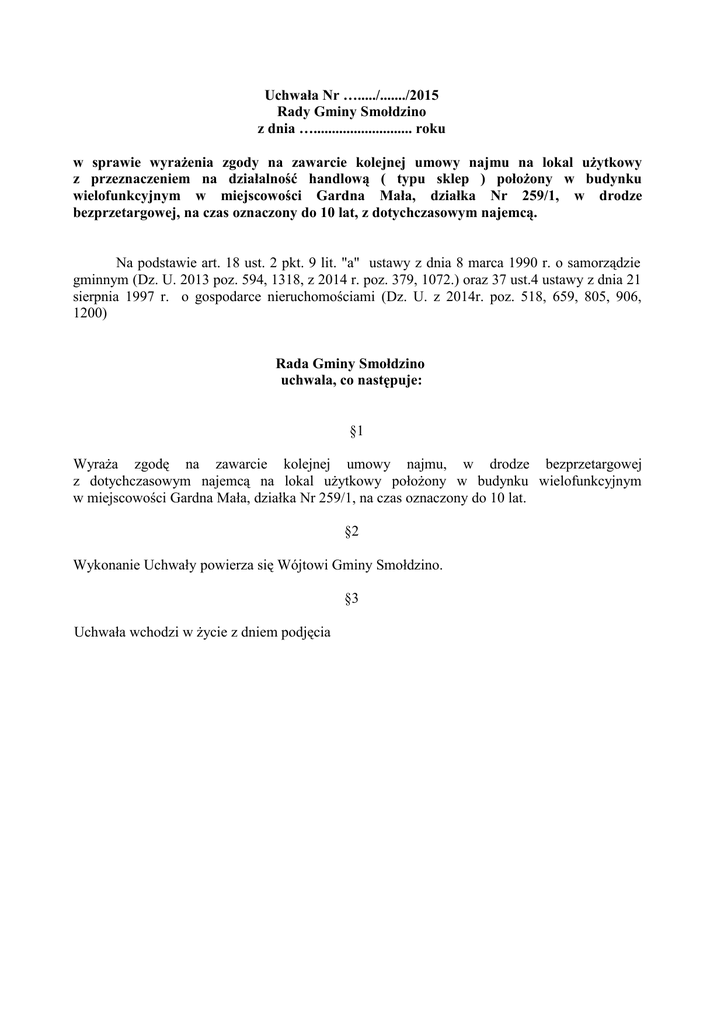 Uchwała Nr …...../......./2015 Rady Gminy Smołdzino z dnia …........................... roku w sprawie wyrażenia zgody na zawarcie kolejnej umowy najmu na lokal użytkowy z przeznaczeniem na działalność handlową ( typu sklep ) położony w budynku wielofunkcyjnym w miejscowości Gardna Mała, działka Nr 259/1, w drodze bezprzetargowej, na czas oznaczony do 10 lat, z dotychczasowym najemcą. Na podstawie art. 18 ust. 2 pkt. 9 lit. "a" ustawy z dnia 8 marca 1990 r. o samorządzie gminnym (Dz. U. 2013 poz. 594, 1318, z 2014 r. poz. 379, 1072.) oraz 37 ust.4 ustawy z dnia 21 sierpnia 1997 r. o gospodarce nieruchomościami (Dz. U. z 2014r. poz. 518, 659, 805, 906, 1200) Rada Gminy Smołdzino uchwala, co następuje: §1 Wyraża zgodę na zawarcie kolejnej umowy najmu, w drodze bezprzetargowej z dotychczasowym najemcą na lokal użytkowy położony w budynku wielofunkcyjnym w miejscowości Gardna Mała, działka Nr 259/1, na czas oznaczony do 10 lat. §2 Wykonanie Uchwały powierza się Wójtowi Gminy Smołdzino. §3 Uchwała wchodzi w życie z dniem podjęcia UZASADNIENIE Piekarnia Ciastkarni „DUET” umowa najmu na lokal użytkowy położony w budynku wielofunkcyjnym w miejscowości Gardna Mała wygasa z dniem 31.01.2015r. O przedłużenie umowy Najemcy zwrócili się do Wójta Gminy, jednak ten wskazał, że kompetencje do przedłużenia umowy ma Rada Gminy. Stosownie do treści art. 18 ust. 2 pkt. 9 "a" po umowie zawartej na czas oznaczony do 3 lat możliwe jest zawarcie umowy między stronami, której przedmiotem jest ta sama nieruchomość za zgodą Rady Gminy. Stan techniczny lokalu jest na dzień dzisiejszy dobry. Najemcy nie mają zaległości z tytułu opłacania czynszu za przedmiotowy lokal. W wynajmowanym lokalu, prowadzą sklep spożywczo-przemysłowy w którym zatrudnienie znajdują osoby z terenu Gminy. Wobec powyższego podjęcie przedmiotowej Uchwały jest uzasadnione.