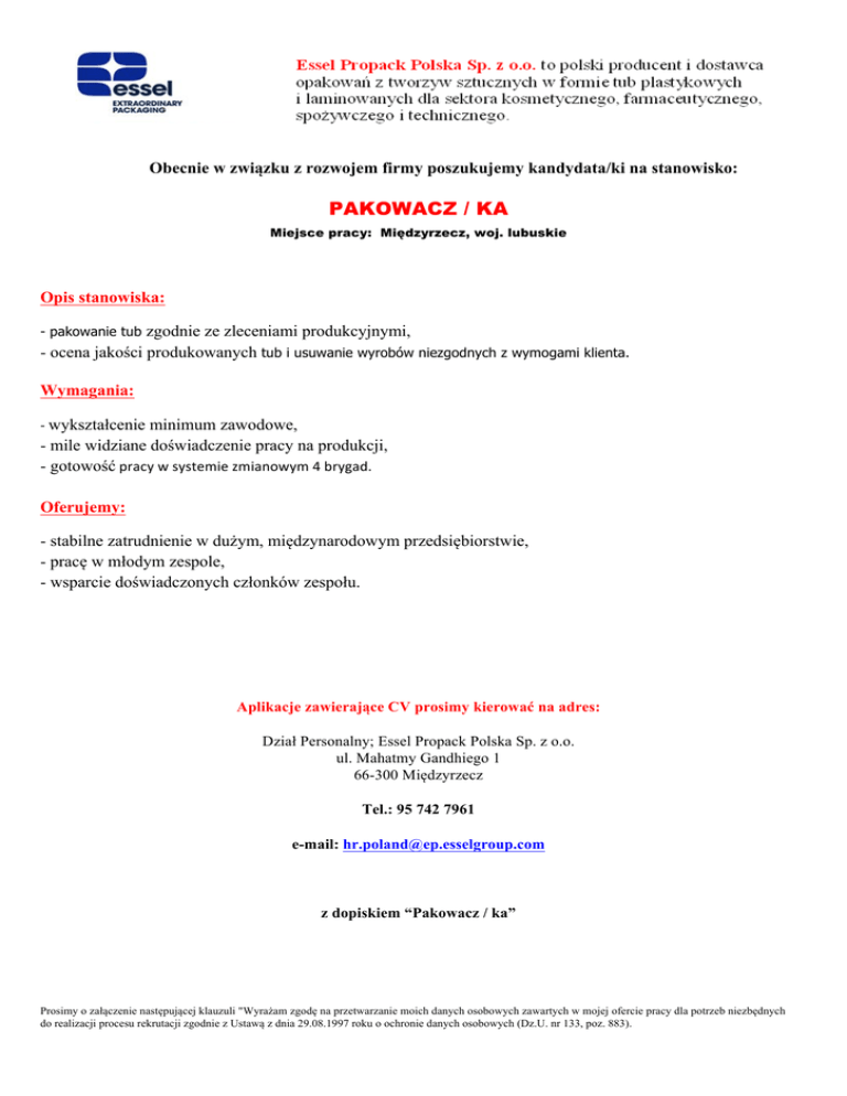 Obecnie w związku z rozwojem firmy poszukujemy kandydata/ki na stanowisko: PAKOWACZ / KA Miejsce pracy: Międzyrzecz, woj. lubuskie Opis stanowiska: zgodnie ze zleceniami produkcyjnymi, - ocena jakości produkowanych tub i usuwanie wyrobów niezgodnych z wymogami klienta. - pakowanie tub Wymagania: -‐ wykształcenie minimum zawodowe, - mile widziane doświadczenie pracy na produkcji, - gotowość pracy w systemie zmianowym 4 brygad. Oferujemy: - stabilne zatrudnienie w dużym, międzynarodowym przedsiębiorstwie, - pracę w młodym zespole, - wsparcie doświadczonych członków zespołu. Aplikacje zawierające CV prosimy kierować na adres: Dział Personalny; Essel Propack Polska Sp. z o.o. ul. Mahatmy Gandhiego 1 66-300 Międzyrzecz Tel.: 95 742 7961 e-mail: [email protected] z dopiskiem “Pakowacz / ka” Prosimy o załączenie następującej klauzuli "Wyrażam zgodę na przetwarzanie moich danych osobowych zawartych w mojej ofercie pracy dla potrzeb niezbędnych do realizacji procesu rekrutacji zgodnie z Ustawą z dnia 29.08.1997 roku o ochronie danych osobowych (Dz.U. nr 133, poz. 883).
