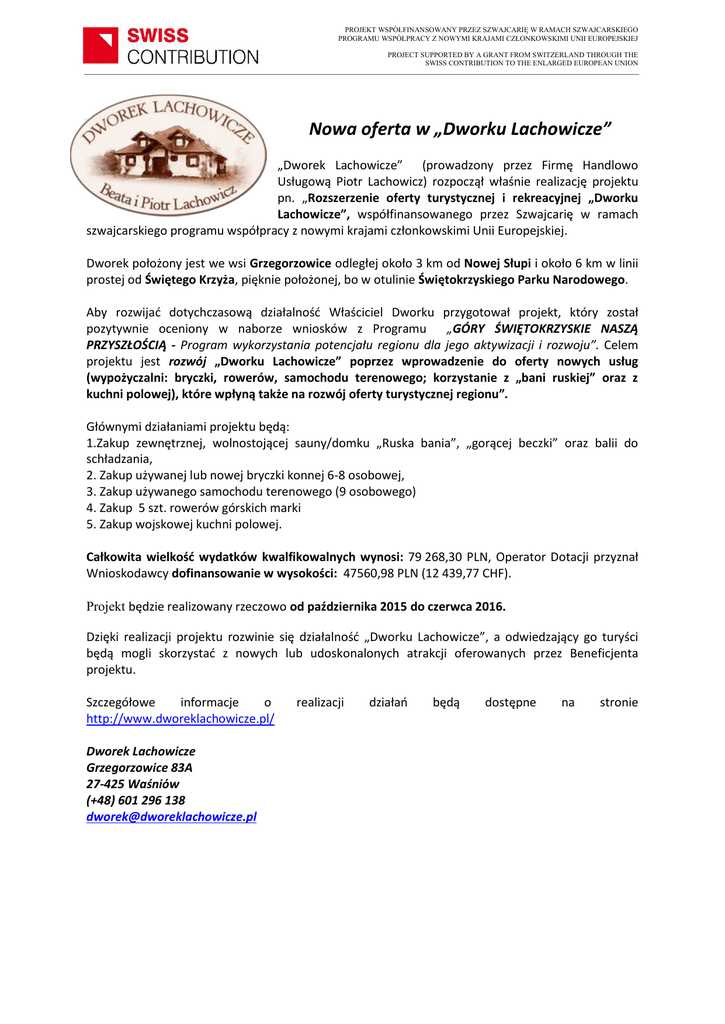 PROJEKT WSPÓŁFINANSOWANY PRZEZ SZWAJCARIĘ W RAMACH SZWAJCARSKIEGO PROGRAMU WSPÓŁPRACY Z NOWYMI KRAJAMI CZŁONKOWSKIMI UNII EUROPEJSKIEJ PROJECT SUPPORTED BY A GRANT FROM SWITZERLAND THROUGH THE SWISS CONTRIBUTION TO THE ENLARGED EUROPEAN UNION Nowa oferta w „Dworku Lachowicze” „Dworek Lachowicze” (prowadzony przez Firmę Handlowo Usługową Piotr Lachowicz) rozpoczął właśnie realizację projektu pn. „Rozszerzenie oferty turystycznej i rekreacyjnej „Dworku Lachowicze”, współfinansowanego przez Szwajcarię w ramach szwajcarskiego programu współpracy z nowymi krajami członkowskimi Unii Europejskiej. Dworek położony jest we wsi Grzegorzowice odległej około 3 km od Nowej Słupi i około 6 km w linii prostej od Świętego Krzyża, pięknie położonej, bo w otulinie Świętokrzyskiego Parku Narodowego. Aby rozwijad dotychczasową działalnośd Właściciel Dworku przygotował projekt, który został pozytywnie oceniony w naborze wniosków z Programu „GÓRY ŚWIĘTOKRZYSKIE NASZĄ PRZYSZŁOŚCIĄ - Program wykorzystania potencjału regionu dla jego aktywizacji i rozwoju”. Celem projektu jest rozwój „Dworku Lachowicze” poprzez wprowadzenie do oferty nowych usług (wypożyczalni: bryczki, rowerów, samochodu terenowego; korzystanie z „bani ruskiej” oraz z kuchni polowej), które wpłyną także na rozwój oferty turystycznej regionu”. Głównymi działaniami projektu będą: 1.Zakup zewnętrznej, wolnostojącej sauny/domku „Ruska bania”, „gorącej beczki” oraz balii do schładzania, 2. Zakup używanej lub nowej bryczki konnej 6-8 osobowej, 3. Zakup używanego samochodu terenowego (9 osobowego) 4. Zakup 5 szt. rowerów górskich marki 5. Zakup wojskowej kuchni polowej. Całkowita wielkośd wydatków kwalfikowalnych wynosi: 79 268,30 PLN, Operator Dotacji przyznał Wnioskodawcy dofinansowanie w wysokości: 47560,98 PLN (12 439,77 CHF). Projekt będzie realizowany rzeczowo od października 2015 do czerwca 2016. Dzięki realizacji projektu rozwinie się działalnośd „Dworku Lachowicze”, a odwiedzający go turyści będą mogli skorzystad z nowych lub udoskonalonych atrakcji oferowanych przez Beneficjenta projektu. Szczegółowe informacje o http://www.dworeklachowicze.pl/ Dworek Lachowicze Grzegorzowice 83A 27-425 Waśniów (+48) 601 296 138 [email protected] realizacji działao będą dostępne na stronie