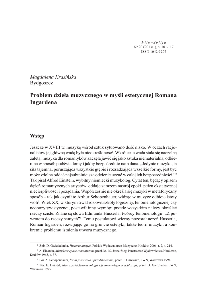 Filo–Sofija Nr 20 (2013/1), s. 101-117 ISSN 1642-3267 Magdalena Krasińska Bydgoszcz Problem dzieła muzycznego w myśli estetycznej Romana Ingardena Wstęp Jeszcze w XVIII w. muzykę wśród sztuk sytuowano dość nisko. W oczach racjonalistów jej główną wadą była nieokreśloność1. Wkrótce ta wada stała się naczelną zaletą: muzyka dla romantyków zaczęła jawić się jako sztuka niematerialna, odbierana w sposób podświadomy i jakby bezpośrednio nam dana. „Jedynie muzyka, ta siła tajemna, poruszająca wszystkie głębie i rozsadzająca wszelkie formy, jest być może zdolna oddać najsubtelniejsze odcienie uczuć w całej ich bezpośredniości.”2 Tak pisał Alfred Einstein, wybitny niemiecki muzykolog. Cytat ten, będący opisem dążeń romantycznych artystów, oddaje zarazem nastrój epoki, pełen ekstatycznej niecierpliwości i pożądania. Współcześnie nie określa się muzyki w metaforyczny sposób – tak jak czynił to Arthur Schopenhauer, widząc w muzyce odbicie istoty woli3. Wiek XX, w którym trwał rozkwit szkoły logicznej, fenomenologicznej czy neopozytywistycznej, postawił inny wymóg: przede wszystkim należy określać rzeczy ściśle. Znane są słowa Edmunda Husserla, twórcy fenomenologii: „Z powrotem do rzeczy samych”4. Temu postulatowi wierny pozostał uczeń Husserla, Roman Ingarden, rozwijając go na gruncie estetyki, także teorii muzyki, a konkretnie problemu istnienia utworu muzycznego. 1 Zob. D. Gwizdalanka, Historia muzyki, Polskie Wydawnictwo Muzyczne, Kraków 2006, t. 2, s. 214. A. Einstein, Muzyka w epoce romantyzmu, przeł. M. i S. Jarocińscy, Państwowe Wydawnictwo Naukowe, Kraków 1965, s. 37. 2 3 Por. A. Schopenhauer, Świat jako wola i przedstawienie, przeł. J. Garewicz, PWN, Warszawa 1994. Por. E. Husserl, Idee czystej fenomenologii i fenomenologicznej filozofii, przeł. D. Gierulanka, PWN, Warszawa 1975. 4 102 MAGDALENA KRASIŃSKA O dziełach sztuki muzycznej wydajemy sądy: czy są piękne, czy brzydkie, czy są wartościowe, czy też nie. Są to nasze indywidualne oceny, mają one podłoże subiektywne. Jeśli analizujemy utwór muzyczny pod względem budowy, schematu konstrukcyjnego, itd., stwierdzamy pewne fakty: przykładowo, że architektonika danego utworu dalece wykracza poza rozpowszechniony model lub że twórca nie zastosował żadnych środków, by jego dzieło nie było konwencjonalne, nudne. Nie stawiamy sobie natomiast pytań o istotę dzieła muzycznego, czym ono w ogóle jest i w jaki sposób istnieje. W przypadku dzieła malarskiego nie ma takiego problemu, bowiem można powołać się na oryginał, pokazać go, dotknąć i powiedzieć: oto obraz, mamy go przed sobą, jest tu i nigdzie indziej. Nie znaczy to, że dzieło malarskie nie zasługuje na to, by rozważać jego istotę. Jednakże na tzw. pierwszy rzut oka sprawa jego istnienia wydaje się zupełnie wyjaśniona, w przeciwieństwie do dzieła muzycznego. Czy można bowiem wskazać, gdzie ono się znajduje? Cóż takiego stanowi jego oryginał? Czy dźwięki, jakie rozgrywają się w sali koncertowej, to właśnie jest to dzieło? Wydawałoby się, że właśnie tak jest. Przecież muzyki się słucha, a nie ogląda. A jeżeli to nie odbierane przez nas dźwięki są dziełem muzycznym, to może będzie nim jego zapis nutowy? Lecz co wtedy z utworami należącymi do folkloru czy muzyki arabskiej, hinduskiej – które takich zapisów nie mają? Wróćmy zatem do tezy, że dzieło muzyczne jest tożsame z rozgrywanymi dźwiękami. Musimy jednak wziąć pod uwagę, że jedno i to samo dzieło, np. V Symfonia Beethovena, może być wykonywana w tym samym czasie w różnych salach koncertowych: w Londynie, Paryżu i Warszawie. Czy wtedy znajduje się ta symfonia jednocześnie w trzech różnych miastach, oddalonych od siebie o setki kilometrów? A jeśli w tej chwili nie jest wykonywana nigdzie, to jej nie ma, a jedynie aktualizuje swoje istnienie w momencie, gdy znów jakaś orkiestra zacznie ją grać? A może też istnieje zupełnie niezależnie od tego, czy ktoś ją wykonuje, czy nie? Być może dzieło muzyczne to nie to samo, co jego odegranie ani też nie to samo, co jego zapis nutowy? Czym wtedy właściwie jest i w jaki sposób istnieje? Można by zadać jeszcze cały szereg pytań w tej sprawie, ale już widać, że jest ona dość skomplikowana. Roman Ingarden podjął trud finalnego ustalenia, co stanowi dzieło muzyczne, z jakich składa się elementów i jaki jest jego ontologiczny charakter. Zrobił to w odniesieniu do estetyki fenomenologicznej, której był gorącym zwolennikiem i której do dziś pozostaje najznakomitszym reprezentantem. Ingarden przeciwstawił estetykę fenomenologiczną tzw. estetyce „subiektywnej” i „obiektywnej”. Tej opartej na dychotomii estetyce zarzucił jednostronność i brak wewnętrznej spójności. Estetyka fenomenologiczna zdaje się być tych wad pozbawiona, ponieważ precyzuje podstawowe pojęcia. Podczas gdy inne nauki operują gotowymi założeniami, metoda fenomenologiczna za pomocą analizy ejdetycznej dąży do bezpośredniego poznania apriorycznego danego przedmiotu, dotarcia do jego istoty i wykrycia związków koniecznych zawartych w idei5. 5 Zob. M. Gołaszewska, Zarys estetyki, PWN, Warszawa 1984, s. 58-59. PROBLEM DZIEŁA MUZYCZNEGO W MYŚLI ESTETYCZNEJ ROMANA INGARDENA 103 Sama estetyka Ingardena, w obrębie której znajdują się rozważania dotyczące istoty dzieła muzycznego oraz innych dzieł sztuki, jest na tyle bogata, że można by poświęcić jej niejedną rozprawę. Prócz prac Ingardena o różnych typach dzieł sztuki znajdziemy rozważania dotyczące estetyki jako dziedziny filozoficznej i jej interdyscyplinarnego charakteru oraz postulatów estetyki fenomenologicznej i jej metodologii. Celem niniejszego artykułu jest przedstawienie w zarysie teorii Romana Ingardena o dziele muzycznym jako przedmiocie czysto intencjonalnym, której główna część zawarta jes