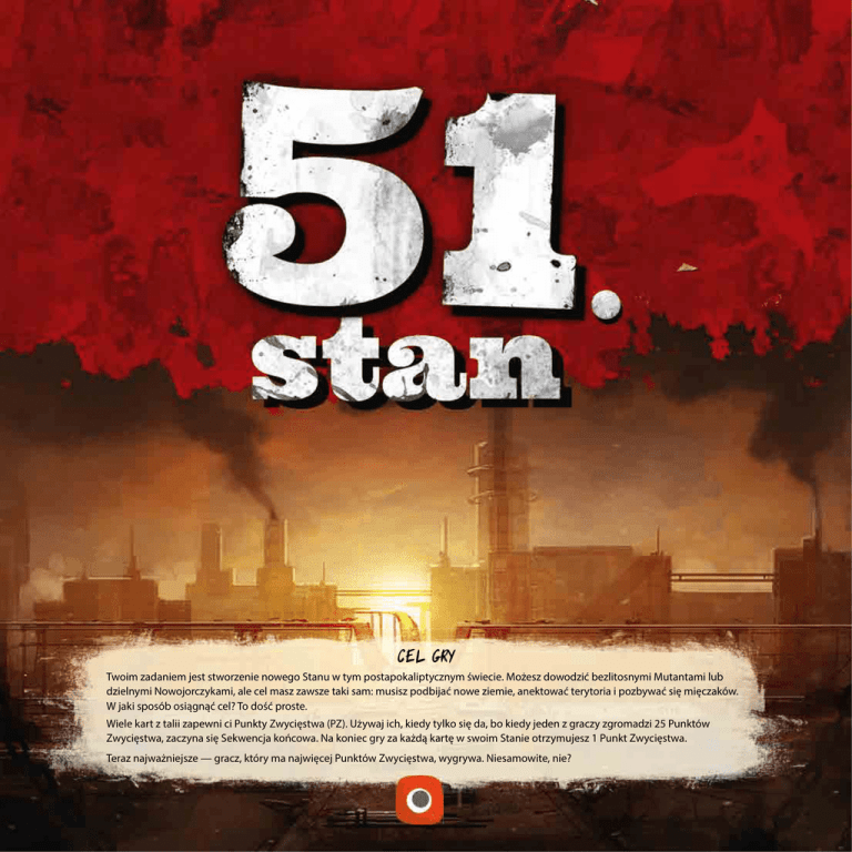 CEL GRY Twoim zadaniem jest stworzenie nowego Stanu w tym postapokaliptycznym świecie. Możesz dowodzić bezlitosnymi Mutantami lub dzielnymi Nowojorczykami, ale cel masz zawsze taki sam: musisz podbijać nowe ziemie, anektować terytoria i pozbywać się mięczaków. W jaki sposób osiągnąć cel? To dość proste. Wiele kart z talii zapewni ci Punkty Zwycięstwa (PZ). Używaj ich, kiedy tylko się da, bo kiedy jeden z graczy zgromadzi 25 Punktów Zwycięstwa, zaczyna się Sekwencja końcowa. Na koniec gry za każdą kartę w swoim Stanie otrzymujesz 1 Punkt Zwycięstwa. Teraz najważniejsze — gracz, który ma najwięcej Punktów Zwycięstwa, wygrywa. Niesamowite, nie? ZAWARTOŚĆ PUDEŁKA 1 TOR PUNKTÓW ZWYCIĘSTWA 200 KART (63X88) 88 KART 51. STANU 4 ŻETONY PUNKTACJI 1 ŻETON PIERWSZEGO GRACZA 12 KART POŁĄCZEŃ PRZÓD (6 KART KAŻDEGO KOLORU) TYŁ 50 KART Z ROZSZERZENIA NOWA ERA PRZÓD TYŁ 4 PLANSZE FRAKCJI 50 KART Z ROZSZERZENIA ZIMA PRZÓD TYŁ PRZÓD 2 TYŁ ZAWARTOŚĆ PUDEŁKA ZNACZNIKI I ŻETONY ZASOBÓW 30 MIN. DREWNIANYCH ZNACZNIKÓW BUDULCA 30 DREWNIANYCH MIN. ZNACZNIKÓW PALIWA 38 30 DREWNIANYCH MIN. ZNACZNIKÓW BRONI 30 DREWNIANYCH MIN. ZNACZNIKÓW ŻELAZA MIN. DREWNIANYCH ZNACZNIKÓW ROBOTNIKÓW 10 ŻETONÓW TARCZY 13 ZNACZNIKÓW NABOI 9 ŻETONÓW PRZEBUDOWY 20 CZERWONYCH 20 NIEBIESKICH ŻETONÓW KONTAKTU ŻETONÓW KONTAKTU 30 SZARYCH 7 UNIWERSALNYCH ŻETONÓW KONTAKTU ŻETONÓW KONTAKTU 4 ŻETONY MNOŻENIA INSTRUKCJA 3 CO ZNAJDUJE SIĘ NA KARCIE? ANATOMIA KARTY ŁUPY. Zasoby, które otrzymasz po Splądrowaniu tej Lokacji. DYSTANS do Lokacji. Czyli, jak daleko musisz targać dupsko, aby cokolwiek zrobić z tą kartą. Domyśl się… TYP Lokacji. Jest to ważne, gdy Przebudowujesz tę Lokację, aby stworzyć nową, lepszą Lokację. Zdolność karty. KATEGORIA (Produkcja, Cecha lub Akcja) UMOWA. Zasoby, które otrzymasz po podpisaniu Umowy z tą Lokacją. Ten symbol informuje, czy karta pochodzi z zestawu podstawowego 51. Stanu czy z rozszerzenia. Tak, staramy się dla ciebie, bo cię uwielbiamy. IKONY ZASOBÓW PALIWO ŻELAZO BROŃ czyli Surowce podstawowe. BUDULEC NABOJE to Surowce uniwersalne, które zastępują dowolne z czterech Surowców podstawowych. Za Akcje wymagające opłaty określonymi Surowcami podstawowymi można płacić Nabojami, ale Surowców podstawowych nie można używać, gdy wymagana jest płatność Nabojami. 4 , ROBOTNIK Żeton OBRONY KARTA PUNKT ZWYCIĘSTWA , Żetony KONTAKTU UNIWERSALNY żeton KONTAKTU. Jeśli chcesz użyć żetonu Kontaktu, to możesz wykorzystać żeton Uniwersalny jako zamiennik jednego z trzech podstawowych żetonów Kontaktu. Żeton PRZEBUDOWY INNE IKONY LOKACJA , , , itd. ikony Typu LOKACJI ZARZĄDZANIE LOKACJAMI ZARZĄDZANIE LOKACJAMI Po tej ilustracji już widzisz, że będziesz budować wiele Lokacji! Aby ci się nimi łatwiej zarządzało (wcale nie umniejszam twojej inteligencji), to Lokacje podzieliłem na trzy kategorie: Produkcyjne, z Cechą i z Akcją. Lokacje układaj obok siebie w rzędach wg kategorii i się nie pogubisz. Lokacje Produkcyjne ustaw w górnym rzędzie, Lokacje z Cechami — po środku, a Lokacje z Akcjami — na dole. No i super. Jeszcze jedno! Jeśli z jakąś Lokacją podpiszesz Umowę, to tę Lokację wsuń pod planszę Frakcji tak, aby wystawała tylko jej niebieska część dotycząca Umowy. Patrz na ilustrację! 5 ZASADY GRY ZASADY PODSTAWOWE ZASADY GRY 3 RODZAJE INTERAKCJI Z KARTAMI LOKACJI PRZEBIEG TURY Wszystkie karty w grze odzwierciedlają Lokacje ze świata Neuroshimy. Tura składa się tylko z 4 faz, więc ciężko się w tym pogubić (bez urazy oczywiście). 1. Wypatrywanie Lokację możesz Wybudować. Połóż kartę przed sobą i w każdej 2. Produkcja turze będziesz mógł użyć Zdolności. Więcej wybudowanych Lokacji to więcej Zdolności zwiększających twoją potęgę. Nieźle, nie? Lokację możesz Splądrować. Odrzuć kartę z ręki i pobierz Zasoby widoczne w polu Łupy. Splądrowana Lokacja jest całkowicie niszczona, a Ty zabierasz wszystko, co znajdziesz. Takie życie. 3. Akcja 4. Czyszczenie 1. FAZA WYPATRYWANIA • Odkryj pierwszą kartę z obydwu talii kart Połączeń. Umieść ją na wierzchu talii albo obok niej — jak wolisz. Z Lokacją możesz podpisać Umowę. Jeśli podpisujesz Umowę, to wsuń kartę Lokacji pod swoją planszę Frakcji tak, aby wystawała tylko jej niebieska część dotycząca Umowy. Taka Lokacja jest teraz częścią twojego Stanu i nie możesz korzystać już z jej Zdolności. Jednak zapewnia Ci ona Zasoby przedstawione w części karty dotyczącej Umowy. Nie narzekam, ale właśnie tak się to kończy, kiedy chcesz być uprzejmy i nie Plądrujesz Lokacji. Plądruj. Zawsze plądruj! Wszystkich! • Z talii podstawowej odkryj tyle kart, ilu graczy bierze udział w grze plus 1, (czyli przy 3 graczach odkrywasz 4 karty) i połóż je odkryte pośrodku obszaru gry. Pierwszy gracz wybiera jedną z odkrytych kart i dokłada do swoich kart na ręce, następnie kolejni gracze zgodnie z ruchem wskazówek zegara zabierają po jednej karcie. Ostatnia karta jest odkładana odkryta na stos kart odrzuconych. • Ponownie z talii podstawowej odkryj tyle kart, ilu graczy bierze udział w grze plus 1, i połóż je odkryte pośrodku obszaru gry. Jednak teraz ostatni gracz jako pierwszy wybiera kartę, a następne karty są pobierane przez graczy w kolejności odwrotnej do ruchu wskazówek zegara. Ostatnia pozostała karta ponownie jest odrzucana na stos kart odrzuconych. DZIAŁANIA W LOKACJI ZA POMOCĄ ŻETONÓW KONTAKTU Budowanie, Plądrowanie i podpisywanie Umów wymaga użycia żetonów Kontaktu. Żetony te pozwalają na interakcję z Lokacjami. Niebieskie żetony Kontaktu to kupcy, którzy podpisują Umowy. Szare żetony Kontaktu to umiejętności budowlane pozwalające Budować Lokacje. Czerwone żetony Kontaktu to gangi, mutanci i najemnicy, którzy Plądrują Lokacje. Same fajne żetony, ale pamiętaj, że do Najeżdżania potrzebujesz cze