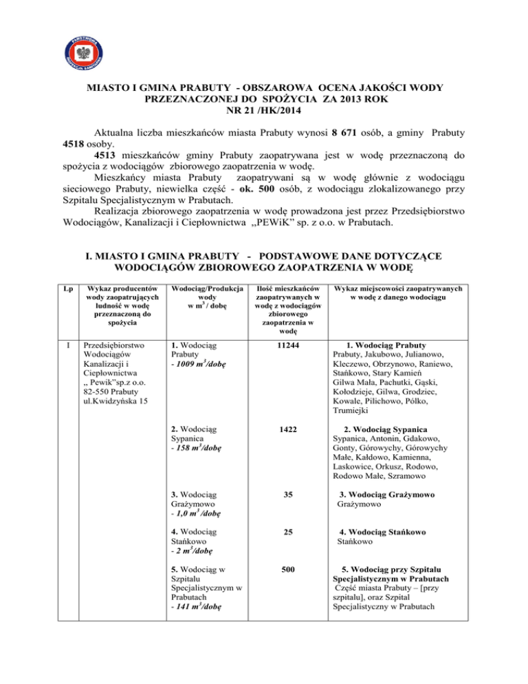 MIASTO I GMINA PRABUTY - OBSZAROWA OCENA JAKOŚCI WODY PRZEZNACZONEJ DO SPOŻYCIA ZA 2013 ROK NR 21 /HK/2014 Aktualna liczba mieszkańców miasta Prabuty wynosi 8 671 osób, a gminy Prabuty 4518 osoby. 4513 mieszkańców gminy Prabuty zaopatrywana jest w wodę przeznaczoną do spożycia z wodociągów zbiorowego zaopatrzenia w wodę. Mieszkańcy miasta Prabuty zaopatrywani są w wodę głównie z wodociągu sieciowego Prabuty, niewielka część - ok. 500 osób, z wodociągu zlokalizowanego przy Szpitalu Specjalistycznym w Prabutach. Realizacja zbiorowego zaopatrzenia w wodę prowadzona jest przez Przedsiębiorstwo Wodociągów, Kanalizacji i Ciepłownictwa ,,PEWiK” sp. z o.o. w Prabutach. I. MIASTO I GMINA PRABUTY - PODSTAWOWE DANE DOTYCZĄCE WODOCIĄGÓW ZBIOROWEGO ZAOPATRZENIA W WODĘ Lp I Wykaz producentów wody zaopatrujących ludność w wodę przeznaczoną do spożycia Przedsiębiorstwo Wodociągów Kanalizacji i Ciepłownictwa ,, Pewik”sp.z o.o. 82-550 Prabuty ul.Kwidzyńska 15 Wodociąg/Produkcja wody w m3 / dobę Ilość mieszkańców zaopatrywanych w wodę z wodociągów zbiorowego zaopatrzenia w wodę Wykaz miejscowości zaopatrywanych w wodę z danego wodociągu 1. Wodociąg Prabuty - 1009 m3/dobę 11244 1. Wodociąg Prabuty Prabuty, Jakubowo, Julianowo, Kleczewo, Obrzynowo, Raniewo, Stańkowo, Stary Kamień Gilwa Mała, Pachutki, Gąski, Kołodzieje, Gilwa, Grodziec, Kowale, Pilichowo, Pólko, Trumiejki 2. Wodociąg Sypanica - 158 m3/dobę 1422 2. Wodociąg Sypanica Sypanica, Antonin, Gdakowo, Gonty, Górowychy, Górowychy Małe, Kałdowo, Kamienna, Laskowice, Orkusz, Rodowo, Rodowo Małe, Szramowo 3. Wodociąg Grażymowo - 1,0 m3 /dobę 35 3. Wodociąg Grażymowo Grażymowo 4. Wodociąg Stańkowo - 2 m3/dobę 25 4. Wodociąg Stańkowo Stańkowo 5. Wodociąg w Szpitalu Specjalistycznym w Prabutach - 141 m3/dobę 500 5. Wodociąg przy Szpitalu Specjalistycznym w Prabutach Część miasta Prabuty – [przy szpitalu], oraz Szpital Specjalistyczny w Prabutach II. GMINA PRABUTY - PODSTAWOWE INFORMACJE DOTYCZĄCE JAKOŚCI WODY Badania jakości wody prowadzone były zarówno przez Państwową Inspekcję Sanitarną jak i przez PWKiC ,,PEWiK” w Prabutach i ECO Malbork sp. z o.o. - w ramach obowiązkowej kontroli wewnętrznej. Wodę o dobrej - odpowiadającej wymaganiom jakości produkowało - 5 wodociągów wodę o jakości niezgodnej z wymaganiami - 0 wodociągów Z punktów poboru wody zlokalizowanych na terenie miasta i gminy Prabuty, w ramach nadzoru sanitarnego prowadzonego przez Państwowego Powiatowego Inspektora Sanitarnego w Kwidzynie, pobrano do badań w 2013 roku 43 prób wody. Liczba prób nie odpowiadających wymaganiom wynosiła 2. Wodociągi zbiorowego zaopatrzenia w wodę - 2013 rok 50 43 40 30 20 10 2 0 Liczba prób zbadanych ogółem Liczba prób zdyskwalifikowanych Parametry oznaczone w wodzie przeznaczonej do spożycia w 2013 roku na terenie miasta i gminy Prabuty: Bakterie grupy coli, Eschericha coli, Enterokoki, Ogólna liczba mikroorganizmów w 22oC±2 po 72 h, Ogólna liczba mikroorganizmów w 36oC±2 po 48 h, Clostridium perfringens (łącznie ze sporami), Barwa, Mętność, pH, Przewodność właściwa, Zapach, Smak, Amonowy jon, Azotyny, Azotany, Glin, Mangan, Żelazo, Antymon, Arsen, Benzen, Benzo(a)piren, Bor, Chlorek winylu, Chrom, Cyjanki, 1,2-dichloroetan, Fluorki, Kadm, Nikiel, Ołów, Rtęć, Selen, ∑ trichloroetenu i tetrachloroetenu, ∑ THM, ∑ Wielopierścieniowych węglowodorów aromatycznych, Chlorki, Twardość, Siarczany, Sód, Utlenialność z KMnO 4 , Bromiany, Chloroform, Dibromochlorometan, Dichlorobromometan, Tribromometan, Czterochlorek węgla, Trichloroetan, Tetrachloroetan, Fluoranten, Benzo(b)fluoranten, Benzo(ghi)terylen, Benzo(k)fluoranten, Ideno(123-cd)piren, ∑ pestycydów, Pestycydy (*α-HCH, β-HCH, heptachlor, γ-HCH, δ-HCH, aldryna, α-endosulfan, β-endosulfan, dieldryna, endryna, pp'DDD, pp'DDE, pp'DDT, pp’DMDT, heptachlor epoksyd, heksachlorobenzen, fenitrotion, malation, chlorfenvinfos, HCB, DDE, DDT, DDD, aldehyd endryny, siarczan endosulfanu, metoksychlor, Σ benomylu i karbendazymu, tiabendazol, diazynon, disulfoton, chlorpiryfos metylowy, pirymifos metylowy, paration metylowy, pirymyfos etylowy, paration etylowy, tolilofluanid). Nieprawidłowości stwierdzono w zakresie 1 parametru: bakterie gr. coli J akoś ć wody - oz nac z ane parametry 1 L ic z ba parametrów oz nac z onyc h w próbac h wody L ic z ba parametrów z dys kwalifikowanyc h w próbac h wody 90 Charakterystykę jakości wody produkowanej przez poszczególne wodociągi na terenie miasta i gminy Prabuty oraz ich końcową ocenę za cały 2013 rok przedstawia poniższa tabela: Nazwa wodociągu Wodociąg Prabuty Ocena końcowa jakości wody za rok 2013 Woda dobra: Bakteriologia – dobra Fizykochemia – dobra Parametry nie odpowiadające wymaganiom Postępowanie administracyjne prowadzone przez PPIS Działania naprawcze prowadzone przez przedsiębiorstwa wodociągowe Wodociąg Sypanica Wodociąg Grażymowo Wodociąg Stańkowo Wodociąg przy Szpitalu Specjalistycznym w Prabutach Woda dobra: Bakteriologia – dobra Fizykochemia – dobra Woda dobra: Bakteriologia – dobra Fizykochemia – dobra Woda dobra: Bakteriologia – dobra Fizykochemia – dobra Woda dobra: Bakteriologia – dobra Fizykochemia – dobra Z dniem 25 września 2013r. wodociąg Szpitala Specjalistycznego w Prabutach został wyłączony z eksploatacji a wszystkie obiekty zaopatrywane w wodę z tego wodociągu podłączone zostały do wodociągu sieciowego Prabuty.