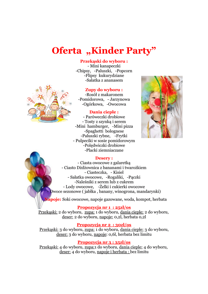 Oferta „Kinder Party” Przekąski do wyboru : - Mini kanapeczki -Chipsy, -Paluszki, -Popcorn -Flipsy kukurydziane -Sałatka z ananasem Zupy do wyboru : -Rosół z makaronem -Pomidorowa, - Jarzynowa -Ogórkowa, -Owocowa Dania ciepłe : - Paróweczki drobiowe - Tosty z szynką i serem -Mini hamburger, -Mini pizza -Spaghetti bolognese -Paluszki rybne, -Frytki - Pulpeciki w sosie pomidorowym -Polędwiczki drobiowe -Placki ziemniaczane Desery : - Ciasta owocowe z galaretką - Ciasto Dżdżownica z bananami i twarożkiem - Ciasteczka, - Kisiel - Sałatka owocowe, -Rogaliki, -Pączki -Naleśniki z serem lub z cukrem - Lody owocowe, -Żelki i cukierki owocowe - Owoce sezonowe ( jabłka , banany, winogrona, mandarynki) Napoje: Soki owocowe, napoje gazowane, woda, kompot, herbata Propozycja nr 1 : 25zł/os Przekąski: 2 do wyboru, zupa: 1 do wyboru, dania ciepłe: 2 do wyboru, deser: 2 do wyboru, napoje: 0,2l, herbata 0,2l Propozycja nr 2 : 30zł/os Przekąski: 3 do wyboru, zupa: 1 do wyboru, dania ciepłe: 3 do wyboru, deser: 3 do wyboru, napoje: 0,6l, herbata bez limitu Propozycja nr 3 : 35zł/os Przekąski: 4 do wyboru, zupa:1 do wyboru, dania cieple: 4 do wyboru, deser: 4 do wyboru, napoje i herbata : bez limitu Tort urodzinowy dla 8 osób – 40zł, ( istnieje możliwość przyniesienia własnego tortu) Do każdej propozycji : Plac zabaw na wyłączność – gratis! Zestawy dla Rodziców: 1 . Ciastko z Napojem+ ( Kawa, Herbata bez limitu) – 15zł 2. Danie dnia z Napojem +( Kawa, Herbata bez limitu)- 20zł 3. Danie dnia, Deser,Napój +( Kawa, Herbata bez limitu) -25zł 4 . Zupa, Danie dnia, Deser,Napój +( Kawa, Herbata bez limitu) -30zł 5 Skomponuj swój własny zestaw otrzymasz – 15% rabatu od cen z menu Dodatkowe atrakcje: ANIMATOR, czyli zabawy z różnymi atrakcjami do której animator zaprasza dzieci i na które składa się np. zabawa zapoznawcza, limbo, kolorowe zabawy z chustą animacyjną, dziecięce szczudła kubkowe, wirujące talerze, zabawa z kolorowymi kapeluszami, pokaz ogromnych baniek mydlanych robiony przez animatora i tysiące małych baniek wypuszczanych z wytwornicy, frisbee z planszą celnościową XL itp. Koszt takiego programu to: 1 godz.- 250zł, 2 godz. – 350zł, 3 godz. – 450zł ATRAKCJE INNEGO RODZAJU, gdzie dana atrakcja jest dostępna stale przez godzinę lub dłużej, np.: - opiekunka na placu zabaw – 50zł/ godz. - robienie wielkich baniek mydlanych przez dzieci przy pomocy różnych sznurów i z użyciem profesjonalnego płynu do duzych baniek marki Tuban - 150zl/godz. - balonowe kreacje, czyli zwierzątka i inne rzeczy z balonów modelinowych- 120zł/ godz. - mini dmuchaniec-usmiechaniec - 130zł/godz. - wielokolorowa i wielosmakowa wata cukrowa wydawana bez limitu porcji - 150zł/godz. - wizyta chodzacej maskotki, która przywita się z dziećmi, bedzie pozować do zdjęć, może rozdać cukierki, czy zatańczyć w kółeczku - 100zł za wizytę do 30 minut - malowanie twarzy - 120zł/1godz. - rozbijanie pinaty – hit każdej zabawy- wewnątrz slodkości, konfetti i serpentynyPinata standard- 150zł, pinata gigant (1,1m) 350zł Jesli masz inne specjalne pomysły na zabawy dla dzieci, również jesteśmy w stanie je zorganizować! Mamo, Tato wypraw wspaniałe przyjęcie dla swojego dziecka w Gościńcu Konopielka!!! Ceny mogą ulec zmianie w zależności od ilości atrakcji, czasu ich trwania i liczby uczestników.