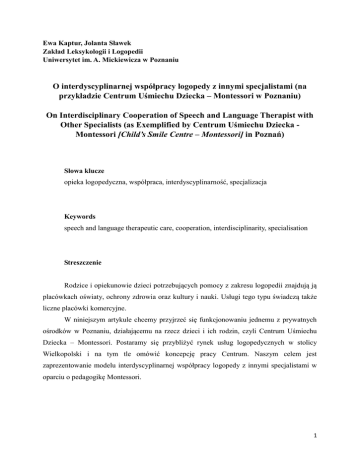 Ewa Kaptur, Jolanta Sławek Zakład Leksykologii i Logopedii Uniwersytet im. A. Mickiewicza w Poznaniu O interdyscyplinarnej współpracy logopedy z innymi specjalistami (na przykładzie Centrum Uśmiechu Dziecka – Montessori w Poznaniu) On Interdisciplinary Cooperation of Speech and Language Therapist with Other Specialists (as Exemplified by Centrum Uśmiechu Dziecka Montessori [Child’s Smile Centre – Montessori] in Poznań) Słowa klucze opieka logopedyczna, współpraca, interdyscyplinarność, specjalizacja Keywords speech and language therapeutic care, cooperation, interdisciplinarity, specialisation Streszczenie Rodzice i opiekunowie dzieci potrzebujących pomocy z zakresu logopedii znajdują ją placówkach oświaty, ochrony zdrowia oraz kultury i nauki. Usługi tego typu świadczą także liczne placówki komercyjne. W niniejszym artykule chcemy przyjrzeć się funkcjonowaniu jednemu z prywatnych ośrodków w Poznaniu, działającemu na rzecz dzieci i ich rodzin, czyli Centrum Uśmiechu Dziecka – Montessori. Postaramy się przybliżyć rynek usług logopedycznych w stolicy Wielkopolski i na tym tle omówić koncepcję pracy Centrum. Naszym celem jest zaprezentowanie modelu interdyscyplinarnej współpracy logopedy z innymi specjalistami w oparciu o pedagogikę Montessori. 1 Summary Parents and guardians of children in need of help in the area of the speech and language therapy find it in educational, healthcare and cultural and science facilities. Services of this type are also provided by numerous commercial centres. In this article, we want to look into the operation of one of the private centres in Poznań, that is, Centrum Uśmiechu Dziecka – Montessori [Child’s Smile Centre Montessori], which works for the benefit of children and their families. We will attempt to show the market of speech and language therapy services in the capital of the region of Wielkopolska and use it as a background for discussing the concept by which the Centre works. Our objective is to present a model of interdisciplinary cooperation of a speech and language therapist with other specialists based on the Montessori pedagogy. Wstęp Rodzice i opiekunowie dzieci potrzebujących pomocy z zakresu logopedii znajdują ją w placówkach oświaty (głównie przedszkola i szkoły, rzadziej żłobki), ochrony zdrowia (szpitale – oddział neonatologii, przychodnie, poradnie, prywatne gabinety działające przy przychodniach), kultury i nauki (np. domy kultury) czy w prywatnych gabinetach logopedycznych. Rodzice młodszych dzieci mogą szukać pomocy w placówkach wczesnego wspomagania rozwoju, które w swej ofercie mają konsultacje i terapie prowadzone przez zespół specjalistów przygotowanych do pracy z małymi dziećmi o zaburzonym rozwoju psychoruchowym. W prawie każdym większym mieście w Polsce działają ośrodki (punkty) wczesnej interwencji monitorowane przez Polskie Stowarzyszenie na Rzecz Osób z Upośledzeniem Umysłowym. Obecnie Stowarzyszenie prowadzi 29 ośrodków w Polsce dla ponad 11 000 dzieci1. Usługi tego typu świadczą także liczne placówki komercyjne. W niniejszym artykule chcemy przyjrzeć się funkcjonowaniu jednemu z prywatnych ośrodków w Poznaniu, działającemu na rzecz dzieci i ich rodzin, czyli Centrum Uśmiechu Dziecka – Montessori. Postaramy się przybliżyć rynek usług logopedycznych w stolicy Wielkopolski i na tym tle omówić koncepcję pracy Centrum. Naszym celem jest zaprezentowanie modelu interdyscyplinarnej współpracy logopedy z innymi specjalistami w oparciu o koncepcję pedagogiki Montessori. 1 http://www.psouu.org.pl/aktualnosci/dzialalnosc-psouu, [dostęp online: 12.09.2016]. 2 Specjalistyczne placówki w Poznaniu W Poznaniu działają liczne placówki (państwowe i prywatne) oferujące pomoc logopedyczną dzieciom z różnego rodzaju dysfunkcjami. Są to stowarzyszenia, np. Stowarzyszenie na Rzecz Dzieci ze Złożoną Niepełnosprawnością „Potrafię Więcej” (2005), Stowarzyszenia na Rzecz Dzieci Niepełnosprawnych i Zagrożonych Niepełnosprawnością SILOE (2008), Stowarzyszenie na Rzecz Dzieci i Młodzieży Niepełnosprawnej „Zawsze Razem” (2005), Instytut Małego Dziecka im. Astrid Lindgren (2006)2. Coraz prężniej działają fundacje, w rodzaju Mały Piesek Zuzi (2006), czy Cali Mali (2015). Ponieważ wparcie oferowane przez stowarzyszenia i fundacje nie zaspakaja potrzeb dzieci i ich rodziców, naprzeciw ich oczekiwaniom wychodzą z ofertą komercyjne, prywatne ośrodki wspomagania rozwoju, takie jak: Ośrodek Rehabilitacyjno-Edukacyjno-Wychowawczy Emedea, Centrum Stymulacji Rozwoju Dziecka „Uczenie przez zmysły” – Iwona Palicka (2012), czy będące przedmiotem naszego zainteresowania Centrum Uśmiechu Dziecka – Montessori (2004). Placówki oferują pomoc dzieciom i młodzieży z grupy wysokiego ryzyka, z wadami genetycznymi i metabolicznymi, z zaburzeniami centralnego i obwodowego układu nerwowego, z niepełnosprawnością intelektualną, z mózgowym porażeniem dziecięcym, z zaburzeniami wzroku i słuchu, z opóźnionym rozwojem psychoruchowym, z całościowym zaburzeniem rozwoju, z zaburzeniami zachowania i emocji. Część placówek swą ofertę kieruje do wąskiego grona odbiorców. Cezurą jest zazwyczaj wiek rozpoczęcia edukacji szkolnej. Rodzice i ich dzieci mogą liczyć na opiekę logopedyczną od niemowlęctwa do momentu ukończenia 7. r.ż. w takich ośrodkach, jak Instytut Małego Dziecka im. Astrid Lindgren czy Cali Mali, od urodzenia do 18. r.ż. – w pozostałych placówkach. Wyjątek stanowi Ośrodek Rehabilitacyjno-Edukacyjno-Wychowawczy Emedea, w którym przebywają dzieci i młodzież (od 2,5 r.ż. do 25. r.ż.) z niepełnosprawnością sprzężoną, mający możliwość realizowania obowiązku szkolnego w formie zajęć kształcenia specjalnego w przedszkolu, szkole podstawowej i gimnazjum. Niektóre ośrodki prowadzą ściśle sprofilowaną działalność. I tak np. działająca na rzec