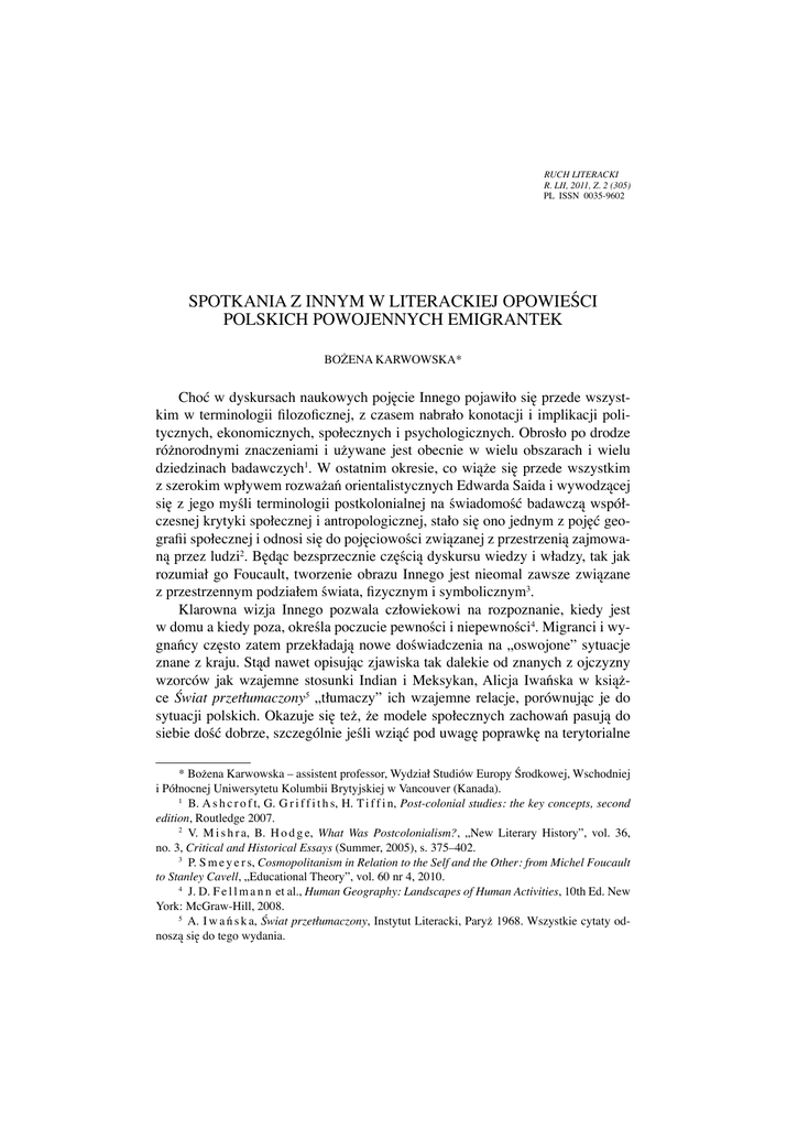 Spotkania z Innym w literackiej opowieści… 157 RUCH LITERACKI R. LII, 2011, Z. 2 (305) PL ISSN 0035-9602 SPOTKANIA Z INNYM W LITERACKIEJ OPOWIEŚCI POLSKICH POWOJENNYCH EMIGRANTEK BOŻENA KARWOWSKA* Choć w dyskursach naukowych pojęcie Innego pojawiło się przede wszystkim w terminologii filozoficznej, z czasem nabrało konotacji i implikacji politycznych, ekonomicznych, społecznych i psychologicznych. Obrosło po drodze różnorodnymi znaczeniami i używane jest obecnie w wielu obszarach i wielu dziedzinach badawczych1. W ostatnim okresie, co wiąże się przede wszystkim z szerokim wpływem rozważań orientalistycznych Edwarda Saida i wywodzącej się z jego myśli terminologii postkolonialnej na świadomość badawczą współczesnej krytyki społecznej i antropologicznej, stało się ono jednym z pojęć geografii społecznej i odnosi się do pojęciowości związanej z przestrzenią zajmowaną przez ludzi2. Będąc bezsprzecznie częścią dyskursu wiedzy i władzy, tak jak rozumiał go Foucault, tworzenie obrazu Innego jest nieomal zawsze związane z przestrzennym podziałem świata, fizycznym i symbolicznym3. Klarowna wizja Innego pozwala człowiekowi na rozpoznanie, kiedy jest w domu a kiedy poza, określa poczucie pewności i niepewności4. Migranci i wygnańcy często zatem przekładają nowe doświadczenia na „oswojone” sytuacje znane z kraju. Stąd nawet opisując zjawiska tak dalekie od znanych z ojczyzny wzorców jak wzajemne stosunki Indian i Meksykan, Alicja Iwańska w książce Świat przetłumaczony5 „tłumaczy” ich wzajemne relacje, porównując je do sytuacji polskich. Okazuje się też, że modele społecznych zachowań pasują do siebie dość dobrze, szczególnie jeśli wziąć pod uwagę poprawkę na terytorialne * Bożena Karwowska – assistent professor, Wydział Studiów Europy Środkowej, Wschodniej i Północnej Uniwersytetu Kolumbii Brytyjskiej w Vancouver (Kanada). 1 B. A s h c r o f t, G. G r i f f i t h s, H. T i f f i n, Post-colonial studies: the key concepts, second edition, Routledge 2007. 2 V. M i s h r a, B. H o d g e, What Was Postcolonialism?, „New Literary History”, vol. 36, no. 3, Critical and Historical Essays (Summer, 2005), s. 375–402. 3 P. S m e y e r s, Cosmopolitanism in Relation to the Self and the Other: from Michel Foucault to Stanley Cavell, „Educational Theory”, vol. 60 nr 4, 2010. 4 J. D. F e l l m a n n et al., Human Geography: Landscapes of Human Activities, 10th Ed. New York: McGraw-Hill, 2008. 5 A. I w a ń s k a, Świat przetłumaczony, Instytut Literacki, Paryż 1968. Wszystkie cytaty odnoszą się do tego wydania. 158 Bożena Karwowska różnice w przecinaniu się kategorii genderu, rasy i pozycji (lub klasy) społecznej. Z drugiej zaś strony to właśnie różnice pojmowane w tych kategoriach sprawiały, że postkolonialny świat stawiał pytania, których nie dawało się w prosty sposób przetłumaczyć „na nasze”. W myśli postkolonialnej pojęcie Innego wiąże się historycznie z terytorialną ekspansją uprawomacnianą wyższością kulturową, wyższym stopniem rozwoju politycznego, społecznego i gospodarczego6. Inny zawsze jest gorszy i już sam proces określania inności i konstytuowania Innego to etap przygotowawczy do jego subordynacji i wykluczenia, ale też do zwierania szeregów tych, którzy poprzez swoją wyższość nabierają prawa do władzy i którzy stają się dysponentami wiedzy o tych, których wykluczają z kręgu swoich. Kolonialnie zapośredniczony stosunek narratorki Iwańskiej do Inności przejawiał się choćby w braku akceptacji na przekład „Naszego” na odległe od kultury Zachodu kategorie, którymi posługiwał się Inny. I tak na przykład, opowiadając historię powstania wioski, Iwańska cytuje prostą opowieść swojego indiańskiego informatora, Dona Edmunda. W dawnych czasach wszystkie ziemie naokoło należały do wielkiego majątku. Dziedzicem był Hiszpan. Nasi przodkowie […] musieli pracować bardzo ciężko dla tego dziedzica […]. I codziennie musieli schodzić z gór na roboty w majątku […]. Ale córka Hiszpana przyszła kiedyś do ojca i powiedziała: […] Powinni mieszkać gdzieś bliżej i mieć po kawałku własnej ziemi. I Hiszpan zgodził się […]. Tutaj pozwolił się nam osiedlić. Tak powstało Mbayo (s. 25). Za tę opowieść założycielską Iwańska odwdzięczyła się legendą o powstaniu jej rodzinnej wsi, Mikorzyna, której początkiem była budowa kościoła. […] ale na tym się nie skończyło, bo Don Edmundo od razu chciał wiedzieć więcej: – A za co ten chłop zbudował kościół – zapytał – może Hiszpan mu dał? – Nie było żadnego Hiszpana! – A więc to się działo już po rozdaniu ziemi? – Nie, przed rozdaniem!… – Więc dlaczego nie było Hiszpana? (s. 26). Podsumowując rozmowę, autorka zauważa: „Przecież gdybym mu powiedziała, że mój ociec miał majątek, Don Edmundo wziąłby mnie za kolonialną Hiszpankę, córkę zdobywców Meksyku!” (s. 27). „Oswajając” Indian, Iwańska widzi ich jako ludzi starających się zachować swoją odrębność, a zatem różniących się zdecydowanie od (jej zdaniem bardziej) skolonizowanych Meksykanów, którzy nawet język kolonizatorów przyjęli za własny. Jednak ten właśnie brak przeniesionej przez kolonizację wspólnoty kultu6 J. P i c k l e s, New Cartographies’ and the Decolonization of European Geographies, „Area”, vol. 37, No. 4 (Dec., 2005), pp. 355–364. Spotkania z Innym w literackiej opowieści… 159 rowo-cywilizacyjnej Zachodu uniemożliwia jej pełne z nimi porozumienie. Splątanie problematyki rasowej i klasowej dodatkowo komplikuje porównania i przeniesienia, gdyż w sytuacji polskiej podziały mogły opierać się na klasie, statusie, religii, narodowości (w ich różnych kombinacjach), ale nie na różnicach rasowych (szczególnie w sensie koloru skóry). Przy tym stosunek do „kolorowych” opierał się