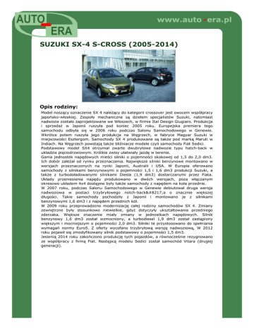 www.auto - era.pl SUZUKI SX-4 S-CROSS (2005-2014) Opis rodziny: Model noszący oznaczenie SX 4 należący do kategorii crossover jest owocem współpracy japońsko-włoskiej. Zespoły mechaniczne są dziełem specjalistów Suzuki, natomiast nadwozie zostało zaprojektowane we Włoszech, w firmie Ital Design Giugiaro. Produkcja i sprzedaż w Japonii ruszyła pod koniec 2005 roku. Europejska premiera tego samochodu odbyła się w 2006 roku podczas Salonu Samochodowego w Genewie. Wkrótce potem ruszyła jego produkcja na Węgrzech, w fabryce Magyar Suzuki w miejscowości Esztergom. Samochody SX 4 produkowane są także pod marką Maruti w Indiach. Na Węgrzech powstają także bliźniacze modele czyli samochody Fiat Sedici. Podstawowy model SX4 otrzymał zwarte dwubryłowe nadwozie typu hatch-back w układzie pięciodrzwiowym. Krótkie zwisy ułatwiały jazdę w terenie. Gama jednostek napędowych mieści silniki o pojemności skokowej od 1,5 do 2,0 dm3. Ich dobór zależał od rynku przeznaczenia. Największe silniki benzynowe montowano w wersjach przeznaczonych na rynki Japonii, Australii i USA. W Europie oferowano samochody z silnikami benzynowymi o pojemności 1,5 i 1,6 dm3 produkcji Suzuki, a także z turbodoładowanymi silnikami Diesla (1,9 dm3) dostarczanymi przez Fiata. Układy przeniesienia napędu produkowano w dwóch wersjach, poza włączanym okresowo układem 4x4 dostępne były także samochody z napędem na koła przednie. W 2007 roku, podczas Salonu Samochodowego w Genewie debiutował druga wersja nadwoziowa w postaci trzybryłowego notch-back’a o znacznie większej długości. Takie samochody pochodziły z Japonii i montowano je z silnikami benzynowymi 1,6 dm3 i z napędem przednich kół. W 2009 roku przeprowadzono modernizację całej rodziny samochodów SX 4. Zmiany zewnętrzne były stosunkowo niewielkie, gdyż dotyczyły ukształtowania przedniego zderzaka. Większe znaczenie miały zmiany w jednostkach napędowych. Silnik benzynowy 1,6 dm3 został wzmocniony, a turbodiesel 1,9 dm3 został zastąpiony większym i mocniejszym o pojemności 2,0 dm3. Silniki te przystosowano do spełniania wymagań normy Euro5. Z oferty wycofano trzybryłową wersję nadwoziową, W 2012 roku pojawił się zmodyfikowany silnik podstawowy o pojemności 1,5 dm3. Jesienią 2014 roku zakończono produkcję tych pojazdów, a równocześnie rezygnowano ze współpracy z firmą Fiat. Następcą modelu Sedici został samochód Vitara (drugiej generacji).