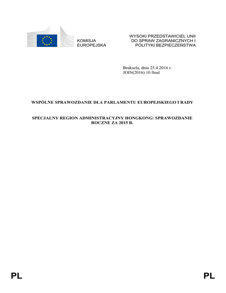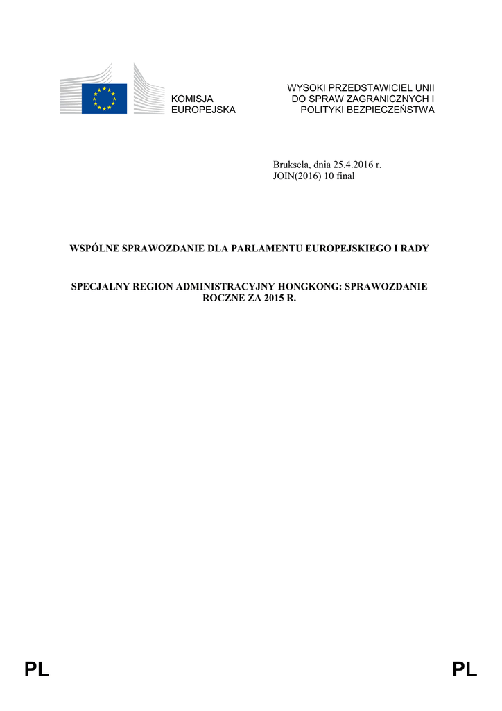 KOMISJA EUROPEJSKA WYSOKI PRZEDSTAWICIEL UNII DO SPRAW ZAGRANICZNYCH I POLITYKI BEZPIECZEŃSTWA Bruksela, dnia 25.4.2016 r. JOIN(2016) 10 final WSPÓLNE SPRAWOZDANIE DLA PARLAMENTU EUROPEJSKIEGO I RADY SPECJALNY REGION ADMINISTRACYJNY HONGKONG: SPRAWOZDANIE ROCZNE ZA 2015 R. PL PL WSPÓLNE SPRAWOZDANIE DLA PARLAMENTU EUROPEJSKIEGO I RADY SPECJALNY REGION ADMINISTRACYJNY HONGKONG: SPRAWOZDANIE ROCZNE ZA 2015 R. Streszczenie Od czasu przekazania Hongkongu Chińskiej Republice Ludowej (ChRL), które miało miejsce w 1997 r., Unia Europejska (UE) i jej państwa członkowskie uważnie obserwują zmiany polityczne i gospodarcze zachodzące w Specjalnym Regionie Administracyjnym (SRA) Hongkong w ramach zasady „jeden kraj, dwa systemy”. Zgodnie ze zobowiązaniem podjętym w 1997 r. wobec Parlamentu Europejskiego co roku sporządzane jest sprawozdanie na temat zachodzących w Hongkongu zmian. Niniejsze sprawozdanie jest osiemnastym z kolei i obejmuje rok 2015. UE nadal respektuje politykę „jednych Chin” i popiera zasadę „jeden kraj, dwa systemy” i jej wdrożenie. Rok 2015 był z politycznego punktu widzenia trudny dla SRA Hongkong i dla funkcjonowania zasady „jeden kraj, dwa systemy”. W dniu 18 czerwca Rada Ustawodawcza zagłosowała za odrzuceniem rządowego wniosku w sprawie wprowadzenia powszechnego prawa wyborczego w wyborach szefa rządu od 2017 r. Głosowanie za odrzuceniem tej propozycji zwieńczyło proces reform ordynacji wyborczej trwający prawie 18 miesięcy, w ramach którego odbyły się spolaryzowane debaty, a pod koniec 2014 r. – masowe demonstracje na rzecz demokratyzacji systemu głosowania w stopniu większym, niż zezwolono na to w decyzji Stałego Komitetu Ogólnochińskiego Zgromadzenia Przedstawicieli Ludowych z sierpnia 2014 r. UE ubolewa, że główni uczestnicy procesu reformy ordynacji wyborczej nie byli w stanie osiągnąć kompromisu w sprawie tej reformy. Będąc stroną zainteresowaną przyszłością Hongkongu i zgodnie z ustawą zasadniczą, UE poprzez konstruktywną dyskusję zachęca SRA Hongkong i rząd centralny do wznowienia procesu reformy ordynacji wyborczej i osiągnięcia porozumienia w kontekście demokratycznego, sprawiedliwego, otwartego i przejrzystego systemu wyborczego. Dzięki wprowadzeniu powszechnych wyborów rząd cieszyłby się większym poparciem społecznym i legitymacją, jeżeli chodzi o osiąganie celów gospodarczych i rozwiązywanie kwestii społecznych takich jak podziały społecznoekonomiczne i pokoleniowe panujące w społeczeństwie Hongkongu. Poważne wątpliwości dotyczące prawidłowego funkcjonowania zasady „jeden kraj, dwa systemy” wzbudził fakt, że pod koniec 2015 r. doszło do zaginięcia pięciu osób – w tym dwóch posiadających obywatelstwo UE – powiązanych z działającymi w Hongkongu wydawnictwem i księgarnią, które są znane z publikowania i sprzedawania materiałów o treściach krytycznych wobec rządu centralnego. Okoliczności tych zaginięć były podejrzane; piąta osoba, która zaginęła na terytorium SRA Hongkong, została – jak się wydaje – uprowadzona. UE uważa sprawę zaginięcia pięciu wydawców książek za najpoważniejsze wyzwanie w kontekście prawidłowego funkcjonowania ustawy zasadniczej Hongkongu i zasady „jeden kraj, dwa systemy” od czasu przekazania Hongkongu Chińskiej Republice Ludowej w 1997 r. Sprawa ta budzi poważne obawy co do przestrzegania praw człowieka i podstawowych 2 wolności, a także stosowania przepisów prawa karnego Chińskiej Republiki Ludowej w odniesieniu do czynów, które nie podlegają karze zgodnie z prawem Hongkongu. Sprawa potencjalnie może przynieść długotrwałe konsekwencje dla praworządności w Hongkongu i może mieć wpływ na pozycję Hongkongu jako międzynarodowego ośrodka biznesu. UE wzywa rząd centralny do pełnego przestrzegania przepisów konstytucyjnych ustanowionych dla SRA Hongkong w ramach Chińskiej Republiki Ludowej oraz do przywrócenia zaufania, jakie mieszkańcy Hongkongu i społeczność międzynarodowa pokładają w ustawie zasadniczej oraz zasadzie „jeden kraj, dwa systemy”. Inne aspekty zasady „jeden kraj, dwa systemy” nadal funkcjonowały sprawnie w Hongkongu w 2015 r. Organy sądowe nadal działają niezależnie i przestrzegają zasady sprawiedliwości proceduralnej. Zachowanie praworządności pozostało nadrzędną zasadą dla rządu, podmiotów gospodarczych i społeczeństwa ogółem. Nadal prowadzone są intensywne działania antykorupcyjne, czego dowodem był rzetelny proces sądowy w sprawie karnej, w której oskarżonym był były szef rządu, jak również pozytywne wskaźniki dotyczące dobrych rządów. Wolność słowa oraz wolny dostęp do informacji są ogólnie przestrzegane. Można jednak zaobserwować negatywną tendencję w kontekście wolności prasy i różnorodności jej form będącą skutkiem zachowywania ostrożności i autocenzury podczas przekazywania wiadomości na temat wydarzeń krajowych i z zakresu polityki zagranicznej w kontekście Chińskiej Republice Ludowej. Wydaje się, że zaginięcie pięciu wydawców książek tylko pogorszy tę sytuację. Zasadniczo przestrzega się wolności nauki; autonomii instytucjonalnej uniwersytetów zagraża jednak wybór osób wspierających obecną władzę na stanowiska w radach uczelni. Wolnorynkowy system gospodarczy nadal sprawnie funkcjonował, a Hongkong pozostawał konkurencyjnym międzynarodowym ośrodkiem biznesu, jak również głównym światowym ośrodkiem współpracy gospodarczej z Chinami kontynentalnymi. Praworządność, przejrzyste ramy prawne, bardzo niski poziom korupcji i wskaźnik przestępczości wraz ze skutecznie działającą administracją publiczną i niezależnym sądownictwem przyczyniały się do zachowania i wspierania korzystnego klimatu inwestycyjnego, który stanowi podstawę sukcesu Hongkongu. Utrzymanie tych elementów ma kluczowe znaczenie dla konkurencyjności Hongkongu; równ