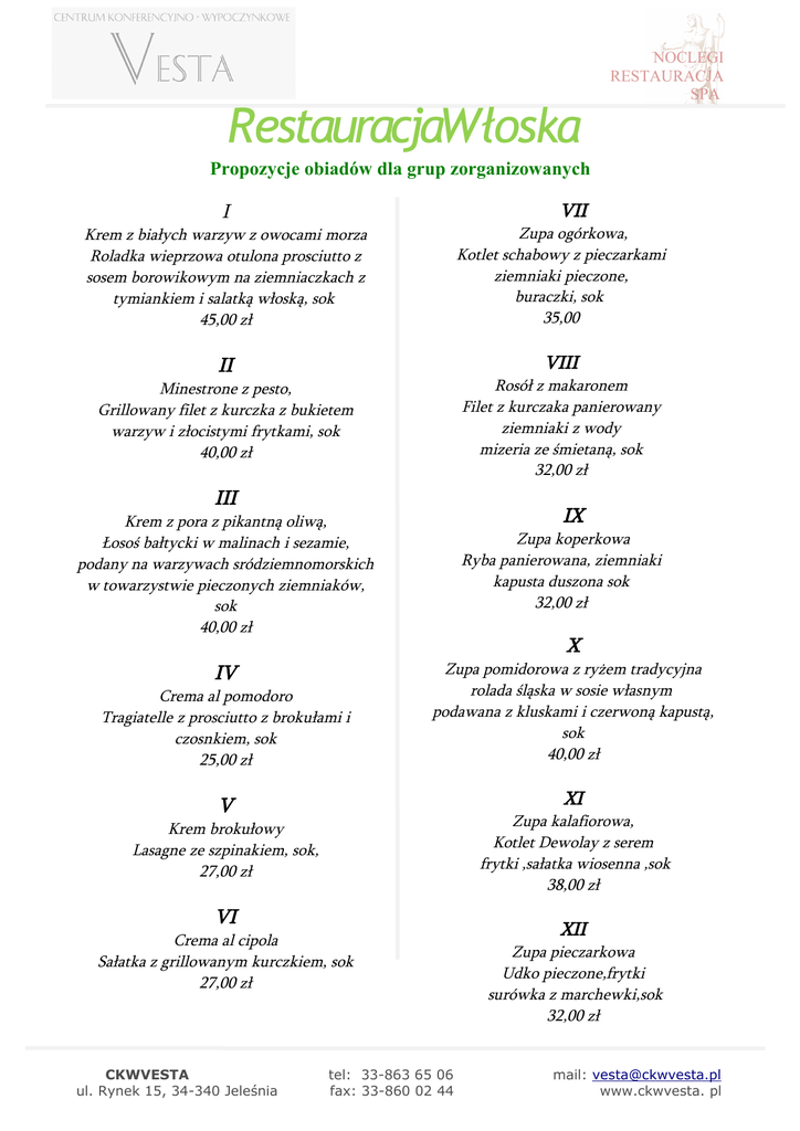 RestauracjaWłoska NOCLEGI RESTAURACJA SPA Propozycje obiadów dla grup zorganizowanych I VII Krem z białych warzyw z owocami morza Roladka wieprzowa otulona prosciutto z sosem borowikowym na ziemniaczkach z tymiankiem i salatką włoską, sok 45,00 zł Zupa ogórkowa, Kotlet schabowy z pieczarkami ziemniaki pieczone, buraczki, sok 35,00 II VIII Rosół z makaronem Filet z kurczaka panierowany ziemniaki z wody mizeria ze śmietaną, sok 32,00 zł Minestrone z pesto, Grillowany filet z kurczka z bukietem warzyw i złocistymi frytkami, sok 40,00 zł III IX Krem z pora z pikantną oliwą, Łosoś bałtycki w malinach i sezamie, podany na warzywach sródziemnomorskich w towarzystwie pieczonych ziemniaków, sok 40,00 zł Zupa koperkowa Ryba panierowana, ziemniaki kapusta duszona sok 32,00 zł X IV Crema al pomodoro Tragiatelle z prosciutto z brokułami i czosnkiem, sok 25,00 zł Zupa pomidorowa z ryżem tradycyjna rolada śląska w sosie własnym podawana z kluskami i czerwoną kapustą, sok 40,00 zł V XI Zupa kalafiorowa, Kotlet Dewolay z serem frytki ,sałatka wiosenna ,sok 38,00 zł Krem brokułowy Lasagne ze szpinakiem, sok, 27,00 zł VI Crema al cipola Sałatka z grillowanym kurczkiem, sok 27,00 zł CKWVESTA ul. Rynek 15, 34-340 Jeleśnia tel: 33-863 65 06 fax: 33-860 02 44 XII Zupa pieczarkowa Udko pieczone,frytki surówka z marchewki,sok 32,00 zł mail: [email protected] www.ckwvesta. pl Na dobry początek wybierz przystawkę…. Carpaccio Wołowe 15,00 zł Babeczka z łososia 12,00 zł Cienko krojone płaty marynowanej wołowiny z rucolą i parmezanem skropione oliwa z oliwek i sokiem ze świeżej cytryny babeczka z wędzonego łososia z musem z awokado podane na grzance z mixem sałat i winegretem Camembert 12,00 zł W migdałowej panierce z sosem żurawinowym Mozzarella 8,00 zł Biała mozzarella przełożona z czerwonym pomidorem zroszona pesto NOCLEGI RESTAURACJA SPA … i deser na słodkie zakończenie Galaretka z owocami Ciasto deserowe Lody z gorącymi malinami Pana Cotta z sosem truskawkowym 5,00 zł 5,00 zł 7,00 zł 9,90 zł klasyczny deser włoski na bazie śmietany i laski wanilii Szarlotka 8,00 zł jabłkowy smakołyk z ciasta francuskiego podany na ciepło z gałką lodów Tiramisu 9,00 zł prawdziwe włoskie tiramisu z serka Mascarpone z odrobiną amaretto Propozycja uroczystej kolacji 99,00 zł/os Zupa Krem z białych warzyw z owocami morza Danie główne Roladka z indyka ze śliwką w boczku, kasztanki ziemniaczne w zielonym sosie z bukietem surówek Deser Szarlotka na ciepło z lodami i bita śmietaną Bufet zimny: Sałatka z brokułami, sałatka jarzynowa, jajko w sosie tatarskim, patera warzyw, deska serów i wędlin, śledź w tłuczonym pieprzu, szynka faszerowana pieczywo, masełko Bufet kawowy kawa, herbata - bez ograniczeń woda, sok 0,5l./osoba II danie ciepłe Kita wieprzowa z pikantnymi ziemniaczkami, sosem tzatzyki i kapustą zasmażaną Dziękujemy za zapoznanie się z naszą ofertą, w razie pytań jesteśmy do Państwa dyspozycji Recepcja CKW Vesta tel. 33 8636 506 33 8636 092 fax 33 8600 244 [email protected] CKWVESTA ul. Rynek 15, 34-340 Jeleśnia Monika Rybarska z-ca dyrektora ds. gastronomii i hotelarstwa tel. 664 453 967 [email protected] tel: 33-863 65 06 fax: 33-860 02 44 mail: [email protected] www.ckwvesta. pl NOCLEGI RESTAURACJA SPA CKWVESTA ul. Rynek 15, 34-340 Jeleśnia tel: 33-863 65 06 fax: 33-860 02 44 mail: [email protected] www.ckwvesta. pl