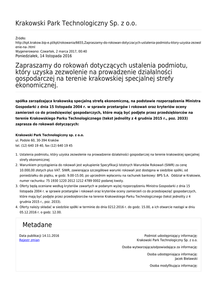 Krakowski Park Technologiczny Sp. z o.o. Źródło: http://kpt.krakow.bip-e.pl/kpt/rokowania/6655,Zapraszamy-do-rokowan-dotyczacych-ustalenia-podmiotu-ktory-uzyska-zezwol enie-na-.html Wygenerowano: Czwartek, 2 marca 2017, 00:40 Poniedziałek, 14 listopada 2016 Zapraszamy do rokowań dotyczących ustalenia podmiotu, który uzyska zezwolenie na prowadzenie działalności gospodarczej na terenie krakowskiej specjalnej strefy ekonomicznej. spółka zarządzająca krakowską specjalną strefą ekonomiczną, na podstawie rozporządzenia Ministra Gospodarki z dnia 15 listopada 2004 r. w sprawie przetargów i rokowań oraz kryteriów oceny zamierzeń co do przedsięwzięć gospodarczych, które mają być podjęte przez przedsiębiorców na terenie Krakowskiego Parku Technologicznego (tekst jednolity z 4 grudnia 2015 r., poz. 2033) zaprasza do rokowań dotyczących: Krakowski Park Technologiczny sp. z o.o. ul. Podole 60, 30-394 Kraków tel. (12) 640 19 40, fax (12) 640 19 45 1. Ustalenia podmiotu, który uzyska zezwolenie na prowadzenie działalności gospodarczej na terenie krakowskiej specjalnej strefy ekonomicznej 2. Warunkiem przystąpienia do rokowań jest wykupienie Specyfikacji Istotnych Warunków Rokowań (SIWR) za cenę 10.000,00 złotych plus VAT. SIWR, zawierająca szczegółowe warunki rokowań jest dostępna w siedzibie spółki, od poniedziałku do piątku, w godz. 9.00-15.00, po uprzednim wpłaceniu na rachunek bankowy: BPS S.A. Oddział w Krakowie, numer rachunku: 75 1930 1220 2012 1212 4789 0002 podanej kwoty. 3. Oferty będą oceniane według kryteriów zawartych w podanym wyżej rozporządzeniu Ministra Gospodarki z dnia 15 listopada 2004 r. w sprawie przetargów i rokowań oraz kryteriów oceny zamierzeń co do przedsięwzięć gospodarczych, które mają być podjęte przez przedsiębiorców na terenie Krakowskiego Parku Technologicznego (tekst jednolity z 4 grudnia 2015 r., poz. 2033). 4. Oferty należy składać w siedzibie spółki w terminie do dnia 0212.2016 r. do godz. 15.00, a ich otwarcie nastąpi w dniu 05.12.2016 r. o godz. 12.00. Metadane Data publikacji 14.11.2016 Rejestr zmian Podmiot udostępniający informację: Krakowski Park Technologiczny Sp. z o.o. Osoba wytwarzająca/odpowiadająca za informację: Osoba udostępniająca informację: Jacek Bielawski Osoba modyfikująca informację: