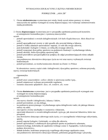 WYMAGANIA EDUKACYJNE Z JĘZYKA NIEMIECKIEGO PODRĘCZNIK „AHA 2B” 1. Ocena niedostateczna wystawiana jest wtedy, kiedy uczeń mimo pomocy ze strony nauczyciela nie spełnia wymagań na ocenę dopuszczającą i nie wykazuje zainteresowania nauką przedmiotu. 2. Ocena dopuszczająca wystawiana jest w przypadku spełnienia poniższych kryteriów. a) umiejętności komunikacyjne ( z pomocą nauczyciela): uczeń: - potrafi opowiedzieć o swoich dolegliwościach: Ich habe Kopfschmerzen. Mein Bauch tut weh., - potrafi uporządkować zwroty w taki sposób, aby powstał dialog u lekarza, - potrafi w kilku zdaniach opowiedzieć/ napisać, co robi dla swego zdrowia, - pyta koleżanki i kolegów w klasie, co robią dla swojego zdrowia, - potrafi rozpoznać dyscypliny sportowe na podstawie ilustracji i wysłuchanego tekstu, - potrafi określić, która dyscyplinę sportową lubi, - potrafi prawidłowo przyporządkować podpisy do zdjęć przedstawiających różne zakątki świata, - zna podstawowe słownictwo dotyczące życia na wsi oraz nazwy wybranych zwierząt hodowlanych - potrafi powiedzieć, co trzeba koniecznie chronić na Ziemi i w Polsce b) słownictwo: nazwy części ciała i dolegliwości; dyscypliny sportowe; ochrona przyrody, nazwy zwierząt hodowlanych c)gramatyka: uczeń: - potrafi użyć czasowników: sollen i dürfen w pierwszej osobie l.poj., - potrafi stopniować wybrane przymiotniki regularne, - rozumie znaczenie spójników: dass, ob, sondern, als, wenn 3. Ocena dostateczna wystawiana jest w przypadku spełnienia poniższych wymagań oraz wymagań na ocenę dopuszczającą. a) umiejętności komunikacyjne: uczeń: - zna nazwy chorób i dolegliwości, lekarzy i leków, - potrafi powiedzieć, co mu dolega, - na podstawie przeczytanego i wysłuchanego opisu dolegliwości radzi, do jakiego lekarza należy się udać, - zna typowe zwroty niezbędne w rozmowie z lekarzem, - opowiada lekarzowi o swoich dolegliwościach i pyta go, jak stosować lekarstwa, które mu przepisał, - zna słownictwo dotyczące zdrowego stylu życia, a w szczególności właściwego odżywiania, sportu, - potrafi zapytać kolegów i koleżanki, co robią dla zdrowia, - potrafi opowiedzieć o ulubionych dyscyplinach sportu na podstawie schematu, - namawia kolegę, koleżankę do spędzenia wolnego czasu w Aquaparku, wykorzystując podane słownictwo,, - składa koledze, koleżance propozycję wspólnego aktywnego spędzenia czasu, - zna podstawowe słownictwo dotyczące klimatu, położenia geograficznego i przyrody, - ochrony lasów tropikalnych oraz ochrony środowiska, zbiera informacje dotyczące lasów tropikalnych na podstawie przeczytanego tekstu, opisuje warunki klimatyczne panujące w Polsce, przeprowadza w klasie ankietę na temat osobistego wkładu uczniów w ochronę środowiska oraz podaje jej wyniki,, wypowiada się pisemnie na temat problemu ochrony środowiska w Polsce, we własnej miejscowości, w rodzinnym domu, zna podstawowe słownictwo dotyczące życia na wsi oraz nazwy wybranych zwierząt hodowlanych, przygotowuje pisemną wypowiedź o zaletach życia na wsi zawierającą argumenty z wywiadu b) słownictwo: nazwy chorób i dolegliwości, lekarzy i leków; recepta lekarska; zdrowy styl życia; dyscypliny sportowe; klimat, położenie geograficzne, ochrona lasów tropikalnych, ochrona środowiska; życie na wsi, nazwy zwierząt hodowlanych c) gramatyka: uczeń: - poprawnie odmienia i stosuje czasowniki modalne sollen i dürfen, - poprawnie stosuje regularne i nieregularne stopniowanie przymiotników i przysłówków, - prawidłowo buduje zdania podrzędne ze spójnikami dass i ob. Oraz zdania ze spójnikiem sondern, - poprawnie tworzy przymiotniki w stopniu najwyższym, - potrafi odmienić czasowniki modalne w czasie przeszłym Imperfekt, - potrafi poprawnie zastosować spójniki als i wenn 3. Ocena dobra wystawiana jest w przypadku spełnienia poniższych wymagań oraz wymagań na oceny dopuszczającą i dostateczną. a) umiejętności komunikacyjne: uczeń: - sprawnie operuje bogatym słownictwem dotyczącym zdrowia i choroby, - sprawnie operuje zwrotami używanymi podczas rozmowy z lekarzem, - podaje propozycje zachowań mających na celu utrzymanie zdrowia i dobrej formy, - formułuje dłuższą wypowiedź pisemną i ustną o swoim stylu życia, - potrafi zrelacjonować pisemnie, co zrobił dla swojego zdrowia w zeszłym tygodniu, - umiejętnie przedstawia ulubionego sportowca/ ulubioną sportsmenkę, - zna słownictwo dotyczące pływania i pływalni, zniżek indywidualnych i grupowych oraz sprzętu sportowego, - używając licznych argumentów, reklamuje koledze/koleżance Aquapark i namawia go/ją do wspólnego wyjścia na basen, - redaguje notatkę o ulubionej modnej dyscyplinie sportowej i prezentuje ja na forum klasy, - zna niemieckie przysłowia związanymi ze sportem, - formułuje wypowiedź pisemną na temat jednego z wymienionych obszarów, wykorzystując podane słownictwo, - prowadzi dyskusję o tym, co trzeba koniecznie chronić na Ziemi i w Polsce, - prowadzi dyskusję na temat własnego wkładu w ochronę środowiska, - formułuje dłuższą wypowiedź pisemną o problemie ochrony środowiska w Polsce i we własnej miejscowości, - prowadzi dyskusję o zaletach i wadach życia na wsi b) słownictwo: lekarze danej specjalności; przysłowia związane ze sportem; zagrożenia środowiska c) gramatyka: uczeń: - sprawnie posługuje się zdaniami podrzędnymi ze spójnikiem weil w wypowiedziach ustnych i pisemnych, poprawnie stosuje regularne i nieregularne stopniowanie przymiotników i przysłówków w wypowiedziach ustnych i pisemnych, poprawnie stosuje dopełniacz (Genitiv) rzeczownika oraz imion własnych Ocena bardzo dobra wystawiana jest w przypadku spełnienia poniższych wymagań oraz wymagań na ocenę dopuszczającą, dostateczną i dobrą. a) umiejętności komunikacyjne: uczeń: - sprawnie stosuje zwroty idiomatyczne zawierające nazwy części ciała, - szcze