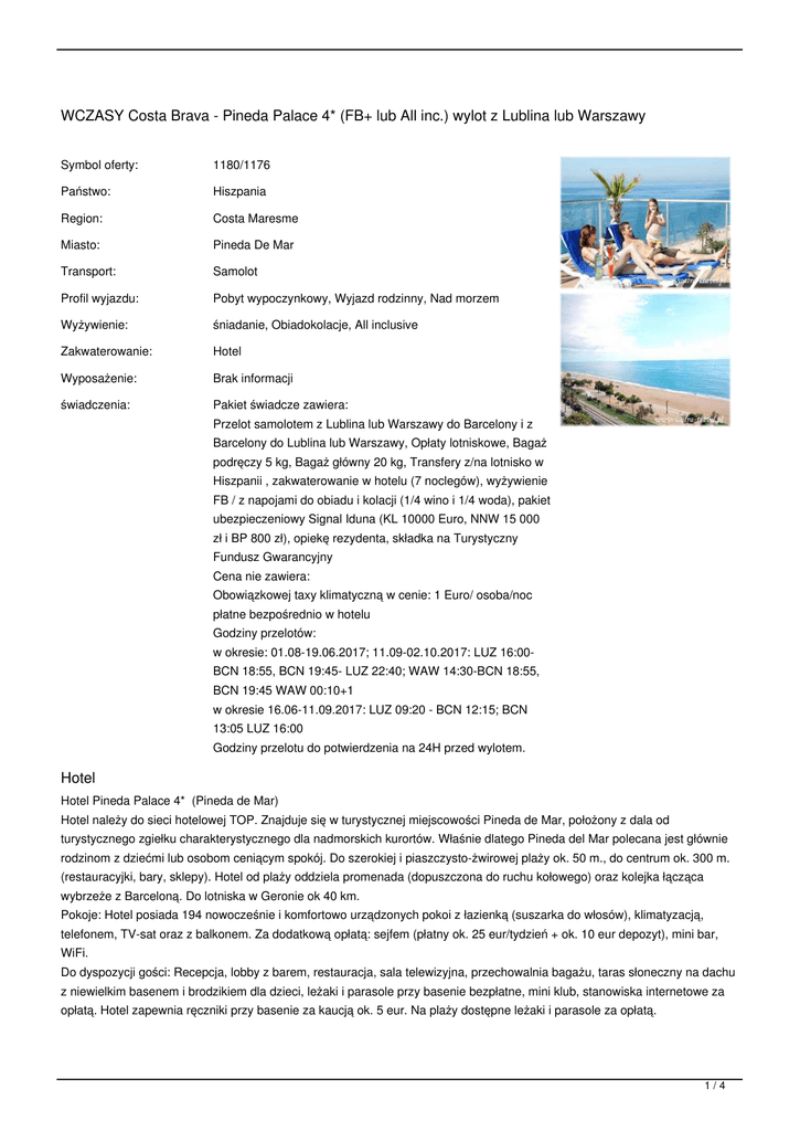 WCZASY Costa Brava - Pineda Palace 4* (FB+ lub All inc.) wylot z Lublina lub Warszawy Symbol oferty: 1180/1176 Państwo: Hiszpania Region: Costa Maresme Miasto: Pineda De Mar Transport: Samolot Profil wyjazdu: Pobyt wypoczynkowy, Wyjazd rodzinny, Nad morzem Wyżywienie: śniadanie, Obiadokolacje, All inclusive Zakwaterowanie: Hotel Wyposażenie: Brak informacji świadczenia: Pakiet świadcze zawiera: Przelot samolotem z Lublina lub Warszawy do Barcelony i z Barcelony do Lublina lub Warszawy, Opłaty lotniskowe, Bagaż podręczy 5 kg, Bagaż główny 20 kg, Transfery z/na lotnisko w Hiszpanii , zakwaterowanie w hotelu (7 noclegów), wyżywienie FB / z napojami do obiadu i kolacji (1/4 wino i 1/4 woda), pakiet ubezpieczeniowy Signal Iduna (KL 10000 Euro, NNW 15 000 zł i BP 800 zł), opiekę rezydenta, składka na Turystyczny Fundusz Gwarancyjny Cena nie zawiera: Obowiązkowej taxy klimatyczną w cenie: 1 Euro/ osoba/noc płatne bezpośrednio w hotelu Godziny przelotów: w okresie: 01.08-19.06.2017; 11.09-02.10.2017: LUZ 16:00- BCN 18:55, BCN 19:45- LUZ 22:40; WAW 14:30-BCN 18:55, BCN 19:45 WAW 00:10+1 w okresie 16.06-11.09.2017: LUZ 09:20 - BCN 12:15; BCN 13:05 LUZ 16:00 Godziny przelotu do potwierdzenia na 24H przed wylotem. Hotel Hotel Pineda Palace 4* (Pineda de Mar) Hotel należy do sieci hotelowej TOP. Znajduje się w turystycznej miejscowości Pineda de Mar, położony z dala od turystycznego zgiełku charakterystycznego dla nadmorskich kurortów. Właśnie dlatego Pineda del Mar polecana jest głównie rodzinom z dziećmi lub osobom ceniącym spokój. Do szerokiej i piaszczysto-żwirowej plaży ok. 50 m., do centrum ok. 300 m. (restauracyjki, bary, sklepy). Hotel od plaży oddziela promenada (dopuszczona do ruchu kołowego) oraz kolejka łącząca wybrzeże z Barceloną. Do lotniska w Geronie ok 40 km. Pokoje: Hotel posiada 194 nowocześnie i komfortowo urządzonych pokoi z łazienką (suszarka do włosów), klimatyzacją, telefonem, TV-sat oraz z balkonem. Za dodatkową opłatą: sejfem (płatny ok. 25 eur/tydzień + ok. 10 eur depozyt), mini bar, WiFi. Do dyspozycji gości: Recepcja, lobby z barem, restauracja, sala telewizyjna, przechowalnia bagażu, taras słoneczny na dachu z niewielkim basenem i brodzikiem dla dzieci, leżaki i parasole przy basenie bezpłatne, mini klub, stanowiska internetowe za opłatą. Hotel zapewnia ręczniki przy basenie za kaucją ok. 5 eur. Na plaży dostępne leżaki i parasole za opłatą. 1/4 Cena zawiera Pakiet cenowy zawiera: - Przelot samolotem na trasie Lublin - Barcelona - Lublin lub Warszawa - Barcelona - Warszawa - Bagaż podręczny do 5 kg - Bagaż główny do 20 kg - Transfery z/na lotnisko w Hiszpanii - Zakwaterowanie w hotelu - Wyżywienie 3 x dziennie / z napojami (obiady i kolacje: 1/4 wina, 1/4 wody) - Opieka rezydenta - Pakiet ubezpieczeniowy (KL 10000 Euro, NNW 15 000 zł i BP 800 zł) - Składka na Turystyczny Fundusz Gwarancyjny Cena nie zawiera: - Obowiązkowej taxy klimatyczną w cenie: 1 Euro/ osoba/noc płatne bezpośrednio w hotelu Dodatkowe informacje Dopłaty/zniżki: - dopłata do pokoju 1-osobowego +540 zł/osoba/tydzień - dopłata do wyżywienia All inclusive +350 zł/osoba/tydzień - infant (0-2 lat):150 zl/ 1 tydzień Świadczenia fakultatywne: - Gwarancja Niezmienności Ceny: 80 zł - Ubezpieczenie od kosztów rezygnacji: 2,5 % (zwrot 80 %) - Ubezpieczenie od kosztów rezygnacji: 3 % (zwrot 100 %) - Ubezpieczenie od kosztów rezygnacji z rozszerzeniem o choroby przewlekłe: 6,5 % ceny imprezy (zwrot 80 %) - Ubezpieczenie od kosztów rezygnacji z rozszerzeniem o choroby przewlekłe: 7,5 % ceny imprezy (zwrot 100 %) - Ubezpieczenie od chorób przewlekłych: 70 zł/ 1 tydzień - Rozszerzenie ubezpieczenia: KL 30 000 Euro, NNW15 000 zł, BP 1800 zł: 30 zł TERMINY: od: 2017-05-01 do: 2017-05-08 (8 dni), miejsca: zamów cena od: 2190 PLN dodatkowe informacje/uwagi: wylot z Lublina lub Warszawy od: 2017-05-08 do: 2017-05-15 (8 dni), miejsca: zamów cena od: 2190 PLN dodatkowe informacje/uwagi: wylot z Lublina lub Warszawy od: 2017-05-15 do: 2017-05-22 (8 dni), miejsca: zamów cena od: 2190 PLN dodatkowe informacje/uwagi: wylot z Lublina lub Warszawy od: 2017-05-22 do: 2017-05-29 (8 dni), miejsca: zamów cena od: 2190 PLN dodatkowe informacje/uwagi: wylot z Lublina lub Warszawy od: 2017-05-29 do: 2017-06-05 (8 dni), miejsca: zamów cena od: 2190 PLN dodatkowe informacje/uwagi: wylot z Lublina lub Warszawy od: 2017-06-05 do: 2017-06-12 (8 dni), miejsca: zamów cena od: 2450 PLN dodatkowe informacje/uwagi: wylot z Lublina lub Warszawy od: 2017-06-12 do: 2017-06-19 (8 dni), miejsca: zamów cena od: 2450 PLN dodatkowe informacje/uwagi: wylot z Lublina lub Warszawy od: 2017-06-19 do: 2017-06-26 (8 dni), miejsca: zamów cena od: 2450 PLN dodatkowe informacje/uwagi: wylot z Lublina od: 2017-09-11 do: 2017-09-18 (8 dni), miejsca: zamów cena od: 2190 PLN dodatkowe informacje/uwagi: wylot z Lublina lub Warszawy od: 2017-09-18 do: 2017-09-25 (8 dni), miejsca: zamów cena od: 2190 PLN 2/4 dodatkowe informacje/uwagi: wylot z Lublina lub Warszawy od: 2017-09-25 do: 2017-10-02 (8 dni), miejsca: zamów cena od: 2190 PLN dodatkowe informacje/uwagi: wylot z Lublina lub Warszawy CENNIK: Długość pobytu: 8 dni 8 dni Grupa cenowa: A8 B8 Transport (obligatoryjny) (*) Lot do/z Barcelona (BCN) z wybranego lotniska w PL (-) Transport (do wyboru) WAW(Warszawa)-BCN(Barcelona)-WAW(Warszawa) (-) (*) LUZ-BCN-LUZ przelot (-) Inne2 (do wyboru) (*) zniżka za wczesną rezerwację od osoby dorosłej -200 Pobyt w obiekcie (do wyboru) (*) Pokój 2-osobowy standardowo dla osób: 2 (-) Pokój 2-osoby + dostawka standardowo dla osób: 3 (-) pokój 2-osobowy z 2 dostawkami dla dzieci standardowo dla osób: 4 (-) Infant w pokoju (-) Pokój 1-osobowy (-) Wyżywienie (obligatoryjne) (*) FB +napoje (1/4wina i 1/4wody do obiadu i kolacji) (-) Pobyt w obiekcie (obligatoryjny) (*) Hotel Pineda Palace 4* (Pineda de Mar) Inne (opcjonalne) (-) GWARANCJA NIEZMIENNOŚCI