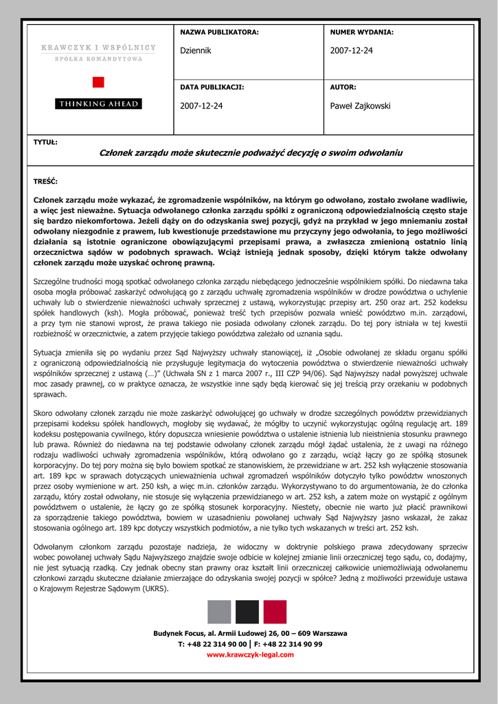 NAZWA PUBLIKATORA: NUMER WYDANIA: Dziennik 2007-12-24 DATA PUBLIKACJI: AUTOR: 2007-12-24 Paweł Zajkowski TYTUŁ: Członek zarządu może skutecznie podważyć decyzję o swoim odwołaniu TREŚĆ: Członek zarządu może wykazać, że zgromadzenie wspólników, na którym go odwołano, zostało zwołane wadliwie, a więc jest nieważne. Sytuacja odwołanego członka zarządu spółki z ograniczoną odpowiedzialnością często staje się bardzo niekomfortowa. Jeżeli dąży on do odzyskania swej pozycji, gdyż na przykład w jego mniemaniu został odwołany niezgodnie z prawem, lub kwestionuje przedstawione mu przyczyny jego odwołania, to jego możliwości działania są istotnie ograniczone obowiązującymi przepisami prawa, a zwłaszcza zmienioną ostatnio linią orzecznictwa sądów w podobnych sprawach. Wciąż istnieją jednak sposoby, dzięki którym także odwołany członek zarządu może uzyskać ochronę prawną. Szczególne trudności mogą spotkać odwołanego członka zarządu niebędącego jednocześnie wspólnikiem spółki. Do niedawna taka osoba mogła próbować zaskarżyć odwołującą go z zarządu uchwałę zgromadzenia wspólników w drodze powództwa o uchylenie uchwały lub o stwierdzenie nieważności uchwały sprzecznej z ustawą, wykorzystując przepisy art. 250 oraz art. 252 kodeksu spółek handlowych (ksh). Mogła próbować, ponieważ treść tych przepisów pozwala wnieść powództwo m.in. zarządowi, a przy tym nie stanowi wprost, że prawa takiego nie posiada odwołany członek zarządu. Do tej pory istniała w tej kwestii rozbieżność w orzecznictwie, a zatem przyjęcie takiego powództwa zależało od uznania sądu. Sytuacja zmieniła się po wydaniu przez Sąd Najwyższy uchwały stanowiącej, iż „Osobie odwołanej ze składu organu spółki z ograniczoną odpowiedzialnością nie przysługuje legitymacja do wytoczenia powództwa o stwierdzenie nieważności uchwały wspólników sprzecznej z ustawą (…)” (Uchwała SN z 1 marca 2007 r., III CZP 94/06). Sąd Najwyższy nadał powyższej uchwale moc zasady prawnej, co w praktyce oznacza, że wszystkie inne sądy będą kierować się jej treścią przy orzekaniu w podobnych sprawach. Skoro odwołany członek zarządu nie może zaskarżyć odwołującej go uchwały w drodze szczególnych powództw przewidzianych przepisami kodeksu spółek handlowych, mogłoby się wydawać, że mógłby to uczynić wykorzystując ogólną regulację art. 189 kodeksu postępowania cywilnego, który dopuszcza wniesienie powództwa o ustalenie istnienia lub nieistnienia stosunku prawnego lub prawa. Również do niedawna na tej podstawie odwołany członek zarządu mógł żądać ustalenia, że z uwagi na różnego rodzaju wadliwości uchwały zgromadzenia wspólników, którą odwołano go z zarządu, wciąż łączy go ze spółką stosunek korporacyjny. Do tej pory można się było bowiem spotkać ze stanowiskiem, że przewidziane w art. 252 ksh wyłączenie stosowania art. 189 kpc w sprawach dotyczących unieważnienia uchwał zgromadzeń wspólników dotyczyło tylko powództw wnoszonych przez osoby wymienione w art. 250 ksh, a więc m.in. członków zarządu. Wykorzystywano to do argumentowania, że do członka zarządu, który został odwołany, nie stosuje się wyłączenia przewidzianego w art. 252 ksh, a zatem może on wystąpić z ogólnym powództwem o ustalenie, że łączy go ze spółką stosunek korporacyjny. Niestety, obecnie nie warto już płacić prawnikowi za sporządzenie takiego powództwa, bowiem w uzasadnieniu powołanej uchwały Sąd Najwyższy jasno wskazał, że zakaz stosowania ogólnego art. 189 kpc dotyczy wszystkich podmiotów, a nie tylko tych wskazanych w treści art. 252 ksh. Odwołanym członkom zarządu pozostaje nadzieja, że widoczny w doktrynie polskiego prawa zdecydowany sprzeciw wobec powołanej uchwały Sądu Najwyższego znajdzie swoje odbicie w kolejnej zmianie linii orzeczniczej tego sądu, co, dodajmy, nie jest sytuacją rzadką. Czy jednak obecny stan prawny oraz kształt linii orzeczniczej całkowicie uniemożliwiają odwołanemu członkowi zarządu skuteczne działanie zmierzające do odzyskania swojej pozycji w spółce? Jedną z możliwości przewiduje ustawa o Krajowym Rejestrze Sądowym (UKRS). Budynek Focus, al. Armii Ludowej 26, 00 – 609 Warszawa T: +48 22 314 90 00 | F: +48 22 314 90 99 www.krawczyk-legal.com Były członek zarządu, którego wykreślono z rejestru przedsiębiorców KRS, może skorzystać z przepisu art. 12 ust 3 UKRS, ustanawiającego swoisty "wentyl bezpieczeństwa" dla sytuacji, gdy w rejestrze przedsiębiorców znajdzie się wpis niedopuszczalny ze względu na obowiązujące przepisy prawa. Wpisem takim może być również wykreślenie z rejestru, ponieważ wykreślenie w rozumieniu UKRS traktowane jest tak samo jak wpis. Jeżeli wykreślenie członka zarządu zostało dokonane na podstawie wadliwej uchwały zgromadzenia wspólników, złożonej do sądu rejestrowego jako podstawa wykreślenia przez pozostałych lub nowych członków zarządu, będzie ono stanowiło wpis niedopuszczalny. W przypadku wykrycia takiego niedopuszczalnego wpisu sąd rejestrowy, po wysłuchaniu zainteresowanych osób na posiedzeniu lub po wezwaniu do złożenia oświadczenia pisemnego, powinien wykreślić taki wpis z urzędu. Choć sąd rejestrowy działa w powyższej sytuacji z urzędu, nic nie stoi na przeszkodzie, aby odwołany członek zarządu wskazał sądowi rejestrowemu przesłanki świadczące o tym, że w rejestrze przedsiębiorców znalazły się dane niedopuszczalne ze względu na obowiązujące przepisy prawa. W ten sposób można ominąć długotrwałą i kosztowną procedurę zaskarżania uchwały zgromadzenia wspólników w drodze powództwa o stwierdzenie nieważności uchwały, do rozpatrywania którego wyłącznie właściwe są sądy okręgowe. Dzięki przepisowi art. 12 ust. 3 UKRS sąd rejestrowy może bez konieczności oddzielneg