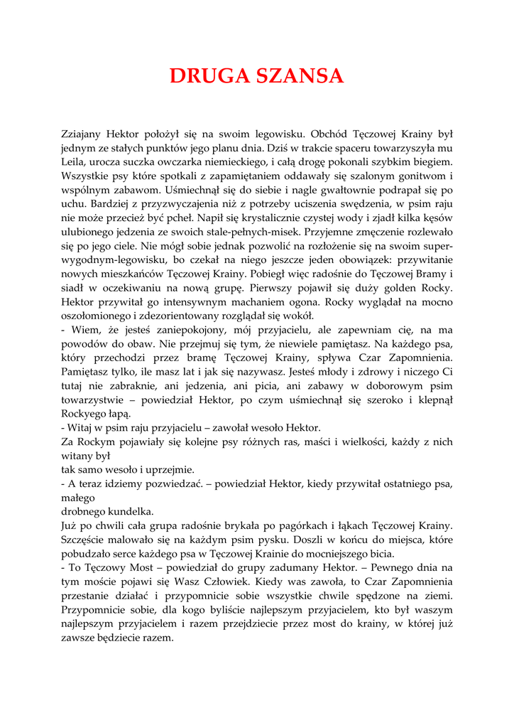 DRUGA SZANSA Zziajany Hektor położył się na swoim legowisku. Obchód Tęczowej Krainy był jednym ze stałych punktów jego planu dnia. Dziś w trakcie spaceru towarzyszyła mu Leila, urocza suczka owczarka niemieckiego, i całą drogę pokonali szybkim biegiem. Wszystkie psy które spotkali z zapamiętaniem oddawały się szalonym gonitwom i wspólnym zabawom. Uśmiechnął się do siebie i nagle gwałtownie podrapał się po uchu. Bardziej z przyzwyczajenia niż z potrzeby uciszenia swędzenia, w psim raju nie może przecież być pcheł. Napił się krystalicznie czystej wody i zjadł kilka kęsów ulubionego jedzenia ze swoich stale-pełnych-misek. Przyjemne zmęczenie rozlewało się po jego ciele. Nie mógł sobie jednak pozwolić na rozłożenie się na swoim superwygodnym-legowisku, bo czekał na niego jeszcze jeden obowiązek: przywitanie nowych mieszkańców Tęczowej Krainy. Pobiegł więc radośnie do Tęczowej Bramy i siadł w oczekiwaniu na nową grupę. Pierwszy pojawił się duży golden Rocky. Hektor przywitał go intensywnym machaniem ogona. Rocky wyglądał na mocno oszołomionego i zdezorientowany rozglądał się wokół. - Wiem, że jesteś zaniepokojony, mój przyjacielu, ale zapewniam cię, na ma powodów do obaw. Nie przejmuj się tym, że niewiele pamiętasz. Na każdego psa, który przechodzi przez bramę Tęczowej Krainy, spływa Czar Zapomnienia. Pamiętasz tylko, ile masz lat i jak się nazywasz. Jesteś młody i zdrowy i niczego Ci tutaj nie zabraknie, ani jedzenia, ani picia, ani zabawy w doborowym psim towarzystwie – powiedział Hektor, po czym uśmiechnął się szeroko i klepnął Rockyego łapą. - Witaj w psim raju przyjacielu – zawołał wesoło Hektor. Za Rockym pojawiały się kolejne psy różnych ras, maści i wielkości, każdy z nich witany był tak samo wesoło i uprzejmie. - A teraz idziemy pozwiedzać. – powiedział Hektor, kiedy przywitał ostatniego psa, małego drobnego kundelka. Już po chwili cała grupa radośnie brykała po pagórkach i łąkach Tęczowej Krainy. Szczęście malowało się na każdym psim pysku. Doszli w końcu do miejsca, które pobudzało serce każdego psa w Tęczowej Krainie do mocniejszego bicia. - To Tęczowy Most – powiedział do grupy zadumany Hektor. – Pewnego dnia na tym moście pojawi się Wasz Człowiek. Kiedy was zawoła, to Czar Zapomnienia przestanie działać i przypomnicie sobie wszystkie chwile spędzone na ziemi. Przypomnicie sobie, dla kogo byliście najlepszym przyjacielem, kto był waszym najlepszym przyjacielem i razem przejdziecie przez most do krainy, w której już zawsze będziecie razem. Wszystkie psy aż podskakiwały z emocji patrząc na Tęczowy Most. Hektora, jak za każdym razem, gdy odwiedzał to miejsce, ogarniała niesamowita tęsknota. Nie potrafił powiedzieć ile czasu upłynęło od momentu, gdy zobaczył most po raz pierwszy. Wiedział tylko, że czeka już długo, bardzo długo. Bywał tutaj codziennie. Przychodził, patrzył i ze spuszczonym ogonem odchodził. Co ciekawe, ostatnio coraz więcej psów zaczynało zachowywać się tak, jak on. Ich oczy, zazwyczaj beztroskie i wesołe, przy moście były pełne łez. I wszystkie te psy nadal czekały. Codziennie przez most przechodziło wiele psów, ale nie było wśród nich żadnego z „tęskniących”, jak nazwał siebie i swoich mostowych współtowarzyszy. Oprowadzenie można było uznać za zakończone, Hektor przekazał swoim podopiecznym już wszystko co powinni wiedzieć. Wesoła grupka nowych mieszkańców psiego raju pobiegła w szaleńczym pędzie przez zielone wzgórza i doliny. Hektor wrócił do siebie, jednak tym razem jego super-wygodne-legowisko jakoś mocno go uwierało. Wstał więc i poszedł na nocny spacer nad rzekę, której szum pozwalał mu ukoić tęsknotę, którą czuł tak mocno po każdej wizycie przy Tęczowym Moście. W jego ulubionym miejscu siedział jakiś olbrzymi pies. - Mogę usiąść obok ciebie? – zapytał. - Siadaj – usłyszał w odpowiedzi. Usiadł więc obok i aż stęknął kiedy zobaczył, obok kogo usiadł. Był to we własnej osobie Król Leon, władca Tęczowej Krainy. Po chwili zaskoczenia Hektor postanowił skorzystać z okazji i opowiedzieć mu o tym co czuje. - Królu – powiedział – od dłuższego czasu zadaję sobie coraz częściej pewne pytania. Nie potrafię znaleźć na nie odpowiedzi. Może ty mi pomożesz? - Pytaj – odpowiedział Król Leon. - Zastanawiam się, dlaczego tak długo czekam na moment ,gdy na tęczowym moście pojawi się Mój Człowiek. Czasami mam wrażenie, że moje serce pęknie z tęsknoty. Dlaczego jest coraz więcej psów, które tak samo jak ja nie przechodzą przez most, pomimo tego że przebywają już tutaj naprawdę długo. Dlaczego mam wrażenie, że ten moment nigdy nie nastąpi? – powiedział drżącym głosem Hektor – I dlaczego w takich momentach mam wrażenie, że pęknie mi serce. Przecież jestem w psim raju – zakończył już ze łzami w oczach. Król Leon popatrzył na siedzącego obok niego psa swoimi wielkimi mądrymi oczami. - Masz wielkie serce mój przyjacielu – powiedział Król łagodnym i smutnym głosem. – Nawet Czar Zapomnienia, który ma wielką moc, nie potrafił sprawić, byś zapomniał o tęsknocie, którą czułeś prawie zawsze. Chodź, pokażę ci coś – powiedział łagodnie Król. Machnął ogonem i nagle znaleźli się na dużej zaśnieżonej polanie. - Gdzie jesteśmy? – zapytał zaskoczony Hektor. - Z powrotem na ziemi. W czasach kiedy na niej żyłeś. – powiedział Król – Nie powinienem cię tutaj zabierać, ale myślę, że powinieneś znać prawdę. Patrz uważnie – i swoim łbem wskazał skraj polany. Przy ogromnym drzewie siedział, a właściwie leżał przywiązany do drzewa olbrzymi bernardyn. Sznur wżarł mu się w szyję i spowodował olbrzymie zaropiałe rany. Pies był przeraźliwie chudy i było widać, że trzyma się życia resztkami sił. Rozpaczli