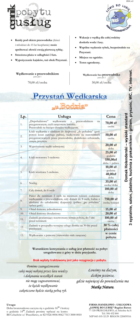 cennik 2014, v.2 & pobytu usług Każdy pod okiem przewodnika (dzieci i młodzież do 15 lat bezpłatnie) może spróbować złowić swoją pierwszą rybkę. Strzeżona plaża w odległości 3 km. Wypożyczanie kajaków, tuż obok Przystani. Wakacje z wędką dla całej rodziny dookoła woda i lasy. Wspólne wędzenie rybek, bezpośrednio na Przystani. Miejsce na ognisko. Teren ogrodzony. Wędkowanie z przewodnikiem Wędkowanie bez przewodnika patrz pkt 1 patrz pkt 2 70,00 zł/osoba Lp. 1. 2. 3. 50,00 zł/osoba Usługa Cena „Dopołudniowe” wędkowanie z przewodnikiem na przygotowanym, czyli zanęconym łowisku. Przewodnik na bieżąco doradza wędkującym. Łódź wędkarska z silnikiem do dyspozycji „do południa” (gość ponosi koszt zużytego paliwa), wędkowanie na stanowiskach przygotowywanych przez przewodnika, dodatkowo echosonda, zanęta, przynęta. 70,00 zł osoba 50,00 zł osoba 20,00 zł Wypożyczenie wędki uzbrojonej doba 25,00 zł 4. godzina Łódź motorowa 3 osobowa 150,00zł doba + paliwo 10,00 zł 5. godzina Łódź wiosłowa 3 osobowa 40,00zł doba 6. Nocleg 7. Cały domek, do 8 osób 8. 9. 10. 11. 35,00 zł osoba/doba 180,00 zł doba Pakiet dla minimum 2 osób na minimum tydzień: codzienne wędkowanie z przewodnikiem, cały domek do 8 osób, łodzie z silnikami do całodziennej dyspozycji (paliwo „po południu” opłaca gość) Obiad domowy jednodaniowy Obiad domowy dwudaniowy Zadatek gwarantujący rezerwowany termin pobytu, do 7 dni przed terminem 12. Zadatek w przypadku wynajmu całego domku na 30 dni przed przybyciem 13. Wędkowanie z pomostu (stanowisko stale zanęcane) 750,00 zł osoba/tydzień 15,00 zł 20,00 zł 100,00 zł osoba 30 % całej płatności w cenie pobytu Domek Holenderski – wysoki standard 3 sypialnie, salon, jadalnia, kuchnia z piekarnikiem i grillem, prysznic, WC, TV, internet. Warunkiem korzystania z usług jest płatność za pobyt uregulowana z góry w dniu przyjazdu. Brak wpłaty traktowany jest jako rezygnacja z pobytu. Pomimo zaangażowania całej mojej nabytej przez lata wiedzy i dokonania wszelkich starań nie mogę zagwarantować, że każde wędkowanie zakończone będzie siatką pełną ryb. Łowimy na dużym, dzikim jeziorze, gdzie najwięcej do powiedzenia ma Matka Natura. Uwaga: Doba kwaterunkowa zaczyna się o godzinie 1600 i kończy o godzinie 1400. Zadatek prosimy wpłacać na konto: BS Człuchów o/ Przechlewo, nr 82 9326 0006 0062 7513 3000 0010 FIRMA HANDLOWO - USŁUGOWA „ŁOWIĘ BO LUBIĘ” Bogdan Barton 77-320 PRZECHLEWO, ul. Szkolna 4a/6 Tel. 506 432 844 NIP 843-105-32-29 REGON 220859516