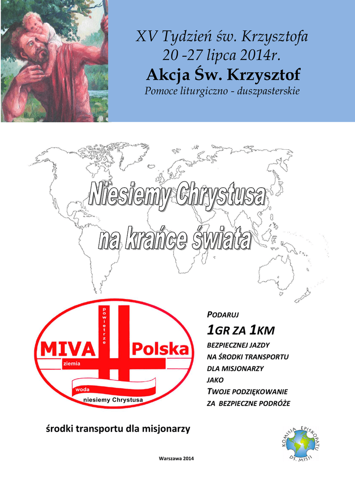 XV Tydzień św. Krzysztofa 20 -27 lipca 2014r. Akcja Św. Krzysztof Pomoce liturgiczno - duszpasterskie PODARUJ 1GR ZA 1KM BEZPIECZNEJ JAZDY NA ŚRODKI TRANSPORTU DLA MISJONARZY JAKO TWOJE PODZIĘKOWANIE ZA BEZPIECZNE PODRÓŻE środki transportu dla misjonarzy Warszawa 2014 Z historii MIVA Początki MIVA1 wiążą się z postacią pochodzącego z Niemiec zakonnika ze Zgromadzenia Oblatów Maryi Niepokalanej ojca Pawła Schulte OMI (1896-1975). To właśnie on stał się założycielem MIVA. Misje były jego życiową pasją. Oprócz tego był pasjonatem latania, stąd też nazywano go „Latającym ojcem”. Inspiracją i motywem do rozpoczęcia dzieła wyposażenia katolickich misjonarzy w nowoczesne środki transportu było boleśnie przeżyte w 1925 roku doświadczenie śmierci młodego misjonarza, pracującego w ówczesnej Południowo – Zachodniej Afryce, dzisiejszej Namibii, wśród ludów Ovambo, ojca Otto Fuhrmanna OMI, który był dobrym kolegą ojca Pawła z lat dzieciństwa i młodości. Ojciec Otto niespodziewanie ciężko zachorował w czasie jednej z wypraw misyjnych. Aby dotrzeć do najbliższego szpitala wieziono go najpierw wozem ciągniętym przez woły, a potem tragarze nieśli chorego na prowizorycznych noszach. Cała podróż trwała pięć dni. Niestety, pomoc przyszła za późno. Ojciec Otto umiera mając zaledwie 30 lat. Wtedy o. Schulte rozważając całe wydarzenie w duchu postanawia sobie: „Sieć komunikacyjna na misjach musi zostać zmotoryzowana. Czas karawan ciągniętych przez woły oraz psich zaprzęgów, tak malowniczy – jakby się mogło niektórym wydawać – przeminął. Ale misjonarze nie mogą wystarać się sami o drogie środki komunikacji. Musi więc w rodzinnym kraju powstać organizacja, która zbiera środki na motoryzację pracy misyjnej”. Od tego czasu dążył do powstania takiej organizacji, która ostatecznie została założona w 1927 roku ze swoją siedzibą w Kolonii. Otrzymała ona nazwę MIVA (Mission Vehicle Association). Mottem nowo założonej MIVA było hasło: „Naprzeciw Chrystusa, na ziemi, na wodzie i w powietrzu”(Obviam Christo terra marique et in aera). W okresie drugiej wojny światowej tą ideą o. Schulte zainteresował się w Austrii, pochodzący z małego miasteczka Stadle-Paura, świecki katolik, ojciec rodziny, Karl Kumpfmüller, który na rowerze z prostym aparatem do wyświetlania filmów misyjnych i ulotkami misyjnymi objeżdżał okolicę i zapalał ludzi do pomocy misjonarzom w zakupie pojazdów na misje. W zbieranie środków początkowo zaangażował młodzieżowe grupy kolędników tzw. „Sternsinger”, stąd też został nazwany „kolędującym dziadkiem”. Później inicjuje i tworzy kampanię zwaną „Akcja św. Krzysztof – 1 grosz za 1 szczęśliwie przejechany kilometr”(Christophorus Aktion), aby móc realizować założone cele pomocy misjonarzom. MIVA Austria została zatwierdzona przez austriackich biskupów i oficjalnie założona w roku 1949. MIVA powstała także w innych krajach, m.in. w Szwajcarii, Holandii, Anglii, Słowenii, Korei, Polsce, Australii. Są to organizacje działające niezależnie, choć współpracujące ze sobą. MIVA Polska powstała w roku Wielkiego Jubileuszu 20002. Co to jest Akcja Św. Krzysztof? Akcja św. Krzysztof jest to apel, z którym zwraca się MIVA do Kierowców i użytkowników pojazdów mechanicznych, aby jeździli ostrożnie i bezpiecznie, a w duchu wdzięczności Bogu za bezpieczne podróże złożyli 1 grosz za 1 kilometr jazdy bez wypadku na środki transportu dla misjonarzy. Akcja ta jest prowadzona z okazji wspomnienia św. Krzysztofa, patrona kierowców i podróżujących. W parafiach odbywa się wtedy coroczne poświęcenie pojazdów i błogosławieństwo kierowców ze zbiórką na pomoc misjonarzom. 1 Przedruk za: J. Kraśnicki, MIVA Polska i pomoc polskim misjonarzom w Brazylii, w: B. Kieżel, Ewangelizacja i Afrobrazylijczycy, Białystok 2014, s. 176-177. Liturgia Mszy Św. za Kierowców i Podróżujących z okazji obchodów 15. Tygodnia św. Krzysztofa (z parafialnym błogosławieństwem Kierowców i poświęceniem pojazdów) Wprowadzenie do liturgii Gromadzimy się wokół ołtarza w imię naszego Pana Jezusa Chrystusa. Świętujemy Jego nieustanną obecność z nami i Jego niezgłębioną miłość do każdego człowieka i dziękujemy Bogu za troskę o człowieka i wszystkie Jego potrzeby, zarówno ziemskie jak i nadprzyrodzone. W duchu tego Bożego „zatroskania” otaczamy dziś – z okazji 15. Tygodnia św. Krzysztofa – naszą serdeczną modlitwą wszystkich kierowców i podróżujących. Z wiarą prosimy o opiekę i błogosławieństwo Boże na każdą naszą podróż, chociażby tę krótką i codzienną, by dobry Bóg zachował nas od niebezpieczeństw, a zwłaszcza wypadków drogowych. Podziękujmy Bogu za każdy pojazd, który posiadamy lub mamy do dyspozycji. Nade wszystko zaś bądźmy wdzięczni za każdą szczęśliwą podróż, za uchronienie nas od wypadków. W duchu tej wdzięczności weźmy dziś udział w Akcji św. Krzysztof i podarujmy 1 grosz za każdy kilometr bezwypadkowej jazdy na środki transportu dla misjonarzy. Niech nasz pomoc ułatwi misjonarzom pracę i niesienie Dobrej Nowiny ludziom na krańcach świata. Do aktu pokutnego Aby nasza modlitwa i uczestnictwo w świętej liturgii mogło być miłe Bogu i owocne dla nas, z pokorą uznajmy przed Bogiem nasze grzechy, winy i zaniedbania. Dziś zapytajmy siebie szczególnie o to, czy troszczymy się o zasady bezpiecznego podróżowania? Jak korzystamy z naszych dróg i pojazdów? jakimi jesteśmy kierowcami? Przepraszajmy Boga przede wszystkim: za egoistyczne używanie pojazdów, często jedynie dla zaspokojenia swoich zachcianek i zaniedbywanie służby i pomocy bliźnim w potrzebie, za grzechy brawurowej i nieodpowiedzialnej jazdy i stwarzanie zagrożenia dla zdrowia i życia swojego oraz innych użytkowników dróg, za grzechy nietrzeźwości za k