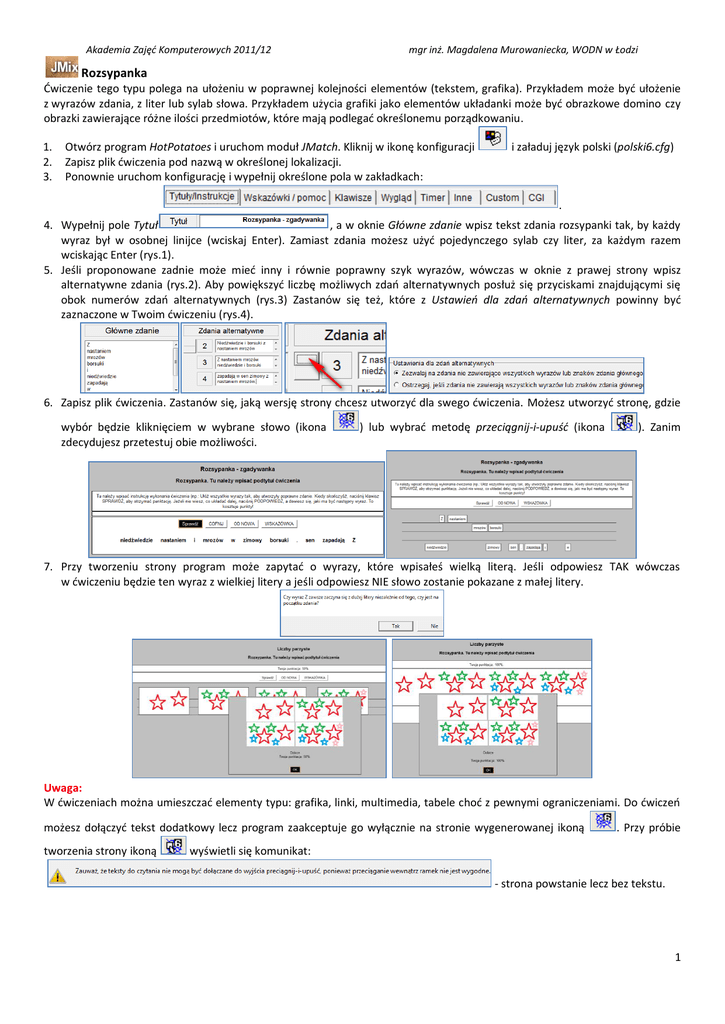 Akademia Zajęć Komputerowych 2011/12 mgr inż. Magdalena Murowaniecka, WODN w Łodzi Rozsypanka Ćwiczenie tego typu polega na ułożeniu w poprawnej kolejności elementów (tekstem, grafika). Przykładem może byd ułożenie z wyrazów zdania, z liter lub sylab słowa. Przykładem użycia grafiki jako elementów układanki może byd obrazkowe domino czy obrazki zawierające różne ilości przedmiotów, które mają podlegad określonemu porządkowaniu. 1. 2. 3. Otwórz program HotPotatoes i uruchom moduł JMatch. Kliknij w ikonę konfiguracji Zapisz plik dwiczenia pod nazwą w określonej lokalizacji. Ponownie uruchom konfigurację i wypełnij określone pola w zakładkach: i załaduj język polski (polski6.cfg) . 4. Wypełnij pole Tytuł , a w oknie Główne zdanie wpisz tekst zdania rozsypanki tak, by każdy wyraz był w osobnej linijce (wciskaj Enter). Zamiast zdania możesz użyd pojedynczego sylab czy liter, za każdym razem wciskając Enter (rys.1). 5. Jeśli proponowane zadnie może mied inny i równie poprawny szyk wyrazów, wówczas w oknie z prawej strony wpisz alternatywne zdania (rys.2). Aby powiększyd liczbę możliwych zdao alternatywnych posłuż się przyciskami znajdującymi się obok numerów zdao alternatywnych (rys.3) Zastanów się też, które z Ustawieo dla zdao alternatywnych powinny byd zaznaczone w Twoim dwiczeniu (rys.4). 6. Zapisz plik dwiczenia. Zastanów się, jaką wersję strony chcesz utworzyd dla swego dwiczenia. Możesz utworzyd stronę, gdzie wybór będzie kliknięciem w wybrane słowo (ikona zdecydujesz przetestuj obie możliwości. ) lub wybrad metodę przeciągnij-i-upuść (ikona ). Zanim 7. Przy tworzeniu strony program może zapytad o wyrazy, które wpisałeś wielką literą. Jeśli odpowiesz TAK wówczas w dwiczeniu będzie ten wyraz z wielkiej litery a jeśli odpowiesz NIE słowo zostanie pokazane z małej litery. Uwaga: W dwiczeniach można umieszczad elementy typu: grafika, linki, multimedia, tabele chod z pewnymi ograniczeniami. Do dwiczeo możesz dołączyd tekst dodatkowy lecz program zaakceptuje go wyłącznie na stronie wygenerowanej ikoną tworzenia strony ikoną . Przy próbie wyświetli się komunikat: - strona powstanie lecz bez tekstu. 1