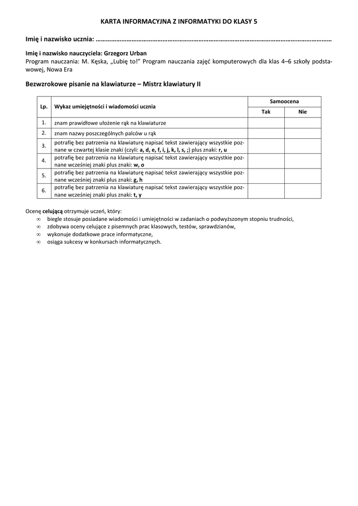 KARTA INFORMACYJNA Z INFORMATYKI DO KLASY 5 Imię i nazwisko ucznia: ………………………………………………………………………………………………………………………… Imię i nazwisko nauczyciela: Grzegorz Urban Program nauczania: M. Kęska, „Lubię to!” Program nauczania zajęć komputerowych dla klas 4–6 szkoły podstawowej, Nowa Era Bezwzrokowe pisanie na klawiaturze – Mistrz klawiatury II Samoocena Lp. Wykaz umiejętności i wiadomości ucznia Tak 1. znam prawidłowe ułożenie rąk na klawiaturze 2. znam nazwy poszczególnych palców u rąk 3. 4. 5. 6. potrafię bez patrzenia na klawiaturę napisać tekst zawierający wszystkie poznane w czwartej klasie znaki (czyli: a, d, e, f, i, j, k, l, s, ;) plus znaki: r, u potrafię bez patrzenia na klawiaturę napisać tekst zawierający wszystkie poznane wcześniej znaki plus znaki: w, o potrafię bez patrzenia na klawiaturę napisać tekst zawierający wszystkie poznane wcześniej znaki plus znaki: g, h potrafię bez patrzenia na klawiaturę napisać tekst zawierający wszystkie poznane wcześniej znaki plus znaki: t, y Ocenę celującą otrzymuje uczeń, który: • biegle stosuje posiadane wiadomości i umiejętności w zadaniach o podwyższonym stopniu trudności, • zdobywa oceny celujące z pisemnych prac klasowych, testów, sprawdzianów, • wykonuje dodatkowe prace informatyczne, • osiąga sukcesy w konkursach informatycznych. Nie KARTA INFORMACYJNA Z INFORMATYKI DO KLASY 5 Imię i nazwisko ucznia: ………………………………………………………………………………………………………………………… Imię i nazwisko nauczyciela: Grzegorz Urban Program nauczania: M. Kęska, „Lubię to!” Program nauczania zajęć komputerowych dla klas 4–6 szkoły podstawowej, Nowa Era Przeglądarka plików graficznych IrfanView Samoocena Lp. Wykaz umiejętności i wiadomości ucznia Tak 1. wiem co to jest przeglądarka plików graficznych 2. potrafię otworzyć plik graficzny w programie IrfanView 3. umiem obrócić plik graficzny w lewą lub prawą stronę o kąt 90° lub jego wielokrotność używając do tego programu IrfanView potrafię za pomocą programu IrfanView wykadrować dowolny fragment pliku graficznego znam różne metody zmiany rozmiarów pliku graficznego za pomocą programu IrfanView 4. 5. 6. 7. 8. umiem zrobić zrzut ekranowy i wiem jak go otworzyć w programie IrfanView potrafię wyciąć (usunąć) dowolny fragment pliku graficznego za pomocą programu IrfanView wiem jakie funkcje w programie IrfanView mają klawisze Enter, Escape oraz strzałki Ocenę celującą otrzymuje uczeń, który: • biegle stosuje posiadane wiadomości i umiejętności w zadaniach o podwyższonym stopniu trudności, • zdobywa oceny celujące z pisemnych prac klasowych, testów, sprawdzianów, • wykonuje dodatkowe prace informatyczne, • osiąga sukcesy w konkursach informatycznych. Nie KARTA INFORMACYJNA Z INFORMATYKI DO KLASY 5 Imię i nazwisko ucznia: ………………………………………………………………………………………………………………………… Imię i nazwisko nauczyciela: Grzegorz Urban Program nauczania: M. Kęska, „Lubię to!” Program nauczania zajęć komputerowych dla klas 4–6 szkoły podstawowej, Nowa Era Program Total Commander (TC) Samoocena Lp. Wykaz umiejętności i wiadomości ucznia Tak 1. wiem co to jest „Menadżer Plików” 2. potrafię otworzyć w dowolnym oknie programu TC dostępne nośniki danych 3. umiem szybko otworzyć katalog Pulpit w jednym z okien programu TC 4. potrafię utworzyć dowolną strukturę katalogów na dysku z użyciem programu TC 5. umiem poruszać się po drzewie katalogów w programie TC 6. potrafię skopiować dowolny plik lub katalog z użyciem programu TC 7. potrafię przenieść dowolny plik lub katalog z użyciem programu TC 8. potrafię skasować dowolny plik lub katalog z użyciem programu TC 9. wiem jak zaznaczyć więcej niż jeden plik lub katalog w celu ich skopiowania, przeniesienia lub skasowania z użyciem programu TC 10. umiem zmienić nazwę istniejącego pliku lub katalogu z użyciem programu TC 11. wiem jak z użyciem programu TC wyszukać plik znajdujący się na dostępnym nośniku danych 12. potrafię z użyciem programu TC utworzyć plik tekstowy 13. umiem wykonać podgląd i edycję zawartości pliku w programie TC 14. potrafię obsługiwać program TC bez używania myszki 15. wiem co to jest i do czego służy lokalna sieć komputerowa i potrafię z niej korzystać z użyciem programu TC 16. wiem co to jest serwer FTP 17. potrafię utworzyć nowe połączenie do wybranego serwera FTP z użyciem programu TC 18. umiem zalogować się do wybranego serwera FTP z użyciem programu TC 19. potrafię umieścić utworzoną stronę www na serwerze FTP z użyciem programu TC Ocenę celującą otrzymuje uczeń, który: • biegle stosuje posiadane wiadomości i umiejętności w zadaniach o podwyższonym stopniu trudności, • zdobywa oceny celujące z pisemnych prac klasowych, testów, sprawdzianów, • wykonuje dodatkowe prace informatyczne, • osiąga sukcesy w konkursach informatycznych. Nie KARTA INFORMACYJNA Z INFORMATYKI DO KLASY 5 Imię i nazwisko ucznia: ………………………………………………………………………………………………………………………… Imię i nazwisko nauczyciela: Grzegorz Urban Program nauczania: M. Kęska, „Lubię to!” Program nauczania zajęć komputerowych dla klas 4–6 szkoły podstawowej, Nowa Era Tworzenia i edycja stron www z użyciem programu Web Builder Samoocena Lp. Wykaz umiejętności i wiadomości ucznia Tak 1. wiem co oznacza skrót WYSIWYG 2. potrafię wytłumaczyć czym charakteryzuje się program typu WYSIWYG 3. wiem jak skonfigurować sobie program Web Builder, aby na ekranie widoczne były wszystkie potrzebne do pracy elementy (linijka, siatka, paski narzędz