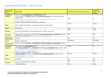 JADŁOSPIS DEKADOWY – SEZON LETNI DEKADA II LATO Śniadanie Dzień I Opis dania Gramatura porcji – dzieci przedszkolne Gramatura porcji – dzieci szkolne Kasza manna pszenna(gluten) 30g, mleko(mleko) 200 ml Pieczywo mieszane (pszenica, żyto) (30g) z masłem 82%(mleko) (5g), wędlina (20g), zielony ogórek (15g) Dieta bezmleczna : kasza manna na wywarze warzywnym , chleb z margaryná Dieta bezglutenowa : chleb bezglutenowy Herbata z hibiskusa (200ml), miód pszczeli naturalny(5g) Obok X 250 ml 350 ml 1 szt. 230g 1 szt. 250g Zupa Zupa z młodych ziemniaków i młodej kapusty białej z natką pietruszki Owoc Brzoskwinia II danie Ryż biały i pełnoziarnisty z sosem pomidorowym z cukinią i warzywami Surówka ogórki zielone, biała rzodkiew, cykoria, jabłko, sezam prażony(sezam) ,jogurt(mleko) greckim, natka pietruszki, kiełki lucerny Dieta bezmleczna: bez jogurtu/ oliwa 80g 80g Warzywa na ciepło / owoc Brokuły 50g 50g Napój Kompot z nektarynki 10g/200ml 15g/250ml Podwieczorek Śniadanie Dzień II Zupa Owoc II danie Pieczywo mieszane (pszenno – żytnie(gluten)z masłem 82%(mleko), twaróg(mleko), papryka X Kasza jaglana 30g, mleko(mleko) 200 ml Chleb pszenny(gluten) (30g), z masłem 82% (masło)(5g), ser żółty(mleko) (20 g), pomidor (15g) Dieta bezmleczna : kasza jaglana na wodzie z sokiem , chleb z margaryną, wędlina wieprzowa Dieta bezglutenowa : chleb bezglutenowy Herbata rumiankowa (200ml), miód pszczeli Zupa krem(mleko) z kalarepy z groszkiem ptysiowym/grzanki (gluten) i natką pietruszki Dieta bezmleczna : niezabielana, Dieta bezglutenowa : bez groszku Obok X 250 ml 350 ml Truskawki 50g 50g 70g 90g 130 g 180g Szynka wieprzowa pieczona w ziołach ziemniaki z koprem 1 *oznaczono alergeny zgodnie z załącznikiem II do Rozporządzenia 1169/2011 dot. przekazywania informacji konsumentowi na temat żywności JADŁOSPIS DEKADOWY – SEZON LETNI 80g Gramatura porcji – dzieci szkolne 80g 50g 50g Kompot z wiśni sok wyciskany owocowy (marchewka , jab Kasza kukurydziana 30g, mleko(mleko) 200 ml Pieczywo mieszane (pszenne białe i graham(gluten)(30 g), z masłem(masło) 82%(5 g), jajko(jaja) (20g), ogórek kiszony (20 g) Herbata z lipy (200ml), miód pszczeli naturalny(5g Dieta bezmleczna : kasza kukurydziana na rosole , chleb z margaryną, Dieta bezglutenowa : chleb bezglutenowy 10g/200ml 100ml/ 50ml/50 ml Obok 15g/250ml X X Zupa brokułowa z ziemniakami zabielana jogurtem(mleko) z zielem angielskim, liściem laurowym Dieta bezmleczna : niezabielana Arbuz 250 ml 100g 70g 350 ml 1g 100g 90g 65g/65g 90g/90g 80g 80g 50g/2g 50g/2g 10g/ liść/ 200ml 15g/liść/250ml 2szt/ 30g/10g/5g X obok X DEKADA II LATO Opis dania Surówka kapusta pekińska, zielony ogórek, marchewka, jabłko, pestki dyni prażone, oliwa z oliwek z pierwszego tłoczenia, natka pietruszki Warzywa na ciepło / owoc Napój Podwieczorek Śniadanie Dzień III Zupa Owoc II danie Marchewka na parze Ryba(ryba( filet pieczony z mintaja mintaj w jarzynach po grecku ryż na sypko biały i brązowy Surówka Warzywa na ciepło / owoc Napój Podwieczorek Śniadanie Dzień IV Gramatura porcji – dzieci przedszkolne buraczki młode, ananas, cebulka, kalarepa sok z cytryny i olejem rzepakowym nierafinowanym, natka pietruszki, płatki migdałów(orzech) prażone , kiełki grochu Cukinia pieczona z oliwą Kompot jabłkowy z miętą Wafel ryżowy, twaróg(mleko) , truskawki, banan Dieta bezmleczna : tylko mus Płatki ryżowe 30g, mleko(mleko) 200 ml Chleb pszenny razowy(gluten) (30 g), z masłem 82%(masło) (5 g), wędlina drobiowa (40g), ogórek zielony (15g) Herbata malinowa (200ml), miód pszczeli naturalny(5g) 2 *oznaczono alergeny zgodnie z załącznikiem II do Rozporządzenia 1169/2011 dot. przekazywania informacji konsumentowi na temat żywności JADŁOSPIS DEKADOWY – SEZON LETNI DEKADA II LATO Opis dania Gramatura porcji – dzieci przedszkolne Gramatura porcji – dzieci szkolne 250 ml 350 ml 1 szt. 1 szt. 70g 80g 130 g 180g 80g 80g 50g 50g 10g/200ml 40g/40g/100g/20g 15g/250ml X Obok X 250 ml 350 ml 100g 100g Dieta bezmleczna : kasza jaglana na wodzie z sokiem , chleb z margaryną, Dieta bezglutenowa : chleb bezglutenowy Zupa Zupa ryżowa z pieczoną papryką, natka pietruszki z kolorowym pieprzem Owoc jabłko II danie Potrawka(gluten) drobiowa z warzywami (zielony groszek, fasolka szparagowa zółta, brokuł, pomidory, czosnek) Dieta bezglutenowa : mąka kukurydziana ziemniaki puree(mleko) Dieta bezmleczna : margaryna Surówka Warzywa na ciepło / owoc Napój Podwieczorek DZIEŃ 5 Śniadanie Młoda kapusta biała, marchewka, rzepa, jabłko ziarna słonecznika prażone z oliwą z oliwek z pierwszego tłoczenia, natka pietruszki, kiełki lucerny bakłażan pieczony Kompot z malin kisiel z musu owocowego(banan, woda , truskawki , mąka ziemniaczana) Kakao 2g, mleko(mleko) 200 ml, miód pszczeli naturalny(5g) Chleb żytni(gluten) (30 g), z masłem (masło) (5 g), wędlina (20g), papryka (15g), szczypior Dieta bezmleczna : kasza kukurydziana na rosole , chleb z margaryną, Dieta bezglutenowa : chleb bezglutenowy Zupa Zupa z czerwonej soczewicy i ziemniaków z koperkiem z liściem laurowym i cząbrem Owoc melon 3 *oznaczono alergeny zgodnie z załącznikiem II do Rozporządzenia 1169/2011 dot. przekazywania informacji konsumentowi na temat żywności JADŁOSPIS DEKADOWY – SEZON LETNI 220g Gramatura porcji – dzieci szkolne 250g 80g 80g 50g 50g 5g/200ml 40g/40g/20g/80g/ 10g/30g Obok 7,5g250ml X 250 ml 350 ml 50g 50g 70g/ 90g 40 ml/ 10g 40 ml / 10g ziemniaki 130 g 180g czerwona kapusta, cebulka, jabłko, por, sezam(sezam), jogurt grecki(mleko), natka pietruszki Dieta bezmleczna : bez jogurtu / oliwa 80g 80g DEKADA II LATO Opis dania II danie Pierogi ruskie(gluten, jaja , mleko) + jogurt naturalny (mleko) Dieta bezmleczna :pyzy ziemniaczane / tłuszczyk Dieta bezglutenowa : mąka gryczana Surówka Marchewka, cykoria, zielone oliwki, pestki dyni prażone , tarta dynia ,sok z cytryny, olej rzepakowy nierafinowany, natka
