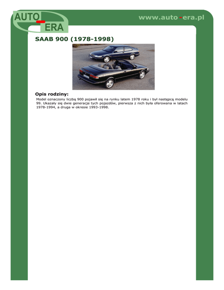 www.auto - era.pl SAAB 900 (1978-1998) Opis rodziny: Model oznaczony liczbą 900 pojawił się na rynku latem 1978 roku i był następcą modelu 99. Ukazały się dwie generacje tych pojazdów, pierwsza z nich była oferowana w latach 1978-1994, a druga w okresie 1993-1998.