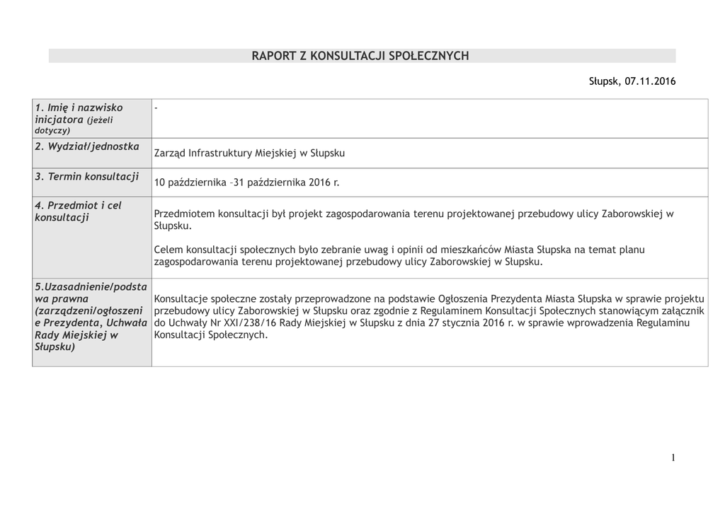 RAPORT Z KONSULTACJI SPOŁECZNYCH Słupsk, 07.11.2016 1. Imię i nazwisko inicjatora (jeżeli - dotyczy) 2. Wydział/jednostka 3. Termin konsultacji 4. Przedmiot i cel konsultacji Zarząd Infrastruktury Miejskiej w Słupsku 10 października –31 października 2016 r. Przedmiotem konsultacji był projekt zagospodarowania terenu projektowanej przebudowy ulicy Zaborowskiej w Słupsku. Celem konsultacji społecznych było zebranie uwag i opinii od mieszkańców Miasta Słupska na temat planu zagospodarowania terenu projektowanej przebudowy ulicy Zaborowskiej w Słupsku. 5.Uzasadnienie/podsta wa prawna (zarządzeni/ogłoszeni e Prezydenta, Uchwała Rady Miejskiej w Słupsku) Konsultacje społeczne zostały przeprowadzone na podstawie Ogłoszenia Prezydenta Miasta Słupska w sprawie projektu przebudowy ulicy Zaborowskiej w Słupsku oraz zgodnie z Regulaminem Konsultacji Społecznych stanowiącym załącznik do Uchwały Nr XXI/238/16 Rady Miejskiej w Słupsku z dnia 27 stycznia 2016 r. w sprawie wprowadzenia Regulaminu Konsultacji Społecznych. 1 RAPORT Z KONSULTACJI SPOŁECZNYCH 6. Metoda przeprowadzenia konsultacji (opis) Konsultacje odbyły się w czterech formach: - udostępnienia projektu zagospodarowania terenu na Biuletynie Informacji Publicznej Miasta Słupska, na stronach www.slupsk.pl i www.zimslupsk.com oraz na fanpage’u Miasta Słupska na portalu Facebook; - udostępnienia do wglądu projektu zagospodarowania terenu w formie papierowej w siedzibie Zarządu Infrastruktury Miejskiej w Słupsku; - otwartego spotkania z mieszkańcami Miasta Słupska, które odbyło się 17.10.2016 r. w Zespole Szkół Ogólnokształcących nr 3 w Słupsku; - zgłaszania uwag do dokumentu w formie elektronicznej bądź papierowej. 7. Akcja informacyjna (opis) Informacja dotycząca konsultacji została ogłoszona na Biuletynie Informacji Publicznej Miasta Słupska, na stronach www.slupsk.pl i www.zimslupsk.com, na fanpage’u Miasta Słupska na portalu Facebook oraz w lokalnych mediach. 8. Harmonogram spotkania/spotkań (scenariusz konsultacji) 9. Liczba osób biorących udział w konsultacjach/liczba uwag Otwarte spotkanie z mieszkańcami Miasta Słupska odbyło się 17.10.2016 r. w Zespole Szkół Ogólnokształcących nr 3 w Słupsku. a) mieszkańcy - 15 b) przedstawiciele ZIM - 1 c) przedstawiciele Urzędu Miejskiego - 2 d) autor projektu - 1 razem: 19 osób 2 RAPORT Z KONSULTACJI SPOŁECZNYCH Uwagi zgłoszone w formie ustnej na spotkaniu: a) mieszkańcy - 5 Uwagi zgłoszone w formie pisemnej: a) mieszkańcy – 22 b) instytucje, organizacje, firmy prywatne - 13 10.UWAGI ZGŁASZANE PRZEZ UCZESTNIKÓW 1. Zgłaszający uwagę 2. Część dokumentu, do którego zgłaszane są uwagi Mieszkańcy Słupska Koncepcja zagospodarowania terenu 3.Treść uwagi/opinii Parking przy przychodni 4. Propozycja zmian wraz z uzasadnieniem 5. Odpowiedź na uwagę Zwiększenie miejsc parkingowych Uwaga częściowo uwzględniona Projektowany układ i geometria jezdni zwiększają ilość miejsc postojowych w stosunku do stanu obecnego. Ponadto drogi publiczne nie służą wyłącznie do parkowania, obowiązek zapewnienia wymaganej liczby miejsc parkingowych spoczywa na właścicielu/zarządcy nieruchomości w ramach nieruchomości 3 RAPORT Z KONSULTACJI SPOŁECZNYCH Mieszkańcy Słupska Koncepcja zagospodarowania terenu Maksymalne wydłużenie zaprojektowanego parkingu Zwiększenie miejsc parkingowych Uwaga częściowo uwzględniona W projektowaniu zatok postojowych uwzględniono rosnące drzewa znajdujące się w pasie drogowym oraz wytyczne wynikające z przepisów prawa Mieszkańcy Słupska Koncepcja zagospodarowania terenu Miejsca dla niepełnosprawnych ulokować na początku i na końcu parkingu Udogodnienie dla niepełnosprawnych uczestników ruchu Uwaga częściowo uwzględniona Miejsca postojowe przystosowane do potrzeb osób niepełnosprawnych zostaną zlokalizowane po kilka z uwagi na konieczność zapewnienia dojść i dostosowanie konstrukcji Mieszkańcy Słupska Koncepcja zagospodarowania terenu Wyprofilować łuk zjazdu dla samochodów ciężarowych Ułatwienie dojazdu samochodów ciężarowych Uwaga nieuwzględniona Wjazd na teren nieruchomości zostanie w istniejącym kształcie Mieszkańcy Słupska Koncepcja zagospodarowania terenu Dodatkowe przejście dla pieszych Ułatwienie poruszania się pieszych Uwaga nieuwzględniona Zgodnie z wnioskami mieszkańców na spotkaniu przejście zostanie przesunięte na wysokość wejścia do budynku SM „Kolejarz”. W ciągu ulicy 4 RAPORT Z KONSULTACJI SPOŁECZNYCH Zaborowskiej będą zlokalizowane 3 przejścia dla pieszych: przy skrzyżowaniu z pętlą autobusową, na wysokości wejścia do budynku SM „Kolejarz” oraz na końcu przy skrzyżowaniu Zaborowskiej/Zaborowskiej Mieszkaniec Słupska Koncepcja zagospodarowania terenu Dodanie ciągu pieszego na rondzie Zauchy/Legionów (załącznik nr1) Dodanie powyższego ciągu wyeliminuje samowolne tworzenie ciągu pieszych. Brak powyższego ciągu sprawi, iż samochód będzie w pozycji bardziej uprzywilejowanej, a pieszy będzie musiał nadrabiać dodatkowe metry Z uwagi na konieczność wywłaszczeń gruntów zajętych pod ogrody działkowe, co wiąże się ze złożoną procedurą administracyjną oraz znaczącymi kosztami, ewentualna budowa chodnika po północnej stronie ulicy Legionów Polskich uwzględniona będzie w projekcie budowy ulicy Legionów Polskich od ulicy Piłsudskiego do ulicy Zauchy. Powyższy projekt określi możliwości terenowe budowy chodnika po północnej stronie drogi oraz będzie podstawą do kompleksowego wywłaszczenia gruntów zajętych pod ogrody 5 RAPORT Z KONSULTACJI SPOŁECZNYCH działkowe. Powyższa dokumentacja planowana jest do opracowania w 2017 r. Mieszkaniec Słupska Koncepcja zagospodarowania terenu Zmiana lokalizacji przejścia dla pieszych (załącznik nr2) Lepsze skomunikowanie z parkingami, budynkiem spółdzielni Uwaga częściowo uwzględniona Zgodnie z wnioskami mie