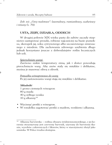 Zdrowie i uroda. Recepty babuni 95 Zob. też: „Octy toaletowe”: lawendowy, rumiankowy, szałwiowy i różany (s. 70). USTA, ZĘBY, DZIĄSŁA, ODDECH W drugiej połowie XIX wieku pasty do zębów zaczęły stopniowo zastępować proszki, robione najczęściej na bazie pumeksu, skorupek jaj, soku cytrynowego albo szczawiowego zmieszanego z miodem. Dla zachowania zdrowego uzębienia długo jednak korzystano jeszcze z dobrodziejstw roślin leczniczych lub soli. Spierzchnięte wargi Zarówno niskie temperatury zimą, jak i słońce powodują pierzchnięcie warg. Aby znów stały się miękkie i delikatne, można je masować oliwą z oliwek. Pomadka winogronowa do warg Po jej zastosowaniu wargi stają się miękkie i delikatne. Składniki 1 grono ciemnych winogron 80 g masła 40 g żółtego wosku 10 g alkanny14 • Wycisnąć pestki z winogron. • W rondelku zagotować pestki z masłem, woskiem i alkanną. 14 Alkanna barwierska – roślina obszaru śródziemnomorskiego, z jej korzenia otrzymywany jest czerwony barwnik, używany do barwienia tkanin, wyrobów cukierniczych i likierów, który w starożytności służył jako szminka. W Polsce trudno dostępna. 96 Zdrowie i uroda. Recepty babuni • Kiedy płyn zacznie gęstnieć, przecedzić najpierw przez sitko, potem przez cienką ściereczkę i przelać do małych pojemniczków, w których stwardnieje. Pasta do zębów z sodą Soda wybiela zęby i odświeża oddech. Wystarczy zanurzyć w niej wilgotną szczoteczkę do zębów. Aby jeszcze ulepszyć tę zastępczą pastę, można zmieszać w równych częściach sodę z miałką solą i dodać kroplę olejku cynamonowego, goździkowego lub rozmarynowego, który zdezynfekuje jamę ustną, pozostawiając jednocześnie przyjemny zapach. Chrupanie jabłek Jabłko to znakomita naturalna pasta do zębów: oczyszcza zęby i wzmacnia dziąsła. Świetny sposób na oczyszczenie zębów po posiłku, jeśli akurat nie ma się przy sobie szczoteczki! Masaż cytryną Dla wzmocnienia dziąseł dobrze jest masować je cienką cząstką cytryny. Nie jest to może najprzyjemniejsze, jeśli ktoś nie lubi kwaśnego smaku, ale za to jakie zdrowe! Nacieranie cytryną zębów raz w tygodniu wybiela je i nabłyszcza. Odważni powinni gryźć cytrynę przy każdej okazji: wzmacnia dziąsła, ułatwia usuwanie kamienia nazębnego i jest antyseptyczna. Czyszczenie zębów solą Zabrakło pasty do zębów? Można ją doskonale zastąpić solą morską: wzmacnia dziąsła i dokładnie czyści zęby. Czyszczenie zębów zieloną glinką Zmieszać zieloną glinkę z niewielką ilością wody, aby otrzymać gęstą papkę. Zanurzyć w niej włosie szczoteczki, wyszorować zęby i dobrze wypłukać. Zielona glinka wybiela zęby i odświeża oddech. Zdrowie i uroda. Recepty babuni 97 Zęby, irys i prawoślaz Suszone kłącza irysów były dawniej często używane, zwłaszcza na wsi. Zęby wielu pokoleń dzieci miały z nimi bliski kontakt, zaś palacze – chcąc je wybielić – nacierali je sproszkowanym korzeniem irysów. Henryk IV za radą swojego lekarza nacierał zęby korzeniem prawoślazu. Wzmacniająca pasta do zębów Składniki 4 główki goździków 1 łyżka sproszkowanej zielonej glinki • Rozgnieść dokładnie główki goździków. Zmieszać ze sproszkowaną zieloną glinką. • Używać tej mieszanki do szczotkowania zębów. Octowy płyn do płukania ust Krwawienie z dziąseł? Pomoże kilkakrotne płukanie ust wodą z dodatkiem octu w ilości 1 łyżeczki do kawy octu na szklankę wody. Ta octowa płukanka ma również właściwości dezynfekujące i łagodzi niewielkie stany zapalne w jamie ustnej. Guma do żucia z rukwi Surowa rukiew jest doskonałym środkiem na kieszonki dziąsłowe: trzeba regularnie żuć liście rukwi, opłukane w wodzie z octem. Liście mięty Zamiast ssać cukierki miętowe dla odświeżenia oddechu, lepiej żuć liście mięty: spełnią to samo zadanie, nie dostarczając zbędnych kalorii ani nie ułatwiając tworzenia się kamienia nazębnego. 98 Zdrowie i uroda. Recepty babuni „Woda Botota” Pod koniec XVIII wieku niejaki pan Botot wyprodukował płyn do pielęgnacji jamy ustnej, składający się z mięty, cynamonu, goździków, żywicy styraksowej, anetolu15 i alkoholu. „Woda Botota” odniosła ogromny sukces i we Francji wciąż można ją kupić. Rozmarynowy płyn do ust Bardzo przyjemny płyn do płukania jamy ustnej o właściwościach antyseptycznych. Można przechowywać go w lodówce przez kilka dni. Składniki 250 ml wody 1 łyżeczka do kawy świeżej mięty 1 łyżeczka do kawy świeżego rozmarynu • Zagotować wodę. Zaparzać w niej zioła przez 10 minut. • Ostudzić i przecedzić. PIELĘGNACJA STÓP Noszą nas przez całe dnie i za to należy im się specjalna troska. W czasach gdy natryski się jeszcze nie rozpowszechniły, moczenie nóg w wodzie z grubą solą i ścieranie pumeksem martwego naskórka było na porządku dziennym. Rącze nogi Gdy nogi są zmęczone, trzeba je wymoczyć w odpowiedniej kąpieli – zmiękczy ona również nagniotki. Składniki 1 l wody 0,25 szklanki sody 15 Anetol – organiczna substancja krystaliczna o zapachu anyżu. Zdrowie i uroda. Recepty babuni 99 • W miednicy rozpuścić sodę w 1 l ciepłej wody. • Włożyć stopy i dolewać wody, aż będą całe zanurzone. Zmęczone stopy Inna odprężająca kąpiel dla zmęczonych stóp. Składniki 1 garść tymianku (lub rozmarynu) 20 g grubej soli 1 l wody • Wsypać sól do ciepłej wody. • Dodać dużą garść świeżych lub suszonych liści tymianku, rozmarynu albo majeranku. • Zaparzać przez 15 minut, potem przecedzić. • Wlać do miednicy i uzupełnić ciepłą wodą, tak żeby przykryła całe stopy. Lawendowa kąpiel dla stóp Podczas upału stopy puchną. Aby je odświeżyć i przywrócić dobrą formę, należy je zanurzyć w kąpieli lawendowej. Składniki 1 garść kwiatów lawendy 1 l wody • Zagotować wodę. • Wrzucić do gorącej kwia