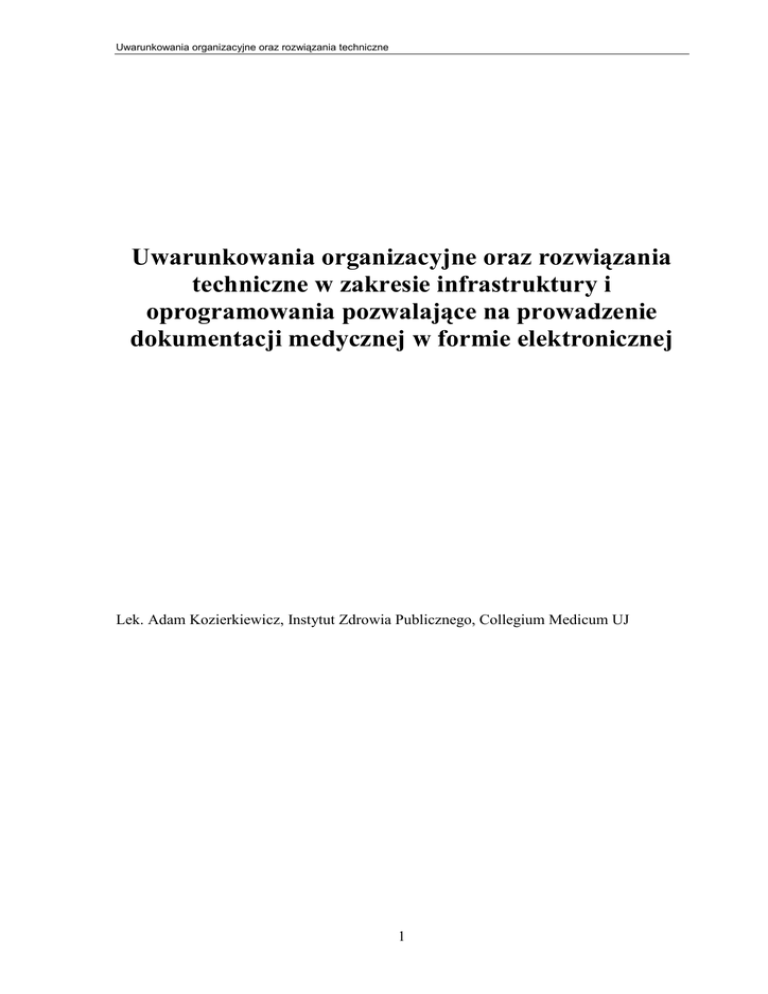 Uwarunkowania organizacyjne oraz rozwiązania techniczne Uwarunkowania organizacyjne oraz rozwiązania techniczne w zakresie infrastruktury i oprogramowania pozwalające na prowadzenie dokumentacji medycznej w formie elektronicznej Lek. Adam Kozierkiewicz, Instytut Zdrowia Publicznego, Collegium Medicum UJ 1 Uwarunkowania organizacyjne oraz rozwiązania techniczne 1 2 Otoczenie ........................................................................................................................ 4 1.1 Otoczenie lokalne.................................................................................................... 4 1.2 Kierunki rozwoju systemu informacyjnego ochrony zdrowia................................ 5 1.3 Cel ........................................................................................................................... 6 Zasady działania systemów z wykorzystaniem elektronicznej dokumentacji medycznej 7 2.1 2.1.1 Poziom mikro - świadczeniodawcy i apteki ........................................................... 7 Rozwój zastosowań informatyki w systemach świadczeniodawców i aptek w zgodzie z obowiązującym prawem ................................................................................. 7 2.1.2 Zapewnienie minimalnej zawartości merytorycznej zbiorów informacji i danych gromadzonych w systemach............................................................................... 9 2.1.3 Zapewnienie zgodności formatu podstawowych danych ............................... 9 2.1.4 Konsekwentne stosowanie standardów komunikacji międzymodułowej, oraz standardów przyłączania urządzeń medycznych do sieci informatycznych................. 10 2.1.5 Ochrona właściwego poziomu bezpieczeństwa systemów informatycznych, w tym ochrony danych osobowych pacjentów. ............................................................ 10 2.1.6 Zastosowanie podpisu elektronicznego ........................................................ 11 2.1.7 Rozwijanie i zapewnianie dostępu do aktualnych wersji systemów kodowych...................................................................................................................... 12 2.1.8 Zapewnienie jakości klasyfikacji i kodowania ............................................. 13 2.1.9 Stopniowe rozszerzanie elektronicznych form dokumentacji, od elektronicznej dokumentacji medycznej (EMR), po elektroniczną dokumentację pacjenta (EPR) .............................................................................................................. 14 2.2 Poziom mezo - regionalny .................................................................................... 15 2.2.1 Cele główne: ................................................................................................. 15 2.2.2 Bieżące korzystanie z dostępnych rejestrów i zbiorów danych gromadzonych przez jednostki administracji ochrony zdrowia i instytucje działające na ich rzecz..... 15 2.2.3 Zapewnienie jednoznacznej identyfikacji w systemie, instytucji i osób ...... 16 2.2.4 Zapewnienie standaryzacji definicji i formatu elementów danych występujących w systemie na poziomie regionu .......................................................... 17 3 Wstępne założenia funkcjonalne systemu .................................................................... 18 3.1 Główne procesy biznesowe................................................................................... 18 3.1.1 Procesy biznesowe w ambulatoryjnej opiece zdrowotnej ............................ 18 3.1.2 Procesy biznesowe w stacjonarnej opiece zdrowotnej ................................. 21 2 Uwarunkowania organizacyjne oraz rozwiązania techniczne 3.2 Komórki organizacyjne objęte działaniem systemu ......... Błąd! Nie zdefiniowano zakładki. 3.2.1 Przychodnia.............................................. Błąd! Nie zdefiniowano zakładki. 3.2.2 Oddziały szpitalne.................................... Błąd! Nie zdefiniowano zakładki. 3.2.3 Inne placówki i komórki organizacyjne... Błąd! Nie zdefiniowano zakładki. 3.3 3.3.1 Przychodnia................................................................................................... 26 3.3.2 Oddziały szpitalne......................................................................................... 27 3.3.3 Inne placówki i komórki organizacyjne........................................................ 27 3.4 4 Funkcje informacyjne związane z wykonywaniem świadczeń ............................ 26 Zakres i struktura danych...................................................................................... 28 3.4.1 Przychodnia................................................................................................... 28 3.4.2 Izba przyjęć i rejestracja ............................................................................... 32 3.4.3 Oddziały szpitalne......................................................................................... 34 3.4.4 Placówki diagnostyczne................................................................................ 42 Propozycja rozwiązań technicznych z uwzględnieniem architektury i oprogramowania dla referencyjnego modelu e-Przychodni przy PSK nr 1...................................................... 42 5 4.1 Modelowanie procesów biznesowych w ePrzychodni ......................................... 47 4.2 Procesy a system informatyczny dla ePrzychodni................................................ 50 Podsumowanie .............................................................................................................. 50 Załącznik 1. Lista norm polskich do stosowania w elektronicznej dokumentacji medycznej ..................................................................................................................... 51 Załącznik 2. Akty prawne regulujące obszar informacji medycznej .................................... 54 Załącznik 3. Struktura orga