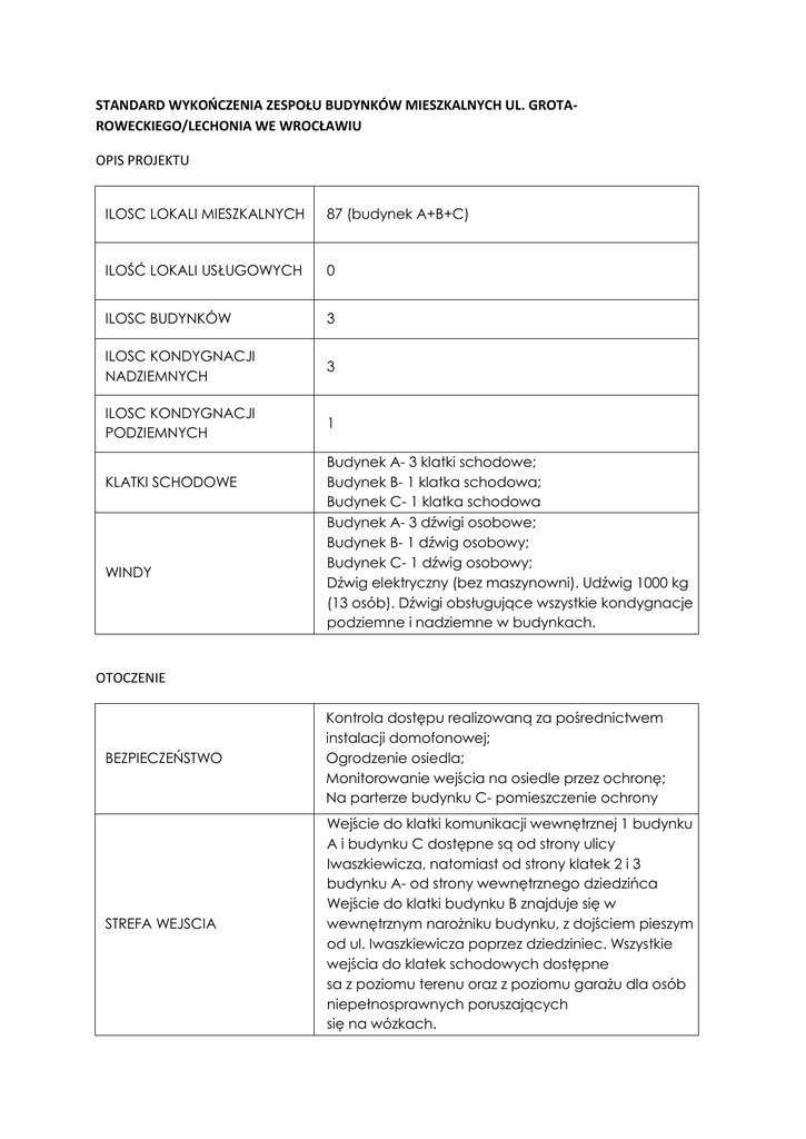 STANDARD WYKOŃCZENIA ZESPOŁU BUDYNKÓW MIESZKALNYCH UL. GROTAROWECKIEGO/LECHONIA WE WROCŁAWIU OPIS PROJEKTU ILOSC LOKALI MIESZKALNYCH 87 (budynek A+B+C) ILOŚĆ LOKALI USŁUGOWYCH 0 ILOSC BUDYNKÓW 3 ILOSC KONDYGNACJI NADZIEMNYCH 3 ILOSC KONDYGNACJI PODZIEMNYCH 1 KLATKI SCHODOWE WINDY Budynek A- 3 klatki schodowe; Budynek B- 1 klatka schodowa; Budynek C- 1 klatka schodowa Budynek A- 3 dźwigi osobowe; Budynek B- 1 dźwig osobowy; Budynek C- 1 dźwig osobowy; Dźwig elektryczny (bez maszynowni). Udźwig 1000 kg (13 osób). Dźwigi obsługujące wszystkie kondygnacje podziemne i nadziemne w budynkach. OTOCZENIE BEZPIECZEŃSTWO Kontrola dostępu realizowaną za pośrednictwem instalacji domofonowej; Ogrodzenie osiedla; Monitorowanie wejścia na osiedle przez ochronę; Na parterze budynku C- pomieszczenie ochrony STREFA WEJSCIA Wejście do klatki komunikacji wewnętrznej 1 budynku A i budynku C dostępne są od strony ulicy Iwaszkiewicza, natomiast od strony klatek 2 i 3 budynku A- od strony wewnętrznego dziedzińca Wejście do klatki budynku B znajduje się w wewnętrznym narożniku budynku, z dojściem pieszym od ul. Iwaszkiewicza poprzez dziedziniec. Wszystkie wejścia do klatek schodowych dostępne sa z poziomu terenu oraz z poziomu garażu dla osób niepełnosprawnych poruszających się na wózkach. WJAZDY Wjazd na teren posesji od strony ul. Iwaszkiewicza DROGI I CHODNIKI Betonowa kostka brukowa; Oświetlenie ciągów pieszych i wejść do budynku ZIELEŃ Podział na publiczną i prywatna zgodnie z Projektem Zieleni MIEJSCE GROMADZENIA ODPADÓW Na parterze budynku A zlokalizowano wydzielone pomieszczenie gromadzenia odpadów; Wywóz śmieci z wiat śmietnikowych odbywa się od strony ulicy Iwaszkiewicza (obsługa pomieszczenia składowania odpadów) oraz ulicy Lechonia (wiata śmietnikowa). Wywóz śmieci nie wymaga wjazdu na działkę KONSTRUKCJA I WYKOŃCZENIE BUDYNKU KONSTRUKCJA NOŚNA ŚCIANY ZEWNĘTRZNE ELEWACJA BUDYNKU - TYNKI ZEWNĘTRZNE Żelbetowa monolityczna Ściany garażu- monolityczne żelbetowe; Trzony szybów windowych na kondygnacjach nadziemnych- monolityczne żelbetowe; Ściany kondygnacji nadziemnych- pustaki ceramiczne Izolacja termiczna ścian zewnętrznych- wełna mineralna gr. 15 cm Zewnętrzna powierzchnia ściany- tynk silikonowosilikatowy na siatce w kolorze białym; W obrębie loggii i niektórych ścian- tynk mozaikowy w kolorze ciepłej żółci; Na wybranych (wskazanych w cz. rysunkowych) fragmentach- tynk silikonowo-silikatowy w kolorze szarym. Elewacje klatek schodowych, fragmenty elewacji kondygnacji poddasza- obłożenie blachą stalową łączoną na rąbek w podziale 60 cm w kolorze grafitowym; Dla elewacji tynkowych- cokół wys. min. 60 cm z tynku mozaikowego w kolorze zbliżonym do pozostałej części elewacji; W obrębie wejścia do klatek- wykończenie ścian tynkiem w kolorze szarym PRZESTRZENIE WSPÓLNE HALL WEJŚCIOWY Podłoga- kamień naturalny lub lastrico w kolorze jasno szarym. KLATKI SCHODOWE Tynk gipsowy odpowiadający kat. III; Malowanie farbą emulsyjną; Podłoga- lastrico w kolorze jasno szarym KORYTARZE Tynk gipsowy odpowiadający kat. III; Sufity podwieszane z płyt g-k na szkielecie podwieszanym do stropu; Podłoga- lastrico w kolorze jasno szarym DOSTĘP DLA OSÓB NIEPEŁNOSPRAWNYCH Wszystkie trzy budynki zaprojektowano zgodnie z wytycznymi rozporządzenia w sprawie warunków technicznych jakim powinny odpowiadać budynki i ich usytuowanie, jako w pełni dostępne dla osób niepełnosprawnych. Wejścia do klatek schodowych dostępne są bezpośrednio z chodnika, a komunikacje pionowa zapewniają dźwigi osobowe przystosowane do przewożenia osób na wózkach. KOMÓRKI LOKATORSKIE (W RAMACH LOKALU NIEMIESZKALNEGO ORAZ JAKO CZĘŚĆ WSPÓLNA BUDYNKU) ILOŚĆ KOMÓREK LOKATORSKICH KONSTRUKCJA 37 komórek kolatorskich- Budynek A+B; 23 komórek lokatorskich- Budynek B+C ściana z pustaków ceramicznych gr. 8 cm z zachowaniem otworów wentylacyjnych pod stropem w celu wentylacji wys. 230 cm do 319 cm w zależności od lokalizacji UWAGI • Wszystkie zawarte w niniejszym opisie rozwiązania mogą być zamienione w trakcie inwestycji na inne o równorzędnym standardzie wykonania. • Niniejszy Standard wykonania robót budowlanych, obejmujący wszystkie zawarte w nim rozwiązania techniczne oraz materiały, stanowi załącznik do umowy deweloperskiej.
