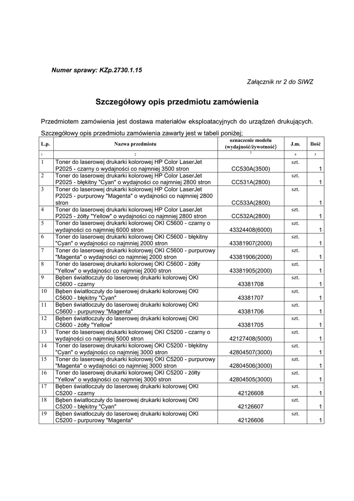 Numer sprawy: KZp.2730.1.15 Załącznik nr 2 do SIWZ Szczegółowy opis przedmiotu zamówienia Przedmiotem zamówienia jest dostawa materiałów eksploatacyjnych do urządzeń drukujących. Szczegółowy opis przedmiotu zamówienia zawarty jest w tabeli poniżej; L.p. Nazwa przedmiotu 1 2 1 Toner do laserowej drukarki kolorowej HP Color LaserJet P2025 - czarny o wydajności co najmniej 3500 stron Toner do laserowej drukarki kolorowej HP Color LaserJet P2025 - błękitny "Cyan" o wydajności co najmniej 2800 stron Toner do laserowej drukarki kolorowej HP Color LaserJet P2025 - purpurowy "Magenta" o wydajności co najmniej 2800 stron Toner do laserowej drukarki kolorowej HP Color LaserJet P2025 - żółty "Yellow" o wydajności co najmniej 2800 stron Toner do laserowej drukarki kolorowej OKI C5600 - czarny o wydajności co najmniej 6000 stron Toner do laserowej drukarki kolorowej OKI C5600 - błękitny "Cyan" o wydajności co najmniej 2000 stron Toner do laserowej drukarki kolorowej OKI C5600 - purpurowy "Magenta" o wydajności co najmniej 2000 stron Toner do laserowej drukarki kolorowej OKI C5600 - żółty "Yellow" o wydajności co najmniej 2000 stron Bęben światłoczuły do laserowej drukarki kolorowej OKI C5600 - czarny Bęben światłoczuły do laserowej drukarki kolorowej OKI C5600 - błękitny "Cyan" Bęben światłoczuły do laserowej drukarki kolorowej OKI C5600 - purpurowy "Magenta" Bęben światłoczuły do laserowej drukarki kolorowej OKI C5600 - żółty "Yellow" Toner do laserowej drukarki kolorowej OKI C5200 - czarny o wydajności co najmniej 5000 stron Toner do laserowej drukarki kolorowej OKI C5200 - błękitny "Cyan" o wydajności co najmniej 3000 stron Toner do laserowej drukarki kolorowej OKI C5200 - purpurowy "Magenta" o wydajności co najmniej 3000 stron Toner do laserowej drukarki kolorowej OKI C5200 - żółty "Yellow" o wydajności co najmniej 3000 stron Bęben światłoczuły do laserowej drukarki kolorowej OKI C5200 - czarny Bęben światłoczuły do laserowej drukarki kolorowej OKI C5200 - błękitny "Cyan" Bęben światłoczuły do laserowej drukarki kolorowej OKI C5200 - purpurowy "Magenta" 2 3 4 5 6 7 8 9 10 11 12 13 14 15 16 17 18 19 oznaczenie modelu (wydajność/żywotność) 3 J.m. Ilość 4 5 szt. CC530A(3500) 1 szt. CC531A(2800) 1 szt. CC533A(2800) 1 szt. CC532A(2800) 1 szt. 43324408(6000) 1 szt. 43381907(2000) 1 szt. 43381906(2000) 1 szt. 43381905(2000) 1 szt. 43381708 1 szt. 43381707 1 szt. 43381706 1 szt. 43381705 1 szt. 42127408(5000) 1 szt. 42804507(3000) 1 szt. 42804506(3000) 1 szt. 42804505(3000) 1 szt. 42126608 1 szt. 42126607 1 szt. 42126606 1 20 21 22 23 24 25 26 27 28 29 30 31 32 33 34 35 36 37 38 39 40 41 42 43 44 45 Bęben światłoczuły do laserowej drukarki kolorowej OKI C5200 - żółty "Yellow" Zespół utrwalający do laserowej drukarki kolorowej OKI C5200 Pas transferu do laserowej drukarki kolorowej OKI C5200 Toner do laserowej drukarki kolorowej OKI C610 - czarny o wydajności co najmniej 8000 stron Toner do laserowej drukarki kolorowej OKI C610 - błękitny "Cyan" o wydajności co najmniej 6000 stron Toner do laserowej drukarki kolorowej OKI C610 - purpurowy "Magenta" o wydajności co najmniej 6000 stron Toner do laserowej drukarki kolorowej OKI C610 - żółty "Yellow" o wydajności co najmniej 6000 stron Bęben światłoczuły do laserowej drukarki kolorowej OKI C610 - czarny Bęben światłoczuły do laserowej drukarki kolorowej OKI C610 - błękitny "Cyan" Bęben światłoczuły do laserowej drukarki kolorowej OKI C610 - purpurowy "Magenta" Bęben światłoczuły do laserowej drukarki kolorowej OKI C610 - żółty "Yellow" Zespół utrwalający do laserowej drukarki kolorowej OKI C610 Pas transferu do laserowej drukarki kolorowej OKI C610 Toner do laserowego kolorowego urządzenia wielofunkcyjnego Kyocera FS-2026MFP - czarny o wydajności co najmniej 7000 stron Toner do laserowego kolorowego urządzenia wielofunkcyjnego Kyocera FS-2026MFP - błękitny "Cyan" o wydajności co najmniej 5000 stron Toner do laserowego kolorowego urządzenia wielofunkcyjnego Kyocera FS-2026MFP - purpurowy "Magenta" o wydajności co najmniej 5000 stron Toner do laserowego kolorowego urządzenia wielofunkcyjnego Kyocera FS-2026MFP - żółty "Yellow" o wydajności co najmniej 5000 stron Toner do laserowej drukarki monochromatycznej HP LaserJet P2055 o wydajności co najmniej 6500 stron Toner do laserowej drukarki monochromatycznej HP LaserJet P1006 o wydajności co najmniej 1500 stron Toner do laserowej drukarki monochromatycznej HP LaserJet P2015, HP LaserJet 2727 NFS o wydajności co najmniej 7000 stron Toner do laserowej drukarki monochromatycznej HP LaserJet 1018 o wydajności co najmniej 2000 stron Toner do laserowej drukarki monochromatycznej HP LaserJet 1320, HP LaserJet 3390 o wydajności co najmniej 6000 stron Toner do laserowej drukarki monochromatycznej HP LaserJet 2300 o wydajności co najmniej 6000 stron Toner do laserowej drukarki monochromatycznej HP LaserJet 2420 o wydajności co najmniej 12000 stron Toner do laserowej drukarki monochromatycznej HP LaserJet 1566 o wydajności co najmniej 2100 stron Toner do laserowej drukarki monochromatycznej HP LaserJet szt. 42127405 1 szt. 42625503 42158712 szt szt 44315308(8000) 1 1 8 szt 44315307(6000) 8 szt. 44315306(6000) 8 szt. 44315305(6000) 8 szt. 44315108(20000) 2 szt. 44315107(20000) 2 szt. 44315106(20000) 2 szt. 44315105(20000) 44289103(60000) 44341902(60000) szt. szt. szt. TK-590K(7000) 2 2 2 2 szt. TK-590C(5000) 2 szt. TK-590M(5000) 2 szt. TK-590Y(5000) 2 szt. CE505X(6500) 15 szt. 35A(1500) 4 szt. 53X(7000) 7 szt. 12A(2000) 2 szt. 49X(6000) 6 szt. 10A(6000) 1 szt. 11X(6000) 1 szt. CE278A(2100) C7115X(3500) szt. 2 2 46 47 48 49 50 51 52 53 54 55 56 57 58 59 60 61 62 63 64 65 66 67 68 69 70 71 72 1200 o wydajności co najmniej 3500 stron Toner do laserowej drukarki monochromatycznej HP LaserJet 1505 o wydajności co najmniej 2000 stron Toner do laserowej drukarki monochromatycznej OKI B