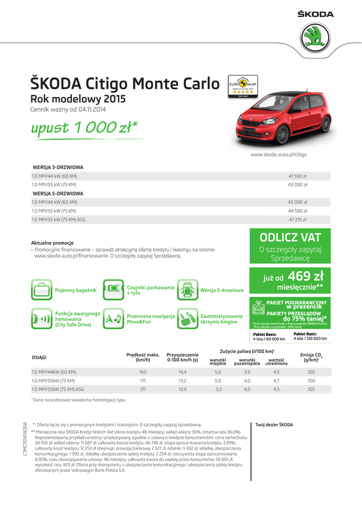 ŠKODA Citigo Monte Carlo Rok modelowy 2015 Cennik ważny od 04.11.2014 upust 1 000 zł* www.skoda-auto.pl/citigo WERSJA 3-DRZWIOWA 1.0 MPI/44 kW (60 KM) 41 590 zł 1.0 MPI/55 kW (75 KM) 43 090 zł WERSJA 5-DRZWIOWA 1.0 MPI/44 kW (60 KM) 43 090 zł 1.0 MPI/55 kW (75 KM) 44 590 zł 1.0 MPI/55 kW (75 KM) ASG 47 215 zł ODLICZ VAT Aktualne promocje • Promocyjne finansowanie – sprawdź atrakcyjną ofertę kredytu i leasingu na stronie: www.skoda-auto.pl/finansowanie. O szczegóły zapytaj Sprzedawcę. O szczegóły zapytaj Sprzedawcę 469 zł Pojemny bagażnik Czujniki parkowania z tyłu Wersja 5-drzwiowa Funkcja awaryjnego hamowania (City Safe Drive) Przenośna nawigacja Move&Fun Zautomatyzowana skrzynia biegów Prędkość maks. (km/h) Przyspieszenie 0-100 km/h (s) 1.0 MPI/44kW (60 KM) 160 1.0 MPI/55kW (75 KM) 1.0 MPI/55kW (75 KM) ASG OSIĄGI już od miesięcznie** Zużycie paliwa (l/100 km)1 warunki pozamiejskie wartość uśredniona 14,4 5,6 3,9 4,5 105 171 13,2 5,9 4,0 4,7 108 171 13,9 5,5 4,0 4,5 105 Dane na podstawie świadectw homologacji typu. 1 C1MC15141405A Emisja CO2 (g/km)1 warunki miejskie * Oferta łączy się z promocyjnym kredytem i leasingiem. O szczegóły zapytaj sprzedawcę. ** M iesięczna rata SKODA Kredyt Niskich Rat (okres kredytu 48 miesięcy, wkład własny 30%, ostatnia rata 36,0%). Reprezentatywny przykład ustalony i przekazywany zgodnie z ustawą o kredycie konsumenckim: cena samochodu: 58 435 zł; wkład własny: 11 687 zł; całkowita kwota kredytu: 46 748 zł; stopa oprocentowania kredytu: 3,99%; całkowity koszt kredytu: 12 253 zł obejmuje: prowizję bankową: 2 527 zł, odsetki: 5 932 zł, składkę ubezpieczenia komunikacyjnego: 1 590 zł, składkę ubezpieczenia spłaty kredytu: 2 204 zł; rzeczywista stopa oprocentowania 9,30%; czas obowiązywania umowy: 48 miesięcy; całkowita kwota do zapłaty przez konsumenta: 59 001 zł; wysokość raty: 823 zł. Oferta przy skorzystaniu z ubezpieczenia komunikacyjnego i ubezpieczenia spłaty kredytu oferowanych przez Volkswagen Bank Polska S.A. Twój dealer ŠKODA ŠKODA Citigo Monte Carlo WYPOSAŻENIE STANDARDOWE PODRÓŻUJ BEZPIECZNIE • Czołowa poduszka bezpieczeństwa kierowcy i pasażera • Boczne poduszki bezpieczeństwa z funkcją ochrony głowy dla przednich foteli • ESP (z ABS, EBV, MSR, ASR, EDS, HBA) • HHC – system wspomagania ruszania pod wzniesienia • TPM – funkcja kontroli ciśnienia w oponach • Trzypunktowe pasy bezpieczeństwa dla przednich foteli oraz tylnej kanapy (przednie pasy z napinaczami pirotechnicznymi z ograniczeniem siły napięcia) • Sygnalizacja niezapiętych pasów z przodu • Uchwyty ISOFIX na zewnętrznych miejscach tylnej kanapy z uchwytami Top Tether od strony bagażnika (w oparciu tylnej kanapy) • Fotele przednie ze zintegrowanymi zagłówkami • Dwa zagłówki na zewnętrznych miejscach tylnej kanapy z możliwością regulacji • Immobiliser PO PIERWSZE FUNKCJONALNOŚĆ • Pakiet Ambition Plus (Climatic – klimatyzacja manualna z filtrem powietrza, komputer pokładowy) • Sportowe zawieszenie • Regulacja wysokości kierownicy • Elektromechaniczne wspomaganie układu kierowniczego • Zdalnie sterowany centralny zamek (jeden składany kluczyk) • Komputer pokładowy • Reflektory z elementami w kolorze czarnym z regulacją wysokości wiązki świateł • Światła do jazdy dziennej • Przednie światła przeciwmgłowe • Easy Entry – system ułatwiający zajmowanie miejsca na tylnej kanapie (dot. wersji 3-drzwiowej) • Fotel kierowcy z możliwością regulacji na wysokość • Składane, dzielone oparcie tylnej kanapy • Manualnie sterowane lusterka boczne • Elektrycznie sterowane szyby z przodu • Trójramienna kierownica sportowa z przeszyciami w kolorze czerwonym z małym pakietem skórzanym (kierownica oraz dźwignia hamulca ręcznego obszyta skórą, skórzany mieszek dźwigni zmiany biegów)1 • Climatic – klimatyzacja manualna z filtrem powietrza • Zestaw wskaźników z obrotomierzem oraz analogowym wskaźnikiem paliwa • Oświetlenie wnętrza przedniej części podsufitki • Gniazdo 12V w konsoli środkowej • Osłona przeciwsłoneczna kierowcy, osłona przeciwsłoneczna pasażera z lusterkiem • Półka nad częścią bagażową • Schowek w desce rozdzielczej po stronie pasażera, zamykany (wraz z uchwytem na okulary i długopis oraz miejscem na dokumenty i monety) • Haczyki w słupkach B • Cztery haczyki w przestrzeni bagażowej • Dwa uchwyty na butelki przy zewnętrznych miejscach tylnej kanapy (dot. wersji 3-drzwiowej) • Konsola centralna ze schowkami (jeden w części przedniej, jeden w części tylnej) • Uchwyt na kwity parkingowe • Kieszenie na drobne przedmioty na zewnętrznych częściach foteli przednich • Uchwyt na torbę w pokrywie schowka po stronie pasażera • Uchwyt na fotografie • Dwutonowy klakson AUDIO I KOMUNIKACJA • Przygotowanie pod radioodtwarzacz (dwa głośniki z przodu, antena dachowa) • Radioodtwarzacz Funky (CD, MP3, dwa głośniki, AUX IN) STYLISTYKA • SUNSET - tylne szyby o wyższym stopniu przyciemnienia • Obręcze kół ze stopu metali lekkich AURIGA 5,5J x 15” w kolorze czarnym • Spojler na zderzaku z przodu oraz pokrywie bagażnika, dyfuzor z tyłu, ramka grilla, osłony lusterek zewnętrznych w kolorze czarnym • Podsufitka i słupki w kolorze czarnym • Środkowa część deski rozdzielczej w kolorze czarnym błyszczącym z logo Monte Carlo • Tapicerka Monte Carlo • Okleina Monte Carlo na drzwiach, progach drzwi, słupkach B oraz pokrywie bagażnika • Ramka ozdobna wokół wylotów nawiewu, okrągłych wskaźników zegarowych w zestawie wskaźników, instrumentów deski rozdzielczej, panelu radioodtwarzacza, klimatyzacji w kolorze chromu • Klamki wewnętrzne oraz wykończenie gałki zmiany biegów • Dywaniki z przeszyciami w kolorze czerwonym • Zestaw naprawczy3 • Zderzaki w kolorze nadwozia Oznaczenia w cenniku: podane kwoty w zł / w