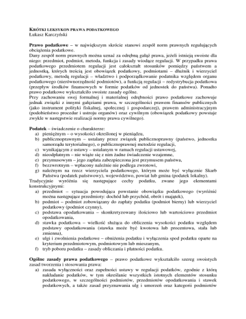 KRÓTKI LEKSYKON PRAWA PODATKOWEGO Łukasz Karczyński Prawo podatkowe – w największym skrócie stanowi zespół norm prawnych regulujących obciążenia podatkowe. Dany zespół norm prawnych można uznać za odrębną gałąź prawa, jeżeli istnieją swoiste dla niego: przedmiot, podmiot, metoda, funkcja i zasady wiodące regulacji. W przypadku prawa podatkowego przedmiotem regulacji jest całokształt stosunków pomiędzy państwem a jednostką, których treścią jest obowiązek podatkowy, podmiotami – dłużnik i wierzyciel podatkowy, metodą regulacji – władztwo i podporządkowanie podatnika względem organu podatkowego (nierównorzędność podmiotów), a funkcją regulacji – redystrybucja podatkowa (przepływ środków finansowych w formie podatków od jednostek do państwa). Ponadto prawo podatkowe wykształciło swoiste zasady ogólne. Przy zachowaniu swej formalnej i materialnej odrębności prawo podatkowe zachowuje jednak związki z innymi gałęziami prawa, w szczególności prawem finansów publicznych (jako instrument polityki fiskalnej, społecznej i gospodarczej), prawem administracyjnym (podobieństwo procedur i ustroju organów) oraz cywilnym (obowiązek podatkowy powstaje zwykle w następstwie realizacji normy prawa cywilnego). Podatek – świadczenie o charakterze: a) pieniężnym – o wysokości określonej w pieniądzu, b) publicznoprawnym – ustalany przez związek publicznoprawny (państwo, jednostka samorządu terytorialnego), o publicznoprawnej metodzie regulacji, c) wynikającym z ustawy – ustalanym w ramach regulacji ustawowej, d) nieodpłatnym – nie wiąże się z nim żadne świadczenie wzajemne, e) przymusowym – jego zapłata zabezpieczona jest przymusem państwa, f) bezzwrotnym – wpłacony należnie nie podlega zwrotowi, g) należnym na rzecz wierzyciela podatkowego, którym może być wyłącznie Skarb Państwa (podatek państwowy), województwo, powiat lub gmina (podatek lokalny). Tradycyjnie wyróżnia się następujące cechy podatku, zwane jego elementami konstrukcyjnymi: a) przedmiot – sytuacja powodująca powstanie obowiązku podatkowego (wyróżnić można następujące przedmioty: dochód lub przychód, obrót i majątek), b) podmiot – podmiot zobowiązany do zapłaty podatku (podmiot bierny) lub wierzyciel podatkowy (podmiot czynny), c) podstawa opodatkowania – skonkretyzowany ilościowo lub wartościowo przedmiot opodatkowania, d) stawka podatkowa – wielkość służąca do obliczenia wysokości podatku względem podstawy opodatkowania (stawka może być kwotowa lub procentowa, stała lub zmienna), e) ulgi i zwolnienia podatkowe – obniżenia podatku i wyłączenia spod podatku oparte na kryterium przedmiotowym, podmiotowym lub mieszanym, f) tryb poboru podatku – zasady obliczania i płatności podatku. Ogólne zasady prawa podatkowego – prawo podatkowe wykształciło szereg swoistych zasad tworzenia i stosowania prawa: a) zasada wyłączności oraz zupełności ustawy w regulacji podatków, zgodnie z którą nakładanie podatków, w tym określanie wszystkich istotnych elementów stosunku podatkowego, w szczególności podmiotów, przedmiotów opodatkowania i stawek podatkowych, a także zasad przyznawania ulg i umorzeń oraz kategorii podmiotów zwolnionych od podatków, powinno być uregulowane w drodze ustawy, b) zasada zaufania do państwa i prawa, będąca zasadą o ogólnej treści i spajającą szereg innych zasad, w tym zasady lex retro non agit, lex benignior (zasada stosowania sankcji korzystniejszej dla podatnika w sytuacji, gdy ocena sytuacji prawnej następuje pod rządami innej normy sankcjonującej niż w momencie naruszenia normy sankcjonowanej), zasady jawności, pewności i określoności prawa czy też ochrony praw słusznie nabytych, c) zasada zakazu stanowienia prawa retroaktywnego (łac. lex retro non agit), treścią której jest zakaz nadawania przepisom mocy wstecznej, jeżeli prowadzi to do pogorszenia sytuacji adresatów w stosunku do stanu poprzedniego (ustawa działa z mocą wsteczną, kiedy początek jej stosowania ustalony został na moment wcześniejszy niż dzień ogłoszenia ustawy), d) zasada pewności prawa, postulująca przede wszystkim przewidywalność i obliczalność rozstrzygnięć organów władzy publicznej, umożliwiające podatnikom przygotowanie się do zmian. Z zasadą tą wiążą się nierozerwalnie zasada jawności prawa (obowiązek należytego ogłaszania aktów normatywnych) oraz zasada ochrony praw słusznie nabytych (nieodbieranie obywatelom praw, które zostały przez nich wcześniej zgodnie z prawem uzyskane), e) zasada określoności prawa, nakazująca stanowić prawo jasne, precyzyjne, niesprzeczne i zrozumiałe, f) zasady sprawiedliwości podatkowej: zasada powszechności i równości opodatkowania, zgodnie z którymi następstwa podatkowe analogicznych sytuacji ekonomicznoprawnych nie powinny się różnić, a kryteria różnicowania podatników powinny być uzasadnione aksjologicznie, g) zasada rozstrzygania wątpliwości na korzyść podatnika (łac. in dubio pro tributario), nakazująca rozstrzygać wątpliwości interpretacyjne na korzyść podatnika (a przynajmniej zakazująca rozstrzygać je na jego niekorzyść), h) zasada ograniczonego stosowania analogii i wykładni rozszerzającej w interpretacji prawa podatkowego, zakazująca posługiwania się wnioskowaniem per analogiam i wykładnią rozszerzającą (rozumianą jako przyjęcie na podstawie wykładni pozajęzykowej znaczenia innego niż wynikające z wykładni językowej), jeżeli ich skutkiem byłoby nałożenie na podatników obowiązków podatkowych lub ograniczanie ich praw, i) zasada respektowania terminologii przejętej z innych gałęzi prawa, zgodnie z którą należy przyjmować, że terminy używane w prawie podatkowym, mające ustalone znaczenie w innych gałęziach prawa, zachowują to znaczenie w prawie podatkowym, chyba że z danej ustawy podatkowej – wyraźnie (przez de