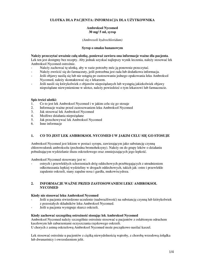 ULOTKA DLA PACJENTA: INFORMACJA DLA UŻYTKOWNIKA Ambroksol Nycomed 30 mg/ 5 ml, syrop (Ambroxoli hydrochloridum) Syrop o smaku bananowym Należy przeczytać uważnie całą ulotkę, ponieważ zawiera ona informacje ważne dla pacjenta. Lek ten jest dostępny bez recepty. Aby jednak uzyskać najlepszy wynik leczenia, należy stosować lek Ambroksol Nycomed ostrożnie. Należy zachować tę ulotkę, aby w razie potrzeby móc ją ponownie przeczytać. Należy zwrócić się do farmaceuty, jeśli potrzebna jest rada lub dodatkowa informacja. Jeśli objawy nasilą się lub nie ustąpią po zastosowaniu jednego opakowania leku Ambroksol Nycomed, należy skontaktować się z lekarzem. Jeśli nasili się którykolwiek z objawów niepożądanych lub wystąpią jakiekolwiek objawy niepożądane niewymienione w ulotce, należy powiedzieć o tym lekarzowi lub farmaceucie. Spis treści ulotki: 1. Co to jest lek Ambroksol Nycomed i w jakim celu się go stosuje 2. Informacje ważne przed zastosowaniem leku Ambroksol Nycomed 3. Jak stosować lek Ambroksol Nycomed 4. Możliwe działania niepożądane 5. Jak przechowywać lek Ambroksol Nycomed 6. Inne informacje 1. CO TO JEST LEK AMBROKSOL NYCOMED I W JAKIM CELU SIĘ GO STOSUJE Ambroksol Nycomed jest lekiem w postaci syropu, zawierającym jako substancję czynną chlorowodorek ambroksolu (pochodna bromoheksyny). Należy on do grupy leków o działaniu pobudzającym wydzielanie śluzu oskrzelowego oraz zmniejszających jego lepkość. Ambroksol Nycomed stosowany jest w: ostrych i przewlekłych schorzeniach dróg oddechowych przebiegających z utrudnieniem odkrztuszania lepkiej wydzieliny w drogach oddechowych, takich jak: ostre i przewlekłe zapalenie oskrzeli, stany zapalne nosa i gardła, mukowiscydoza. 2. INFORMACJE WAŻNE PRZED ZASTOSOWANIEM LEKU AMBROKSOL NYCOMED Kiedy nie stosować leku Ambroksol Nycomed Jeśli u pacjenta stwierdzono uczulenie (nadwrażliwość) na substancję czynną lub którykolwiek z pozostałych składników leku Ambroksol Nycomed. Jeśli u pacjenta występuje skurcz oskrzeli. Kiedy zachować szczególną ostrożność stosując lek Ambroksol Nycomed Ambroksol Nycomed należy szczególnie ostrożnie stosować u pacjentów z osłabionym odruchem kaszlowym lub zaburzeniami oczyszczania rzęskowego oskrzeli. U chorych z astmą oskrzelową Ambroksol Nycomed może początkowo nasilać kaszel. Lek stosować ostrożnie u pacjentów z ciężką niewydolnością wątroby, z chorobą wrzodową żołądka lub dwunastnicy i owrzodzeniem jelit. 1/4 U chorych z niewydolnością nerek należy zmniejszyć dawkę dobową w zależności od klirensu kreatyniny lub wydłużyć przerwy między dawkami. Nie zaleca się podawania leku bezpośrednio przed snem. Podanie leku Ambroksol Nycomed pacjentom leżącym należy skonsultować z lekarzem. Jeżeli w ciągu 30 minut od podania leku nie nastąpiło odkrztuszenie rozrzedzonej wydzieliny należy ją odessać. Lek może być stosowany przez chorych na cukrzycę. Jeżeli stwierdzono wcześniej u pacjenta nietolerancję niektórych cukrów, pacjent powinien skontaktować się z lekarzem przed przyjęciem leku. Stosowanie innych leków Należy powiedzieć lekarzowi lub farmaceucie o wszystkich przyjmowanych aktualnie lub ostatnio lekach, również tych, które wydawane są bez recepty. Nie należy stosować leku Ambroksol Nycomed jednocześnie z lekami przeciwkaszlowymi, np. kodeiną, ze względu na ich działanie hamujące odruch kaszlowy. Ambroksol Nycomed podawany jednocześnie z antybiotykami (np. amoksycylina, ampicylina, cefuroksym, doksycyklina, erytromycyna) zwiększa ich przenikanie do płuc i nasila ich działanie. Ambroksol Nycomed i teofilina wzajemnie nasilają swoje działanie. Ciąża i karmienie piersią Przed zastosowaniem jakiegokolwiek leku należy poradzić się lekarza lub farmaceuty. Lek może być stosowany przez kobiety w ciąży oraz karmiące piersią jedynie w przypadkach zdecydowanej konieczności. Prowadzenie pojazdów i obsługiwanie maszyn Lek Ambroksol Nycomed nie wpływa na zdolność prowadzenia pojazdów i obsługiwania maszyn. Ważne informacje o niektórych składnikach leku Ambroksol Nycomed Syrop zawiera glicerol i sorbitol, które mogą powodować zaburzenia żołądkowo-jelitowe - lek może mieć lekkie działanie przeczyszczające. Jeżeli stwierdzono wcześniej u pacjenta nietolerancję niektórych cukrów, pacjent powinien skontaktować się z lekarzem przed przyjęciem leku. Glicerol może powodować bóle głowy. Wartość kaloryczna: 2,6 kcal/g sorbitolu. 3. JAK STOSOWAĆ LEK AMBROKSOL NYCOMED Lek Ambroksol Nycomed należy zawsze stosować zgodnie z zaleceniami lekarza. W razie wątpliwości należy skontaktować się z lekarzem lub farmaceutą. Zazwyczaj stosowana dawka leku Ambroksol Nycomed, to: Dzieci: 1 do 2 lat: 1,25 ml syropu (7,5 mg ambroksolu) - 2 razy na dobę, 2 do 5 lat: 1,25 ml syropu (7,5 mg ambroksolu) - 3 razy na dobę, 6 do 12 lat: 2,5 ml syropu (15 mg ambroksolu) - 2 do 3 razy na dobę. Dzieci powyżej 12 lat i dorośli: 5 ml syropu (30 mg ambroksolu) - do 3 razy na dobę przez pierwsze 2-3 dni, a następnie 5 ml syropu 2 razy na dobę. Zalecane dawkowanie dotyczy ostrych stanów chorobowych układu oddechowego. 2/4 W chorobach przewlekłych dawkę należy zmniejszyć do połowy. Lek stosować ostrożnie u dzieci do 5 lat. Leku Ambroksol Nycomed nie należy stosować na noc. Zastosowanie większej niż zalecana dawki leku Ambroksol Nycomed Objawy przedawkowania to: nudności, zmęczenie, nadmierne wydzielanie śluzu. W razie przyjęcia większej niż zalecana dawki leku, należy niezwłocznie zwrócić się do lekarza lub farmaceuty. Pominięcie zastosowania leku Ambroksol Nycomed Nie należy stosować dawki podwójnej w celu uzupełnienia pominiętej dawki. Jeśli lek przyjmowany jest regularnie, a od momentu pominiętej dawki upłynęło niewiele czasu, należy ją przyjąć tak szybko jak jest to możliwe. Jeśli zbliża się pora przyję