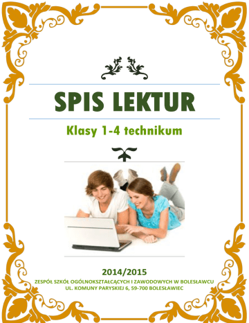 SPIS LEKTUR Klasy 1-4 technikum 2014/2015 ZESPÓŁ SZKÓŁ OGÓLNOKSZTAŁCĄCYCH I ZAWODOWYCH W BOLESŁAWCU UL. KOMUNY PARYSKIEJ 6, 59-700 BOLESŁAWIEC Lektury w klasie 1 technikum 2014/15 STAROŻYTNOŚĆ: 1. „Iliada” i „Odyseja” Homera- powtórzenie z gimnazjum w kontekście opowieści o Gilgameszu. 2. „Gilgamesz. Epos babiloński i asyryjski ze szczątków odczytany i uzupełniony także pieśniami sumerskimi przez Roberta Stillera”- fragmenty 3. „Mitologia Greków i Rzymian”- mity z gimnazjum (Prometeusz, Dedal i Ikar, Demeter i Kora, Syzyf) 4. „Mitologia Greków i Rzymian”- mit o Narcyzie, mit o Orfeuszu; Owidiusz „Metamorfozy”- fragmenty 5. Platon „Państwo”- fragmenty „Mit jaskini” 6. Wergiliusz „Georgiki”- fragmenty o Orfeuszu 7. Wybrane „Pieśni” Horacego 8. Sofokles- „Antygona”- powtórka z gimnazjum 9. Sofokles „Król Edyp” LEKTURA W CAŁOŚCI BIBLIA I KONTEKSTY XX-WIECZNE: 10. „Biblia”- wybrane fragmenty z podręcznika (Księga Psalmów, Pieśń nad Pieśniami, Księga Hioba, Księga Koheleta, Kazanie na Górze, przypowieści biblijne, Apokalipsa św. Jana) 11. Michaił Bułhakow „Mistrz i Małgorzata” LEKTURA W CAŁOŚCI ŚREDNIOWIECZE I KONTEKSTY XX-WIECZNE: 12. Dante Alighieri „Boska komedia”- tu: cz.1 „Piekło” 13. „Dzieje Tristana i Izoldy” LEKTURA W CAŁOŚCI 14. Albert Camus „Dżuma” LEKTURA W CAŁOŚCI RENESANS I KONTEKSTY XX-WIECZNE: 15. Giovanni Boccaccio „Sokół” 16. William Szekspir „Makbet” LEKTURA W CAŁOŚCI 17. Jan Kochanowski „Pieśni”- teksty z podręcznika 18. Jan Kochanowski „Treny” LEKTURA W CAŁOŚCI 19. Mikołaj Sęp-Szarzyński- teksty z podręcznika 20. Ryszard Kapuściński „Cesarz” LEKTURA W CAŁOŚCI Kolorem czerwonym zostały oznaczone obowiązkowe lektury omawiane w całości na lekcjach Kolorem zielonym zostały oznaczone teksty obowiązkowe, które należy opracować samodzielnie w domu, na ocenę w tzw. „Zeszycie lektur”. Lektury w klasie 2 technikum 2014/15 BAROK I KONTEKSTY XX-WIECZNE: 1. Jan Andrzej Morsztyn- teksty z podręcznika 2. Daniel Naborowski- teksty z podręcznika 3. Jan Chryzostom Pasek „Pamiętniki”- fragmenty 4. Wacław Potocki- teksty z podręcznika 5. Miguel de Cervantes Saavedra „Przemyślny szlachcic Don Kichot z Manczy” – fragmenty OŚWIECENIE I KONTEKSTY XX-WIECZNE 6. Wolter „Kandyd, czyli optymizm”- fragmenty 7. Ignacy Krasicki „Satyry” („Świat zepsuty”, „Żona modna”, „Pijaństwo”, „Do króla”) 8. Adam Naruszewicz „Balon” (wiersz) 9. Ignacy Krasicki „Monachomachia”- fragmenty 10. Ignacy Krasicki „Mikołaja Doświadczyńskiego przypadki”- fragmenty 11. Franciszek Karpiński „Sielanki” („Laura i Filon”, „Do Justyny. Tęskność na wiosnę”) 12. Stanisław Lem „Solaris”- fragmenty ROMANTYZM I KONTEKSTY XX-WIECZNE: 13. Adam Mickiewicz „Romantyczność” , „Oda do młodości” 14. Johann Wolfgang Goethe „Król Olch” 15. Johann Wolfgang Goethe „Cierpienia młodego Wertera”- fragmenty 16. Adam Mickiewicz „Dziady” cz. IV LEKTURA W CAŁOŚCI 17. Adam Mickiewicz „Sonety krymskie” (teksty z podręcznika) 18. Adam Mickiewicz „Dziady” cz. III LEKTURA W CAŁOŚCI 19. Adam Mickiewicz „Pan Tadeusz” LEKTURA W CAŁOŚCI 20. Juliusz Słowacki „Kordian” LEKTURA W CAŁOŚCI 21. Zygmunt Krasiński „Nie-boska komedia”- fragmenty 22. Juliusz Słowacki- wybór wierszy z podręcznika 23. Cyprian Kamil Norwid- wybór wierszy z podręcznika 24. Sławomir Mrożek „Tango” LEKTURA W CAŁOŚCI Kolorem czerwonym zostały oznaczone obowiązkowe lektury omawiane w całości na lekcjach Kolorem zielonym zostały oznaczone teksty obowiązkowe, które należy opracować samodzielnie w domu, na ocenę w tzw. „Zeszycie lektur”. Lektury w klasie 3 technikum 2014/15 POZYTYWIZM I KONTEKSTY XX-WIECZNE: 1. Fiodor Dostojewski „Zbrodnia i kara” LEKTURA W CAŁOŚCI 2. Fiodor Dostojewski ‘Łagodna” – fragmenty 3. Maria Konopnicka „Mendel Gdański” LEKTURA W CAŁOŚCI 4. Bolesław Prus „Kamizelka” LEKTURA W CAŁOŚCI 5. Bolesław Prus „Kroniki tygodniowe”- fragmenty 6. Bolesław Prus „Lalka” LEKTURA W CAŁOŚCI 7. Eliza Orzeszkowa „Nad Niemnem”- fragmenty 8. Eliza Orzeszkowa „Gloria victis”- fragmenty 9. Henryk Sienkiewicz „Potop”- fragmenty MŁODA POLSKA I KONTEKSTY XX-WIECZNE: 10. Paul Verlaine- wiersze z podręcznika 11. Kazimierz Przerwa-Tetmajer- wiersze z podręcznika 12. Jan Kasprowicz- wiersze z podręcznika 13. Leopold Staff- wiersze z podręcznika 14. Stanisław Wyspiański „Wesele” LEKTURA W CAŁOŚCI 15. Gabriela Zapolska „Moralność pani Dulskiej”- fragmenty 16. Władysław Stanisław Reymont „Chłopi” (tom I) LEKTURA W CAŁOŚCI 17. Joseph Conrad „Jądro ciemności” LEKTURA W CAŁOŚCI 18. Stefan Żeromski „Ludzie bezdomni” LEKTURA W CAŁOŚCI XX-LECIE MIĘDZYWOJENNE I KONTEKSTY WSPÓŁCZESNE: 19. Franz Kafka „Proces” LEKTURA W CAŁOŚCI 20. Stefan Żeromski „Przedwiośnie” LEKTURA W CAŁOŚCI 21. Jarosław Iwaszkiewicz ‘Panny z Wilka”- fragmenty 22. Bruno Schulz „Sklepy cynamonowe” LEKTURA W CAŁOŚCI 23. Witold Gombrowicz „Ferdydurke” LEKTURA W CAŁOŚCI Kolorem czerwonym zostały oznaczone obowiązkowe lektury omawiane w całości na lekcjach Kolorem zielonym zostały oznaczone teksty obowiązkowe, które należy opracować samodzielnie w domu, na ocenę w tzw. „Zeszycie lektur”. Lektury w klasie 4 technikum 2014/15 (stara podstawa programowa) XX-LECIE MIĘDZYWOJENNE I KONTEKSTY WSPÓŁCZESNE- ciąg dalszy: 1. 2. 3. 4. 5. 6. Julian Tuwim- wiersze z podręcznika Bolesław Leśmian- wiersze z podręcznika Julian Przyboś- wiersze z podręcznika Józef Czechowicz- wiersze z podręcznika Konstanty Ildefons Gałczyński- wiersze z podręcznika Zofia Nałkowska „Granica”- fragmenty LITERATURA WOJNY I OKUPACJI I KONTEKSTY WSPÓŁCZESNE: 7. 8. 9. 10. 11. 12. Krzysztof Kamil