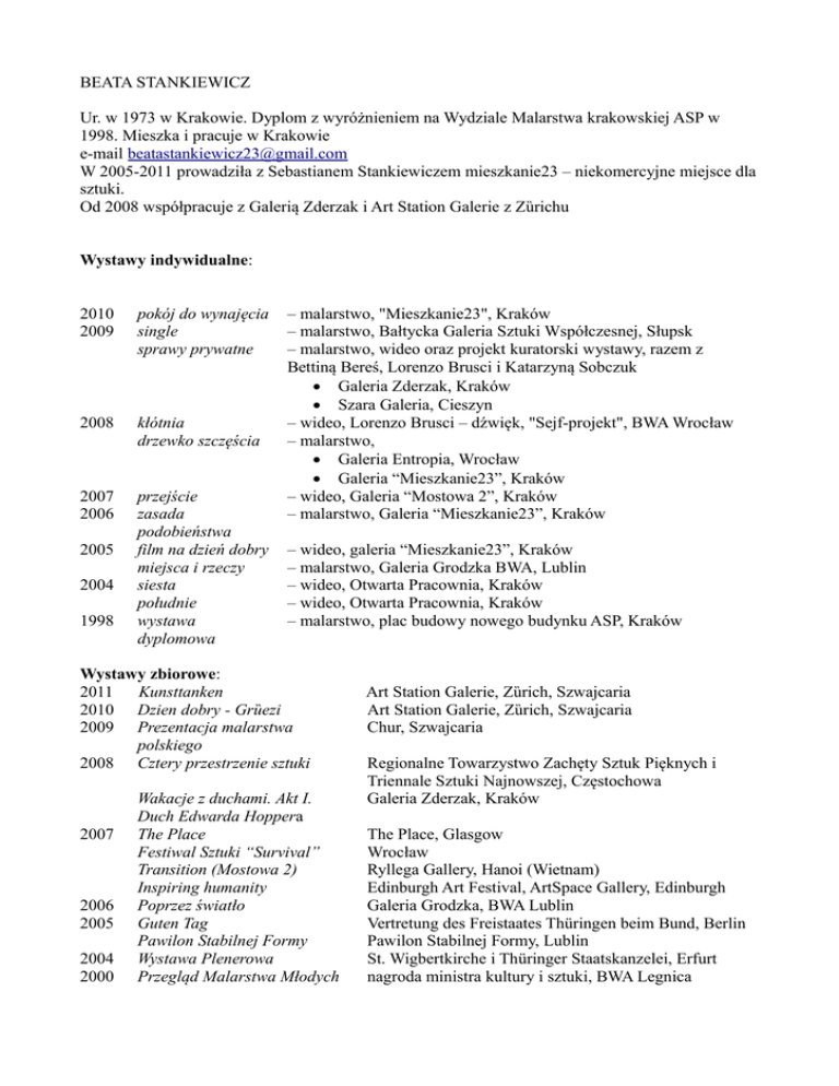 BEATA STANKIEWICZ Ur. w 1973 w Krakowie. Dyplom z wyróżnieniem na Wydziale Malarstwa krakowskiej ASP w 1998. Mieszka i pracuje w Krakowie e-mail [email protected] W 2005-2011 prowadziła z Sebastianem Stankiewiczem mieszkanie23 – niekomercyjne miejsce dla sztuki. Od 2008 współpracuje z Galerią Zderzak i Art Station Galerie z Zȕrichu Wystawy indywidualne: 2010 2009 pokój do wynajęcia single sprawy prywatne 2008 kłótnia drzewko szczęścia 2007 2006 przejście zasada podobieństwa film na dzień dobry miejsca i rzeczy siesta południe wystawa dyplomowa 2005 2004 1998 – malarstwo, "Mieszkanie23", Kraków – malarstwo, Bałtycka Galeria Sztuki Współczesnej, Słupsk – malarstwo, wideo oraz projekt kuratorski wystawy, razem z Bettiną Bereś, Lorenzo Brusci i Katarzyną Sobczuk Galeria Zderzak, Kraków Szara Galeria, Cieszyn – wideo, Lorenzo Brusci – dźwięk, "Sejf-projekt", BWA Wrocław – malarstwo, Galeria Entropia, Wrocław Galeria “Mieszkanie23”, Kraków – wideo, Galeria “Mostowa 2”, Kraków – malarstwo, Galeria “Mieszkanie23”, Kraków – wideo, galeria “Mieszkanie23”, Kraków – malarstwo, Galeria Grodzka BWA, Lublin – wideo, Otwarta Pracownia, Kraków – wideo, Otwarta Pracownia, Kraków – malarstwo, plac budowy nowego budynku ASP, Kraków Wystawy zbiorowe: 2011 Kunsttanken 2010 Dzien dobry - Grȕezi 2009 Prezentacja malarstwa polskiego 2008 Cztery przestrzenie sztuki 2007 2006 2005 2004 2000 Wakacje z duchami. Akt I. Duch Edwarda Hoppera The Place Festiwal Sztuki “Survival” Transition (Mostowa 2) Inspiring humanity Poprzez światło Guten Tag Pawilon Stabilnej Formy Wystawa Plenerowa Przegląd Malarstwa Młodych Art Station Galerie, Zȕrich, Szwajcaria Art Station Galerie, Zȕrich, Szwajcaria Chur, Szwajcaria Regionalne Towarzystwo Zachęty Sztuk Pięknych i Triennale Sztuki Najnowszej, Częstochowa Galeria Zderzak, Kraków The Place, Glasgow Wrocław Ryllega Gallery, Hanoi (Wietnam) Edinburgh Art Festival, ArtSpace Gallery, Edinburgh Galeria Grodzka, BWA Lublin Vertretung des Freistaates Thüringen beim Bund, Berlin Pawilon Stabilnej Formy, Lublin St. Wigbertkirche i Thüringer Staatskanzelei, Erfurt nagroda ministra kultury i sztuki, BWA Legnica