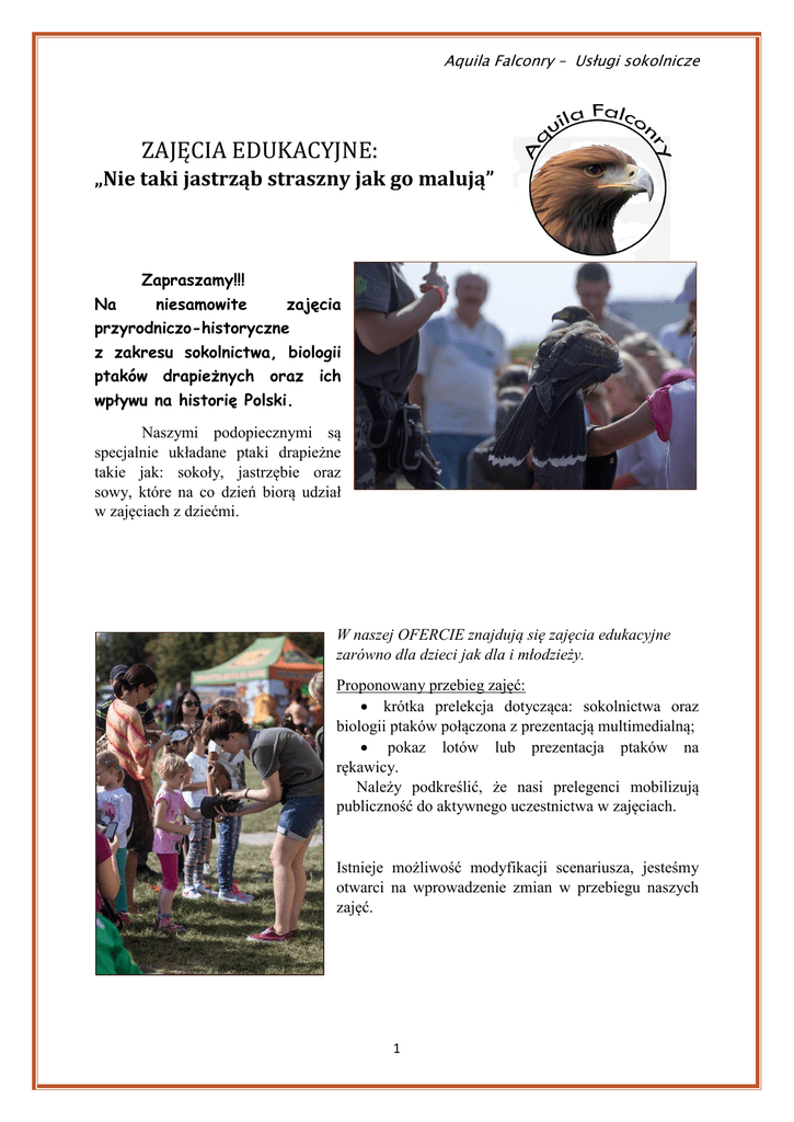 Aquila Falconry – Usługi sokolnicze ZAJĘCIA EDUKACYJNE: „Nie taki jastrząb straszny jak go malują” Na Zapraszamy!!! niesamowite zajęcia przyrodniczo-historyczne z zakresu sokolnictwa, biologii ptaków drapieżnych oraz ich wpływu na historię Polski. Naszymi podopiecznymi są specjalnie układane ptaki drapieżne takie jak: sokoły, jastrzębie oraz sowy, które na co dzień biorą udział w zajęciach z dziećmi. W naszej OFERCIE znajdują się zajęcia edukacyjne zarówno dla dzieci jak dla i młodzieży. Proponowany przebieg zajęć: krótka prelekcja dotycząca: sokolnictwa oraz biologii ptaków połączona z prezentacją multimedialną; pokaz lotów lub prezentacja ptaków na rękawicy. Należy podkreślić, że nasi prelegenci mobilizują publiczność do aktywnego uczestnictwa w zajęciach. Istnieje możliwość modyfikacji scenariusza, jesteśmy otwarci na wprowadzenie zmian w przebiegu naszych zajęć. 1 Aquila Falconry – Usługi sokolnicze Cena uzależniona jest od wielkości grupy, wariantu i charakteru naszych zajęć edukacyjnych. I tak np.: 1.) Warsztaty edukacyjne – mała grupa max. 30 osób, różne tematy wykładów poparte prezentacją multimedialną, przedstawienie ptaków na rękawicy. Miejsce przeprowadzenia zajęć - sala lekcyjna. Czas trwania: około jedna godzina lekcyjna. Proponowane tematy zajęć dla starszych grup: Ptaki drapieżne Polski i świata Ochrona ptaków drapieżnych; Historia sokolnictwa oraz tradycje myśliwskie; Wędrówki ptaków i ich budowa fizjologiczna. Koszt około 150 zł (brutto) od jednej grupy, min. 3 takie zajęcia jednego dnia z danej placówki. 2.) Lekcje przyrodnicze – duża grupa (np. wszystkie klasy z rocznika), krótka prelekcja połączona z pokazem lotów, podczas którego cała grupa wykonuje różne zadania ruchowe. Miejsce przeprowadzenia zajęć-boisko szkolne lub sala gimnastyczna. Koszt ok 600 zł (brutto). Czas trwania: około jedna godzina zegarowa. Kontakt: Grzegorz PALUCHOWSKI Tel. 510-140-541 e-mail: [email protected] Strona internetowa Facebook: Aquila Falconry 2