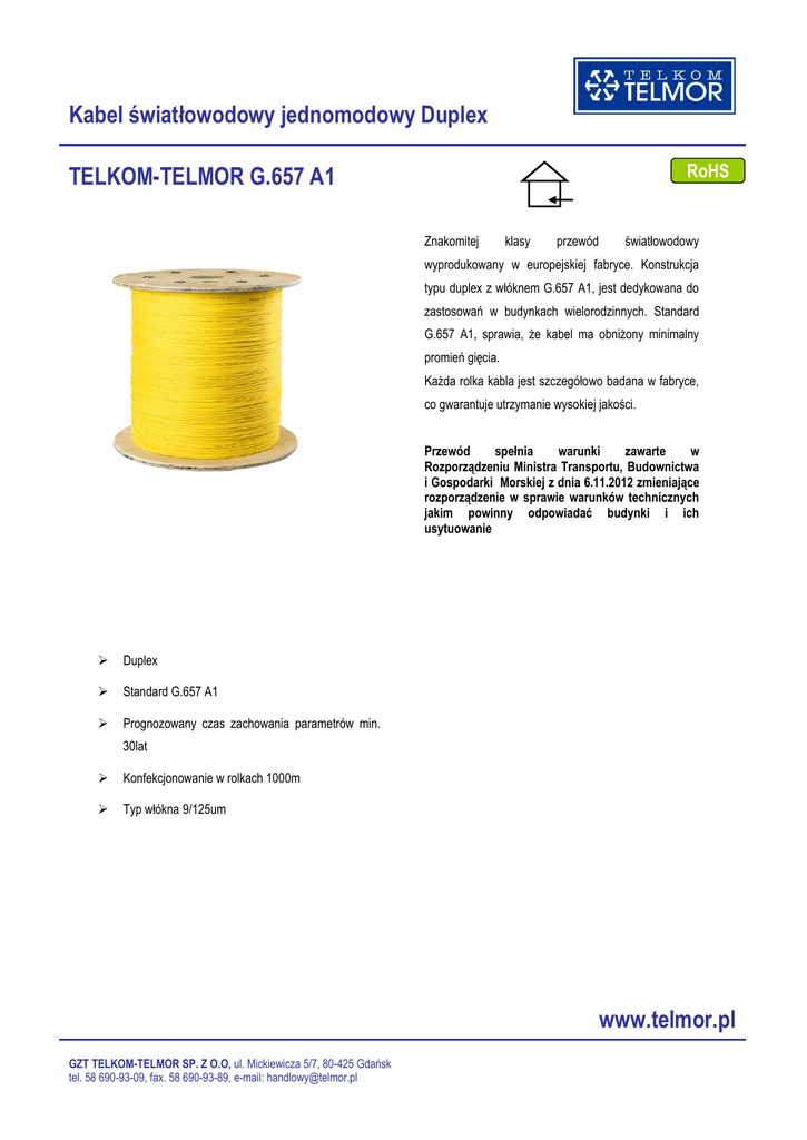 Kabel światłowodowy jednomodowy Duplex RoHS TELKOM-TELMOR G.657 A1 Znakomitej klasy przewód światłowodowy wyprodukowany w europejskiej fabryce. Konstrukcja typu duplex z włóknem G.657 A1, jest dedykowana do zastosowań w budynkach wielorodzinnych. Standard G.657 A1, sprawia, że kabel ma obniżony minimalny promień gięcia. Każda rolka kabla jest szczegółowo badana w fabryce, co gwarantuje utrzymanie wysokiej jakości. Przewód spełnia warunki zawarte w Rozporządzeniu Ministra Transportu, Budownictwa i Gospodarki Morskiej z dnia 6.11.2012 zmieniające rozporządzenie w sprawie warunków technicznych jakim powinny odpowiadać budynki i ich usytuowanie Duplex Standard G.657 A1 Prognozowany czas zachowania parametrów min. 30lat Konfekcjonowanie w rolkach 1000m Typ włókna 9/125um www.telmor.pl GZT TELKOM-TELMOR SP. Z O.O, ul. Mickiewicza 5/7, 80-425 Gdańsk tel. 58 690-93-09, fax. 58 690-93-89, e-mail: [email protected] PARAMETRY TECHNICZNE Typ Typ włókna Typ kabla Płaszcz Grubość płaszcza Średnica kabla Typ włókna Wymiary włókna Okno 1310nm Okno 1550nm Maksymalna wytrzymałość na rozciąganie Minimalny promień gięcia Masa mm mm mm dB/km dB/km Kabel optyczny TELKOM-TELMOR Duplex Konstrukcja kabla Jednomodowy duplex FR-LSZH żółty 0,37 2 x 4,49 G.657 A1 9/125um Tłumienie 0,342 0,213 Parametry fizyczne N 200 kg/km 15 x średnica kabla 20 Rys.1 Przekrój kabla Parametry techniczne mogą ulec zmianie bez wcześniejszego powiadomienia. GZT TELKOM-TELMOR SP. Z O.O, ul. Mickiewicza 5/7, 80-425 Gdańsk tel. 58 690-93-09, fax. 58 690-93-89, e-mail: [email protected] www.telmor.pl