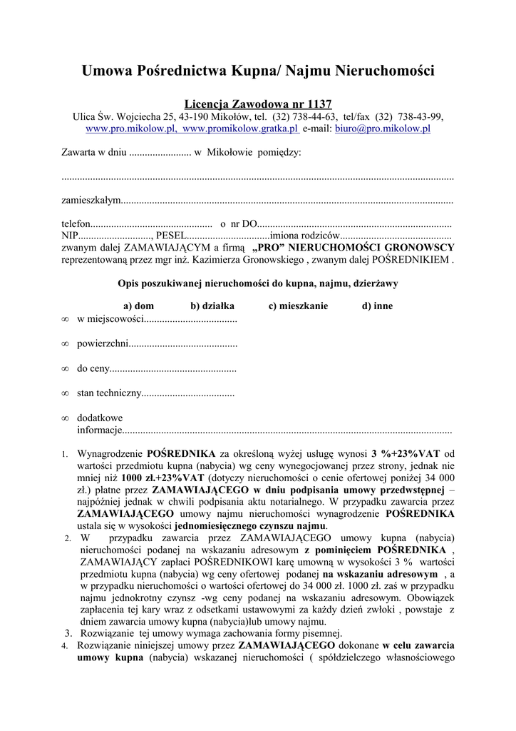 Umowa Pośrednictwa Kupna/ Najmu Nieruchomości Licencja Zawodowa nr 1137 Ulica Św. Wojciecha 25, 43-190 Mikołów, tel. (32) 738-44-63, tel/fax (32) 738-43-99, www.pro.mikolow.pl, www.promikolow.gratka.pl e-mail: [email protected] Zawarta w dniu ........................ w Mikołowie pomiędzy: ....................................................................................................................................................... zamieszkałym................................................................................................................................ telefon............................................... o nr DO........................................................................... NIP............................, PESEL................................imiona rodziców........................................... zwanym dalej ZAMAWIAJĄCYM a firmą „PRO” NIERUCHOMOŚCI GRONOWSCY reprezentowaną przez mgr inż. Kazimierza Gronowskiego , zwanym dalej POŚREDNIKIEM . Opis poszukiwanej nieruchomości do kupna, najmu, dzierżawy • a) dom b) działka w miejscowości.................................... c) mieszkanie d) inne • powierzchni.......................................... • do ceny................................................. • stan techniczny.................................... • dodatkowe informacje............................................................................................................................... Wynagrodzenie POŚREDNIKA za określoną wyżej usługę wynosi 3 %+23%VAT od wartości przedmiotu kupna (nabycia) wg ceny wynegocjowanej przez strony, jednak nie mniej niż 1000 zł.+23%VAT (dotyczy nieruchomości o cenie ofertowej poniżej 34 000 zł.) płatne przez ZAMAWIAJĄCEGO w dniu podpisania umowy przedwstępnej – najpóźniej jednak w chwili podpisania aktu notarialnego. W przypadku zawarcia przez ZAMAWIAJĄCEGO umowy najmu nieruchomości wynagrodzenie POŚREDNIKA ustala się w wysokości jednomiesięcznego czynszu najmu. 2. W przypadku zawarcia przez ZAMAWIAJĄCEGO umowy kupna (nabycia) nieruchomości podanej na wskazaniu adresowym z pominięciem POŚREDNIKA , ZAMAWIAJĄCY zapłaci POŚREDNIKOWI karę umowną w wysokości 3 % wartości przedmiotu kupna (nabycia) wg ceny ofertowej podanej na wskazaniu adresowym , a w przypadku nieruchomości o wartości ofertowej do 34 000 zł. 1000 zł. zaś w przypadku najmu jednokrotny czynsz -wg ceny podanej na wskazaniu adresowym. Obowiązek zapłacenia tej kary wraz z odsetkami ustawowymi za każdy dzień zwłoki , powstaje z dniem zawarcia umowy kupna (nabycia)lub umowy najmu. 3. Rozwiązanie tej umowy wymaga zachowania formy pisemnej. 4. Rozwiązanie niniejszej umowy przez ZAMAWIAJĄCEGO dokonane w celu zawarcia umowy kupna (nabycia) wskazanej nieruchomości ( spółdzielczego własnościowego 1. 5. 6. 7. 8. 9. prawa do lokalu mieszkalnego) z pominięciem POŚREDNIKA – rodzi obowiązek zapłaty kary umownej określonej w punkcie 2. POŚREDNIK nie ponosi odpowiedzialności za działania kupującego i sprzedającego podjęte po zawarciu umowy kupna a naruszające postanowienia tej umowy lub prawa i obowiązki stron POŚREDNIK może dochodzić od ZAMAWIAJĄCEGO odszkodowania za poniesioną szkodę , związaną z rozpowszechnianiem przez Niego otrzymanych ofert. W sprawach nieuregulowanych postanowieniami tej umowy mają zastosowanie odpowiednie przepisy Kodeksu Cywilnego. ZAMAWIAJĄCY oświadcza , że zapoznał się z treścią umowy oraz wyraża zgodę na przetwarzanie swoich danych osobowych niezbędnych do realizacji umowy i zgodnie z Ustawą z dnia 29.08.97 roku o ochronie danych osobowych. POŚREDNIK oświadcza , iż zgodnie z art. 181 ust. 3 Ustawy o Gospodarce Nieruchomościami jest ubezpieczony za szkody , które mogą wyniknąć w związku z wykonywaniem czynności pośrednictwa , oraz że zgodnie z ustawą z 21.08.1997r. O Gospodarce Nieruchomościami posiada licencję zawodową uprawniającą do działalności w zakresie pośrednictwa w obrocie nieruchomościami NR 1137. ZAMAWIAJĄCY zobowiązuje się do poinformowania POŚREDNIKA w terminie 7 dni od daty wydania wskazania adresowego o przyjęciu bądź odrzuceniu oferty, której wskazanie adresowe pokwitował. Uwaga : przy zakupie nieruchomości oprócz prowizji dla POŚREDNIKA do ceny nieruchomości należy doliczyć koszty transakcji tj.: taksa notarialna , opłata od czynności cywilno-prawnych oraz opłata sądowa pobierane przez notariusza przy akcie notarialnym .................................................... ZAMAWIAJĄCY- czytelny podpis ............................................... POŚREDNIK