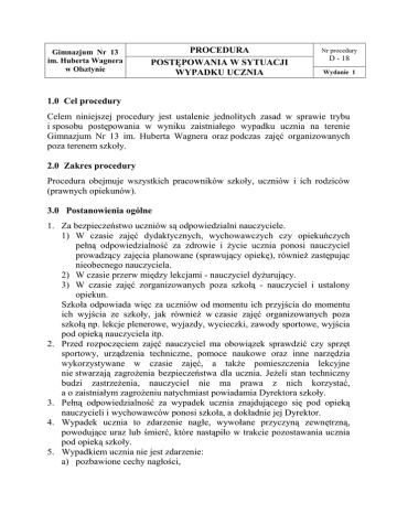 Gimnazjum Nr 13 im. Huberta Wagnera w Olsztynie PROCEDURA POSTĘPOWANIA W SYTUACJI WYPADKU UCZNIA Nr procedury D - 18 Wydanie 1 1.0 Cel procedury Celem niniejszej procedury jest ustalenie jednolitych zasad w sprawie trybu i sposobu postępowania w wyniku zaistniałego wypadku ucznia na terenie Gimnazjum Nr 13 im. Huberta Wagnera oraz podczas zajęć organizowanych poza terenem szkoły. 2.0 Zakres procedury Procedura obejmuje wszystkich pracowników szkoły, uczniów i ich rodziców (prawnych opiekunów). 3.0 Postanowienia ogólne 1. Za bezpieczeństwo uczniów są odpowiedzialni nauczyciele. 1) W czasie zajęć dydaktycznych, wychowawczych czy opiekuńczych pełną odpowiedzialność za zdrowie i życie ucznia ponosi nauczyciel prowadzący zajęcia planowane (sprawujący opiekę), również zastępując nieobecnego nauczyciela. 2) W czasie przerw między lekcjami - nauczyciel dyżurujący. 3) W czasie zajęć zorganizowanych poza szkołą - nauczyciel i ustalony opiekun. Szkoła odpowiada więc za uczniów od momentu ich przyjścia do momentu ich wyjścia ze szkoły, jak również w czasie zajęć organizowanych poza szkołą np. lekcje plenerowe, wyjazdy, wycieczki, zawody sportowe, wyjścia pod opieką nauczyciela itp. 2. Przed rozpoczęciem zajęć nauczyciel ma obowiązek sprawdzić czy sprzęt sportowy, urządzenia techniczne, pomoce naukowe oraz inne narzędzia wykorzystywane w czasie zajęć, a także pomieszczenia lekcyjne nie stwarzają zagrożenia bezpieczeństwa dla ucznia. Jeżeli stan techniczny budzi zastrzeżenia, nauczyciel nie ma prawa z nich korzystać, a o zaistniałym zagrożeniu natychmiast powiadamia Dyrektora szkoły. 3. Pełną odpowiedzialność za wypadek ucznia znajdującego się pod opieką nauczycieli i wychowawców ponosi szkoła, a dokładnie jej Dyrektor. 4. Wypadek ucznia to zdarzenie nagłe, wywołane przyczyną zewnętrzną, powodujące uraz lub śmierć, które nastąpiło w trakcie pozostawania ucznia pod opieką szkoły. 5. Wypadkiem ucznia nie jest zdarzenie: a) pozbawione cechy nagłości, b) które nie jest wywołane przyczyną zewnętrzną (czynnik wewnętrzny np. choroba), c) które nie spowodowało urazu lub śmierci, d) zaistniałe w czasie, w którym uczeń nie pozostawał pod opieką szkoły np. samowolnie opuścił zajęcia i teren szkoły, e) wywołane wyłącznie przez samego ucznia (np. samookaleczenie). 4.0 Algorytm postępowania 1. Pracownik szkoły, który powziął wiadomość o wypadku ucznia, niezwłocznie zapewnia poszkodowanemu opiekę, w szczególności sprowadzając fachową pomoc medyczną, a w miarę możliwości udzielając poszkodowanemu pierwszej pomocy. 2. Każdy uczeń szkoły, który uległ wypadkowi lub jest jego świadkiem ma obowiązek niezwłocznie poinformować o tym zdarzeniu nauczyciela lub innego pracownika szkoły. 3. Postępowanie w sytuacji zaistnienia wypadku lekkiego, który nie wymaga interwencji lekarza. 1) Po stwierdzeniu zdarzenia, w wyniku którego uczeń doznał stłuczenia, powierzchownego zadrapania lub zranienia należy odprowadzić go do gabinetu pielęgniarki szkolnej celem udzielenia pierwszej pomocy. Osobą odprowadzającą ucznia może być również pracownik obsługi szkolnej lub inny uczeń. Jeżeli stan ucznia nie pozwala na przejście do gabinetu, nauczyciel lub inny pracownik szkoły wzywa pielęgniarkę na miejsce zdarzenia. 2) W razie nieobecności pielęgniarki uczniowi pomocy udziela osoba wyznaczona do udzielania pierwszej pomocy lub inna mająca przeszkolenie w tym zakresie. 3) Osoba udzielająca pomocy jest zobowiązana ustalić, czy uczeń nie cierpi na chorobę, która w połączeniu z urazem może stanowić zagrożenie dla jego zdrowia lub życia - w takim wypadku należy wezwać pogotowie ratunkowe. 4) O wypadku i jego przyczynach nauczyciel powiadamia Dyrektora szkoły. Rodzice (prawni opiekunowie) ucznia informowani są o zaistniałym zdarzeniu przez osobę pod której opieką był uczeń w chwili doznania uszczerbku na zdrowiu lub udzielającą pomocy poszkodowanemu. Z rodzicami poszkodowanego ustala się ewentualną konieczność odbioru ucznia ze szkoły przed zakończeniem zajęć. 5) Jeżeli przyczyną zdarzenia była wadliwość lub niesprawność urządzeń szkolnych, nauczyciel natychmiast zaprzestaje jego dalszego użytkowania, fakt ten zgłasza kierownikowi gospodarczemu i w miarę możliwości zabezpiecza sprzęt przed dalszym z niego korzystaniem. 1 4. Postępowanie w sytuacji zaistnienia wypadku lekkiego, które może wymagać interwencji lekarza. 1) Po stwierdzeniu, że wypadek, któremu uległ uczeń, wymaga specjalistycznej pomocy (np. zwichnięcie, skręcenie, rana wymagająca zszycia), należy skontaktować się z rodzicami (prawnymi opiekunami) poszkodowanego i wspólnie ustalić przebieg dalszego udzielenia dziecku pomocy (np. konieczność wizyty u lekarza specjalisty). W sytuacji wymagającej natychmiastowego reagowania należy wezwać pogotowie ratunkowe. 2) Do czasu przybycia rodziców poszkodowanego lub wezwanego pogotowia ratunkowego, pielęgniarka szkolna lub osoba przeszkolona w udzielaniu pierwszej pomocy przedmedycznej podejmują niezbędne czynności ratujące zdrowie i życie ucznia. 3) Uczniowi nie podaje się żadnych leków bez konsultacji z rodzicami (prawnymi opiekunami). 4) Jeżeli przyczyną zdarzenia była wadliwość lub niesprawność urządzeń szkolnych, nauczyciel natychmiast zaprzestaje jego dalszego użytkowania, miejsce wypadku pozostawia się nienaruszone. Fakt ten zgłasza Dyrektorowi szkoły, który zabezpiecza sprzęt i miejsce do czasu dokonania oględzin przez zespół powypadkowy. 5. Postępowanie w sytuacji zaistnienia wypadku powodującego ciężkie uszkodzenie ciała lub ze skutkiem śmiertelnym. 1) W sytuacji, kiedy nastąpiło ciężkie uszkodzenie ciała, należy natychmiast wezwać pogotowie ratunkowe, a do czasu jego przyjazdu pielęgniarka szkolna lub osoba przeszkolona w zakresie udzielania pierwszej pomocy prz