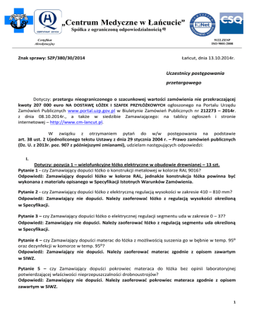 „Centrum Medyczne w Łańcucie” Spółka z ograniczoną odpowiedzialnością 9122.ZESP ISO 9001:2008 Certyfikat Akredytacyjny Znak sprawy: SZP/380/30/2014 Łańcut, dnia 13.10.2014r. Uczestnicy postępowania przetargowego Dotyczy: przetargu nieograniczonego o szacunkowej wartości zamówienia nie przekraczającej kwoty 207 000 euro NA DOSTAWĘ ŁÓŻEK I SZAFEK PRZYŁÓŻKOWYCH ogłoszonego na Portalu Urzędu Zamówień Publicznych www.portal.uzp.gov.pl w Biuletynie Zamówień Publicznych nr 212273 – 2014r. z dnia 08.10.2014r., a także w siedzibie Zamawiającego: na tablicy ogłoszeń i stronie internetowej – http://www.cm-lancut.pl. W związku z otrzymaniem pytań do w/w postępowania na podstawie art. 38 ust. 2 Ujednoliconego tekstu Ustawy z dnia 29 stycznia 2004 r. – Prawo zamówień publicznych (Dz. U. z 2013r. poz. 907 z późniejszymi zmianami), udzielam następujących odpowiedzi: I. Dotyczy: pozycja 1 – wielofunkcyjne łóżko elektryczne w obudowie drewnianej – 13 szt. Pytanie 1 - czy Zamawiający dopuści łóżko o konstrukcji metalowej w kolorze RAL 9016? Odpowiedź: Zamawiający dopuści łóżko w kolorze RAL, jednakże konstrukcja łóżka powinna być wykonana z materiału opisanego w Specyfikacji Istotnych Warunków Zamówienia. Pytanie 2 - czy Zamawiający dopuści łóżko z elektryczną regulacją wysokości w zakresie 410 – 810 mm? Odpowiedź: Zamawiający nie dopuści. Należy zaoferować łóżko z regulacją wysokości określoną w Specyfikacji. Pytanie 3 – czy Zamawiający dopuści łóżko o elektrycznej regulacji segmentu uda w zakresie 0 – 37? Odpowiedź: Zamawiający nie dopuści. Należy zaoferować łóżko z regulacją segmentu uda określoną w Specyfikacji. Pytanie 4 – czy Zamawiający dopuści materac do łóżka z możliwością suszenia go w bębnie w temp. 95⁰ oraz dezynfekcji w komorze w temp. 95⁰? Odpowiedź: Zamawiający nie dopuści. Należy zaoferować materac zgodnie z opisem zawartym w SIWZ. Pytanie 5 – czy Zamawiający dopuści pokrowiec materaca do łóżka bez opinii laboratoryjnej potwierdzającej właściwości nieprzepuszczalności drobnoustrojów? Odpowiedź: Zamawiający nie dopuści. Należy zaoferować pokrowiec materaca zgodnie z opisem zawartym w SIWZ. 1 Dotyczy: pozycja 2 – wielofunkcyjne łóżko elektryczne – 13 szt. Pytanie 1 – czy Zamawiający dopuści łóżko o konstrukcji podpartej w 6 punktach, które to rozwiązanie nie ujmuje stabilności łóżka? Odpowiedź: Zamawiający nie dopuści. Należy zaoferować łóżko zgodne z opisem zawartym w SIWZ. Pytanie 2 – czy Zamawiający dopuści łóżko o szerokości całkowitej 1000 mm? Odpowiedź: Tak. Pytanie 3 – czy Zamawiający dopuści łóżko o długości całkowitej 2220 mm? Odpowiedź: Tak. Pytanie 4 - czy Zamawiający dopuści łóżko z elektryczną regulacją wysokości w zakresie 420 – 800 mm? Odpowiedź: Zamawiający nie dopuści. Należy zaoferować łóżko z regulacją wysokości określoną w Specyfikacji. Pytanie 5 – czy Zamawiający dopuści łóżko z leżem wypełnionym profilowanymi, metalowymi, lakierowanymi lamelami – w kształcie spłaszczonej, odwróconej litery C, z krawędziami zaokrąglonymi do dołu, rozmieszczonymi w leżu stosownie do nacisku ciała pacjenta. Leże umożliwiające przeprowadzenie reanimacji, dające dobre wsparcie dla materaca, łatwe w dezynfekcji, odporne na rozwój mikroorganizmów, bezpieczne dla pacjenta? Odpowiedź: Zamawiający nie dopuści. Należy zaoferować łóżko zgodne z opisem zawartym w Specyfikacji Istotnych Warunków Zamówienia. Pytanie 6 – czy Zamawiający dopuści łóżko z metalowymi uchwytami materaca, dostosowującymi się do różnych szerokości materaca, umieszczonymi w leżu w taki sposób, że nie narażają pacjenta na urazy? Odpowiedź: Zamawiający nie dopuści. Należy zaoferować łóżko zgodne z opisem zawartym w Specyfikacji Istotnych Warunków Zamówienia. Pytanie 7 – czy Zamawiający dopuści materac do łóżka z możliwością suszenia go w bębnie w temp. 95⁰ oraz dezynfekcji w komorze w temp. 95⁰? Odpowiedź: Zamawiający nie dopuści. Należy zaoferować materac zgodnie z opisem zawartym w SIWZ. Pytanie 8 – czy Zamawiający dopuści pokrowiec materaca do łóżka bez opinii laboratoryjnej potwierdzającej właściwości nieprzepuszczalności drobnoustrojów? Odpowiedź: Zamawiający nie dopuści. Należy zaoferować pokrowiec materaca zgodnie z opisem zawartym w SIWZ. Dotyczy: pozycja 3 – łóżko wielopozycyjne – 1 szt. Pytanie 1 - czy Zamawiający dopuści łóżko o konstrukcji podpartej w 6 punktach, które to rozwiązanie jest lepsze? Odpowiedź: Zamawiający dopuści. Pytanie 2 – czy Zamawiający dopuści łóżko o długości całkowitej 2220 mm? Odpowiedź: Tak. Pytanie 3 – czy Zamawiający dopuści łóżko o wymiarach leża 850 x 2000 mm? Odpowiedź: Zamawiający nie dopuści. Należy zaoferować łóżko zgodne z opisem zawartym w Specyfikacji Istotnych Warunków Zamówienia. 2 Pytanie 4 – czy Zamawiający dopuści łóżko z elektryczną regulacją wysokości w zakresie 420 – 800 mm? Odpowiedź: Zamawiający nie dopuści. Należy zaoferować łóżko z regulacją wysokości określoną w Specyfikacji. Pytanie 5 – czy Zamawiający dopuści łóżko o wymiarach poszczególnych segmentów leża: 780/160/300/590 mm? Zamawiający nie dopuści. Należy zaoferować łóżko zgodne z opisem zawartym w SIWZ. Pytanie 6 – czy Zamawiający dopuści łóżko z leżem wypełnionym profilowanymi, metalowymi, lakierowanymi lamelami – w kształcie spłaszczonej, odwróconej litery C, z krawędziami zaokrąglonymi do dołu, rozmieszczonymi w leżu stosownie do nacisku ciała pacjenta. Leże umożliwiające przeprowadzenie reanimacji, dające dobre wsparcie dla materaca, łatwe w dezynfekcji, odporne na rozwój mikroorganizmów, bezpieczne dla pacjenta? Odpowiedź: Zamawiający nie dopuści. Należy zaoferować łóżko