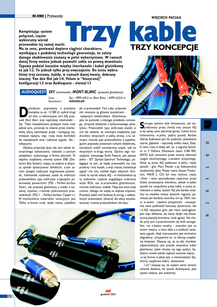 HI-END Przewody WOJCIECH PACU£A Trzy kable Kompletuj¹c system po³¹czeñ, czêsto wybieramy wœród przewodów tej samej marki. Ma to sens, poniewa¿ dopiero ci¹g³oœæ charakteru, wynikaj¹ca z podobnej technologii gwarantuje, ¿e zalety danego okablowania zostan¹ w pe³ni wykorzystane. W ramach danej firmy mo¿na jednak pozwoliæ sobie na pewn¹ dowolnoœæ. Typowy podzia³ kosztów miêdzy interkonekt i kabel g³oœnikowy to jak 1:2. To jednak tylko przy-zwyczajenie. Do testu wybraliœmy trzy zestawy, ka¿dy, w ramach danej kwoty, dobrany inaczej: Van den Hul jak 1:4, Velum w “klasycznej” konfiguracji 1:2 oraz Audioquest - niemal 1:1 AUDIOQUEST SKY (interkonekt) MONT-BLANC Cena: Dystrybutor: D (przewód g³oœnikowy) Sky – 4999 z³/0,5 m; Mont Blanc – 6499 z³/2x3 m AUDIOKLAN £ U C H ynergia systemu by³a fantastyczna, zaœ wypróbowany przez chwilê inny zestaw AQ w tej samej cenie zabrzmia³ gorzej. Ca³oœæ brzmi koherentnie, w pe³ny, piêkny sposób. Bardzo dobrze budowane jest t³o wydarzeñ: jedwabiœcie czarne, g³êbokie – naprawdê wielka rzecz. Dziêki temu cisza w du¿ej sali, np. z nagrania Symfonii nr 5 Mahlera (Pentatone classic 5186 004, SACD) by³a namacalna przez swoist¹ obecnoœæ czegoœ nieuchwytnego, a zarazem oczywistego. G³osy s¹ przez AQ podawane w pe³ny, ciep³y sposób – g³os Marii Peszek z jej debiutanckiej (znakomitej) p³yty Miasto mania (Kayax Production, 44678 2, CD) by³ wiêc intymny, ciep³y i bliski – rzecz spowodowana czêœciowo przez bliskie umieszczenie mikrofonu, jednak w ¿aden sposób nie uwypuklona przez kable, a raczej zamieniona w zaletê. System AQ jest bardzo wra¿liwy na wszelkie zmiany dynamiki nagrania, poniewa¿ jest bardziej neutralny ni¿ np. VDH, który w swoim – szalenie przyjemnym – entuzjazmie nieco podkreœla³ kontrasty dynamiczne. Ale i w AQ najwy¿sza góra jest nieco zaokr¹glona. Jest wiêc delikatna, ale mamy dziêki niej fantastyczn¹ plastykê brzmienia i brak agresji. Nie chodzi przy tym o przyciemnienie czy brak szczegó³ów, nie o balans tonalny – wszystko jest na swoim miejscu, a rzecz idzie a o szybkoœæ narastania sygna³u. Atak instrumentów jest minimalnie z³agodzony i przypomina to, co oferuj¹ urz¹dzenia lampowe. Okazuje siê, ¿e za taki charakter odpowiedzialny jest przede wszystkim kabel g³oœnikowy. Je¿eli chcemy siê tego pozbyæ, bêdziemy musieli jednak zap³aciæ znacznie wiêcej – w tej formie w jakiej jest, z interkonektem Sky, tworzy wyj¹tkowo dobre zestawienie. I co? I okazuje siê, ¿e czasem warto zmieniæ schemat dzia³ania, bo system Audioquesta, jako system w³aœnie, jest znakomity. S grudzieñ 2005 S D jak w przewodach Tara Labs, przewodniki otoczone s¹ g³ównie powietrzem – najlepszym dielektrykiem. G³oœnikowy, jako ¿e pochodzi z ni¿szego przedzia³u cenowego, otrzyma³ dielektryk z karbonowanego polietylenu. Przewodniki typu solid-state zosta³y w nim tak u³o¿one, ¿e wewn¹trz znajdziemy piêæ drucików skrêconych w jedn¹ stronê, a na zewn¹trz równie¿ piêæ przewodników z wype³niaj¹cymi pozosta³¹ przestrzeñ rurkami dielektryka, owiniêtych wokó³ wewnêtrznej wi¹zki, tyle ¿e skrêconych w drug¹ stronê. Oprócz tego rozwi¹zania, nazwanego Earth Feature, jest jeszcze jedno – SST (Spread Spectrum Technology), polegaj¹ce na tym, ¿e ka¿dy przewodnik ma inny przekrój i inny kszta³t, a wiêc inaczej transmituje sygna³ i ma inny rozk³ad drgañ w³asnych. Koñcówki to wyrób w³asny AQ – w interkonekcie s¹ to znakomite i piêknie wygl¹daj¹ce srebrzone wtyki RCA, zaœ w przewodzie g³oœnikowym, równie¿ srebrzone, wide³ki. Maj¹ one nieco ma³y rozmiar, dlatego nie wejd¹ na wiêksze trzpienie. Przys³any kabel mia³ budowê bi-wiring, z oddzielonymi przewodami (dwoma) dla sekcji wysokotonowej i trzema przewodnikami dla basu. O ystrybutor, poproszony o przys³anie kompletu za ok. 12 000 z³, wybra³ drugi od do³u w referencyjnej serii AQ przewód Mont Blanc oraz najdro¿szy interkonekt – Sky. Takie nieszablonowe podejœcie mo¿e mieæ jednak sens, poniewa¿ to w³aœnie przez interkonekty p³yn¹ najmniejsze pr¹dy i wystêpuj¹ najmniejsze napiêcia, wiêc i tutaj mo¿e dochodziæ do najwiêkszych strat i zak³óceñ sygna³u. Ale – zobaczymy. Obydwa przewody ³¹czy taki sam odcieñ zewnêtrznego wykoñczenia, niebieski z czarnym przeplotem, wykonanego w formie plecionki. W obydwu znajdziemy równie¿ system DBS (Dielectric Bias System), maj¹cy za zadanie w aktywny sposób spolaryzowaæ dielektryk, a tym samym zast¹piæ tradycyjne wygrzewanie przewodu. Interkonekt wykonany zosta³ ze srebrnych przewodników typu solid-state o specjalnie polerowanej powierzchni (PSS – Perfect-Surface Silver), zaœ przewód g³oœnikowy z miedzi o wysokiej czystoœci i równie¿ polerowanych przewodnikach (PSC+ – Perfect-Surface Copper+). W interkonekcie materia³em izolacyjnym jest Teflon w formie rurek, dziêki czemu, podobnie 72 TRZY KONCEPCJE