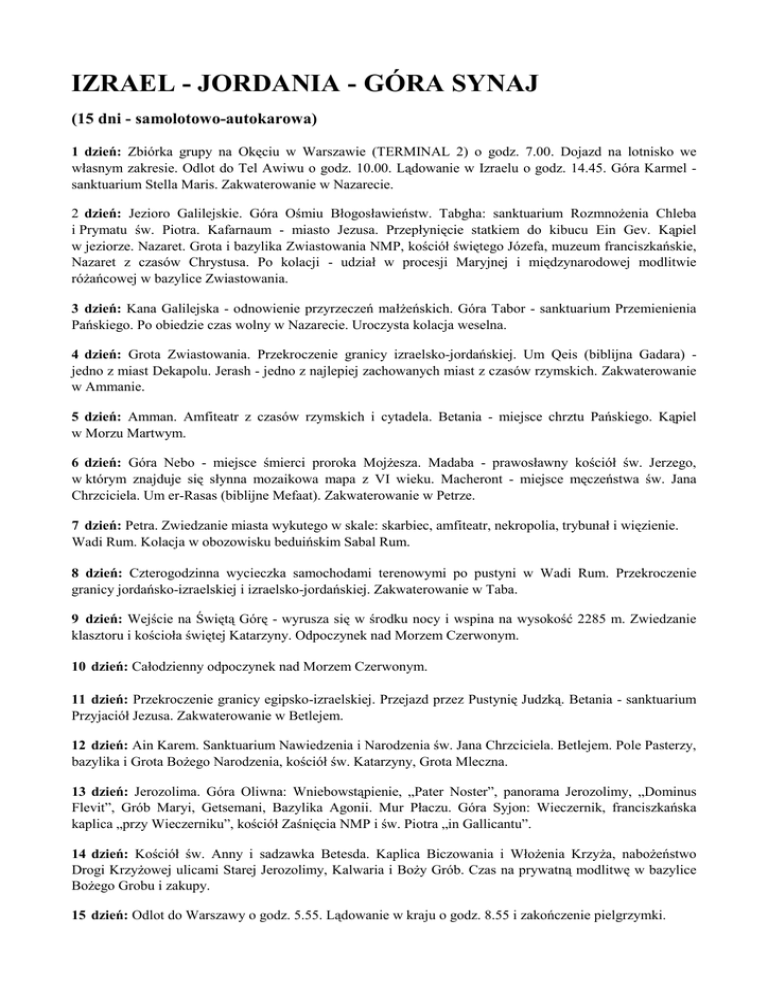 IZRAEL - JORDANIA - GÓRA SYNAJ (15 dni - samolotowo-autokarowa) 1 dzień: Zbiórka grupy na Okęciu w Warszawie (TERMINAL 2) o godz. 7.00. Dojazd na lotnisko we własnym zakresie. Odlot do Tel Awiwu o godz. 10.00. Lądowanie w Izraelu o godz. 14.45. Góra Karmel sanktuarium Stella Maris. Zakwaterowanie w Nazarecie. 2 dzień: Jezioro Galilejskie. Góra Ośmiu Błogosławieństw. Tabgha: sanktuarium RozmnoŜenia Chleba i Prymatu św. Piotra. Kafarnaum - miasto Jezusa. Przepłynięcie statkiem do kibucu Ein Gev. Kąpiel w jeziorze. Nazaret. Grota i bazylika Zwiastowania NMP, kościół świętego Józefa, muzeum franciszkańskie, Nazaret z czasów Chrystusa. Po kolacji - udział w procesji Maryjnej i międzynarodowej modlitwie róŜańcowej w bazylice Zwiastowania. 3 dzień: Kana Galilejska - odnowienie przyrzeczeń małŜeńskich. Góra Tabor - sanktuarium Przemienienia Pańskiego. Po obiedzie czas wolny w Nazarecie. Uroczysta kolacja weselna. 4 dzień: Grota Zwiastowania. Przekroczenie granicy izraelsko-jordańskiej. Um Qeis (biblijna Gadara) jedno z miast Dekapolu. Jerash - jedno z najlepiej zachowanych miast z czasów rzymskich. Zakwaterowanie w Ammanie. 5 dzień: Amman. Amfiteatr z czasów rzymskich i cytadela. Betania - miejsce chrztu Pańskiego. Kąpiel w Morzu Martwym. 6 dzień: Góra Nebo - miejsce śmierci proroka MojŜesza. Madaba - prawosławny kościół św. Jerzego, w którym znajduje się słynna mozaikowa mapa z VI wieku. Macheront - miejsce męczeństwa św. Jana Chrzciciela. Um er-Rasas (biblijne Mefaat). Zakwaterowanie w Petrze. 7 dzień: Petra. Zwiedzanie miasta wykutego w skale: skarbiec, amfiteatr, nekropolia, trybunał i więzienie. Wadi Rum. Kolacja w obozowisku beduińskim Sabal Rum. 8 dzień: Czterogodzinna wycieczka samochodami terenowymi po pustyni w Wadi Rum. Przekroczenie granicy jordańsko-izraelskiej i izraelsko-jordańskiej. Zakwaterowanie w Taba. 9 dzień: Wejście na Świętą Górę - wyrusza się w środku nocy i wspina na wysokość 2285 m. Zwiedzanie klasztoru i kościoła świętej Katarzyny. Odpoczynek nad Morzem Czerwonym. 10 dzień: Całodzienny odpoczynek nad Morzem Czerwonym. 11 dzień: Przekroczenie granicy egipsko-izraelskiej. Przejazd przez Pustynię Judzką. Betania - sanktuarium Przyjaciół Jezusa. Zakwaterowanie w Betlejem. 12 dzień: Ain Karem. Sanktuarium Nawiedzenia i Narodzenia św. Jana Chrzciciela. Betlejem. Pole Pasterzy, bazylika i Grota BoŜego Narodzenia, kościół św. Katarzyny, Grota Mleczna. 13 dzień: Jerozolima. Góra Oliwna: Wniebowstąpienie, „Pater Noster”, panorama Jerozolimy, „Dominus Flevit”, Grób Maryi, Getsemani, Bazylika Agonii. Mur Płaczu. Góra Syjon: Wieczernik, franciszkańska kaplica „przy Wieczerniku”, kościół Zaśnięcia NMP i św. Piotra „in Gallicantu”. 14 dzień: Kościół św. Anny i sadzawka Betesda. Kaplica Biczowania i WłoŜenia KrzyŜa, naboŜeństwo Drogi KrzyŜowej ulicami Starej Jerozolimy, Kalwaria i BoŜy Grób. Czas na prywatną modlitwę w bazylice BoŜego Grobu i zakupy. 15 dzień: Odlot do Warszawy o godz. 5.55. Lądowanie w kraju o godz. 8.55 i zakończenie pielgrzymki. ♦ Codziennie odprawiana jest Msza święta ♦ Organizatorzy zastrzegają sobie moŜliwość zmian w programie ♦ Przewodnikiem grupy w Izraelu jest Ks. Emil Furtak, zaś w Egipcie i Jordanii oprowadza miejscowy przewodnik ♦ Kapłani zabierają albę i białą stułę TERMIN PIELGRZYMKI 2-16 lipca 2010 roku CENA PIELGRZYMKI 2050 zł i 1610 USD (dopłata za pokój jednoosobowy wynosi 450 USD) Osoby, które ukończyły 65 rok Ŝycia oraz przewlekle chore zobowiązane są do wykupienia dodatkowego ubezpieczenia, którego koszt wynosi 300 zł ORGANIZATORZY ZAPEWNIAJĄ □ □ □ □ □ □ □ przelot samolotem na trasie Warszawa-Tel Awiw i Tel Awiw-Warszawa pełne wyŜywienie (śniadanie, obiad [wyjątek 10 dzień] i kolacja) zakwaterowanie w hotelach (pokoje 2 lub 3 osobowe z łazienką) autokar do dyspozycji grupy, przewodnik po miejscach świętych wszystkie bilety wstępu, taksówka na Górę Tabor, statek po Jeziorze Galilejskim opłaty przekroczenia granic oraz wiza egipska i jordańska ubezpieczenie, mapa i przewodnik-śpiewnik, znak grupy, certyfikat pielgrzyma B L I ś S Z E I N F O R M A C J E Parafia pw. Narodzenia NMP w Płokach Płoki, ul. Główna , 32-543 Myślachowice tel./fax: 032-6137163 oraz Fundacja Komisariat Ziemi Świętej ul. Reformacka 4, 31-012 Kraków tel./fax 012-421-68-06; 012-422-79-84 www. terrasancta.pl e-mail: [email protected] biuro czynne: od poniedziałku do piątku 900-1645 (środa jest dniem bez stron)