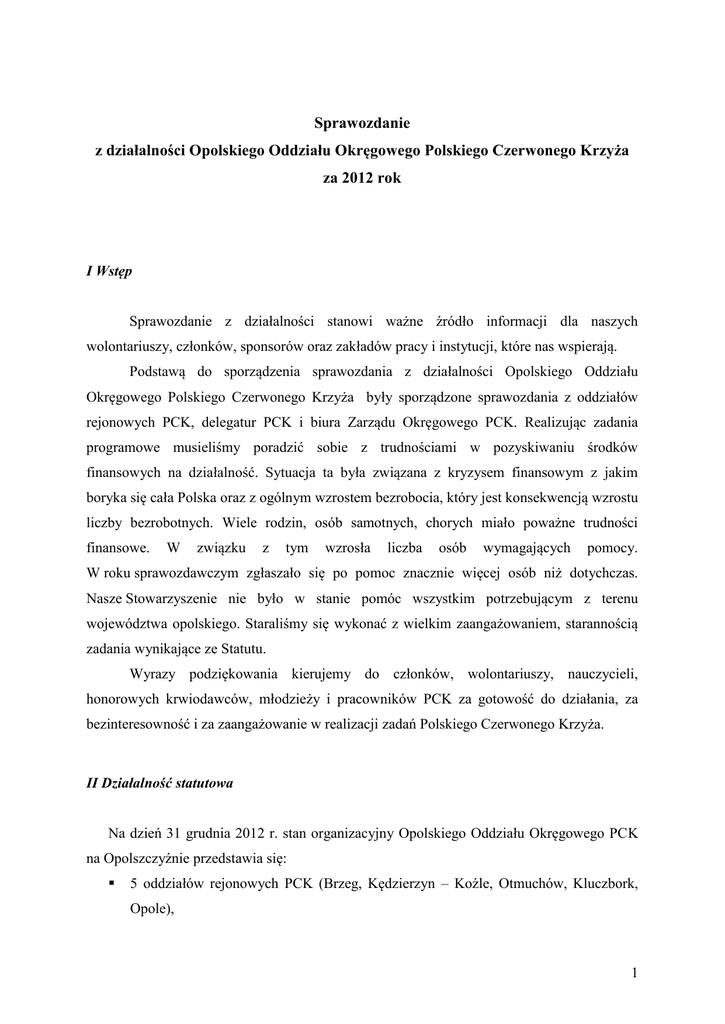 Sprawozdanie z działalności Opolskiego Oddziału Okręgowego Polskiego Czerwonego Krzyża za 2012 rok I Wstęp Sprawozdanie z działalności stanowi ważne źródło informacji dla naszych wolontariuszy, członków, sponsorów oraz zakładów pracy i instytucji, które nas wspierają. Podstawą do sporządzenia sprawozdania z działalności Opolskiego Oddziału Okręgowego Polskiego Czerwonego Krzyża były sporządzone sprawozdania z oddziałów rejonowych PCK, delegatur PCK i biura Zarządu Okręgowego PCK. Realizując zadania programowe musieliśmy poradzić sobie z trudnościami w pozyskiwaniu środków finansowych na działalność. Sytuacja ta była związana z kryzysem finansowym z jakim boryka się cała Polska oraz z ogólnym wzrostem bezrobocia, który jest konsekwencją wzrostu liczby bezrobotnych. Wiele rodzin, osób samotnych, chorych miało poważne trudności finansowe. W związku z tym wzrosła liczba osób wymagających pomocy. W roku sprawozdawczym zgłaszało się po pomoc znacznie więcej osób niż dotychczas. Nasze Stowarzyszenie nie było w stanie pomóc wszystkim potrzebującym z terenu województwa opolskiego. Staraliśmy się wykonać z wielkim zaangażowaniem, starannością zadania wynikające ze Statutu. Wyrazy podziękowania kierujemy do członków, wolontariuszy, nauczycieli, honorowych krwiodawców, młodzieży i pracowników PCK za gotowość do działania, za bezinteresowność i za zaangażowanie w realizacji zadań Polskiego Czerwonego Krzyża. II Działalność statutowa Na dzień 31 grudnia 2012 r. stan organizacyjny Opolskiego Oddziału Okręgowego PCK na Opolszczyźnie przedstawia się: 5 oddziałów rejonowych PCK (Brzeg, Kędzierzyn – Koźle, Otmuchów, Kluczbork, Opole), 1 3 delegatury PCK (Grodków, Olesno, Nysa), 10 kół środowiskowych PCK zrzeszających 198 członków i 67 wolontariuszy, 55 Klubów HDK PCK zrzeszających 1.091 członków i 2.846 wolontariuszy, 136 szkolnych kół PCK zrzeszających 2.299 członków i 697 wolontariuszy: - 71 koła PCK w szkołach podstawowych zrzeszające 997 członków i 275 wolontariuszy, - 33 koła PCK w szkołach gimnazjalnych zrzeszające 691 członków i 216 wolontariuszy, - 22 koła PCK w szkołach ponadgimnazjalnych zrzeszające 462 członków i 172 wolontariuszy, - 1 koło PCK w szkole pomaturalnej zrzeszające 10 członków PCK i 3 wolontariuszy, - 6 kół PCK w zespole szkół zrzeszające 106 członków i 21 wolontariuszy, - 3 Grupy SIM PCK w Opolu, Brzegu, Otmuchowie zrzeszające 33 członków i 10 wolontariuszy, - 79 Klubów Wiewiórka PCK zrzeszających 2.251 członków: o 40 Klubów w szkołach podstawowych zrzeszających 1.013członków, o 39 Klubów w przedszkolach zrzeszających 1.238 członków. - 1 Grupa Ratownictwa PCK w Opolu zrzeszająca 16 członków, - 1 Grupa Pomocy Humanitarnej PCK zrzeszająca 10 członków. W 2012 roku Zarząd Opolskiego Oddziału Okręgowego PCK odbył 10 posiedzeń, w trakcie których podjął 14 uchwał. Na posiedzeniach Zarządu omawiana była sytuacja finansowa całego oddziału, omawiano bieżące sprawy: honorowego krwiodawstwa, młodzieżowe, pomocy socjalnej, szkoleń z zakresu pierwszej pomocy i prawa humanitarnego. Okręgowa Komisja Rewizyjna PCK odbyła 5 posiedzeń, przeprowadziła 4 kontrole w Oddziale Okręgowym PCK. Okręgowa Rada HDK PCK odbyła 1 posiedzenie. Komisja Odznaczeń odbyła 2 posiedzenia, na których rozpatrzyła 32 wnioski. 2 III Działalność dziecięco – młodzieżowa Najliczniejszą rzeszą członków i wolontariuszy PCK stanowi młodzież. Podejmowane przez nas działania zachęcają do aktywności młodzież i zmierzają do pozyskania nowych członków szkolnych kół PCK. W tym roku kontynuowano realizację programu „Super wiewiórka przyjaciółka Oli i Kuby”, którego celem było wykształcenie u dzieci w wieku szkolnym i przedszkolnym nawyków dbałości o bezpieczeństwo, higienę, tolerancję i pomoc potrzebującym. Kolejne programy, które były realizowane to „Dbam o swoje zdrowie” – dot. zdrowego odżywiania adresowane do przedszkoli i pierwszych klas szkoły podstawowej oraz „Ratowniczek” – nauka pierwszej pomocy w klasach I i II oraz III – IV szkół podstawowych. Grupa wolontariuszy PCK z Opola brała udział w I Festiwalu Wolontariatu organizowanym przez Urząd Miasta Opola. W ciągu dwóch dni tj. 11-12.05.2012 r. w hali „Cieplak” zaprezentowało się ponad 50 organizacji pozarządowych – ze strony opolskiego trzeciego sektora. Każdego roku czynione są starania o pozyskanie środków finansowych na zorganizowanie akcji letniej. W okresie od 1 – 14 VII zorganizowano akcję letnią dla 75 dzieci w Sulejowie. Na wypoczynek dzieci pojechały z Opola, Brzegu, Kędzierzyna – Koźla i Otmuchowa. Środki finansowe pochodziły z dotacji Miasta Opola, Gminy Otmuchów, Miasta Brzegu i Powiatu Nyskiego oraz z akcji „Gorączka Złota” i kwest ulicznych. Młodzież szkolna poprzez aktywny udział w różnych akcjach jak: „Wielkanoc z PCK”, „Gorączka Złota”, „Wyprawka dla Żaka”, „Kampania Wali z Głodem”, „Czerwonokrzyska Gwiazdka”, uczyła się wrażliwości na potrzeby innych osób potrzebujących pomocy, dawało im to satysfakcję z bycia potrzebnym. Aby działalność Stowarzyszenia była, na bieżąco kontynuowana przez cały rok, organizowane były konferencje z opiekunami szkolnych kół PCK i klubów wiewiórka PCK w poszczególnych rejonach. Na konferencjach tych omawiana była działalność jednostek podstawowych, zwracano uwagę na właściwe opracowywanie planów pracy, wytyczano nowe kierunki działań w zależności od potrzeb rejonu. Oddział Rejonowy PCK w Otmuchowie zorganizował Konkurs Czerwonokrzyski na najaktywniejsze szkolne koło PCK. Celem konkursu było umacnianie podstawowych jednostek organizacyjnych. W konkursie tym zwyciężyło Szkolne Koło PCK w Mesznie 3 (szkoły podstawowe) i Szkolne Koło PCK w Paczkowie (Publiczne Gimnazjum). Zw