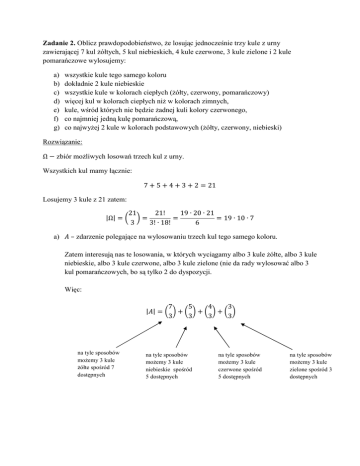 Zadanie 2. Oblicz prawdopodobieństwo, że losując jednocześnie trzy kule z urny zawierającej 7 kul żółtych, 5 kul niebieskich, 4 kule czerwone, 3 kule zielone i 2 kule pomarańczowe wylosujemy: a) b) c) d) e) f) g) wszystkie kule tego samego koloru dokładnie 2 kule niebieskie wszystkie kule w kolorach ciepłych (żółty, czerwony, pomarańczowy) więcej kul w kolorach ciepłych niż w kolorach zimnych, kule, wśród których nie będzie żadnej kuli kolory czerwonego, co najmniej jedną kulę pomarańczową, co najwyżej 2 kule w kolorach podstawowych (żółty, czerwony, niebieski) Rozwiązanie: Ω zbiór możliwych losowań trzech kul z urny. Wszystkich kul mamy łącznie: 7 5 4 3 2 21 Losujemy 3 kule z 21 zatem: |Ω| 21 21! 19 ∙ 20 ∙ 21 19 ∙ 10 ∙ 7 3 3! ∙ 18! 6 a) – zdarzenie polegające na wylosowaniu trzech kul tego samego koloru. Zatem interesują nas te losowania, w których wyciągamy albo 3 kule żółte, albo 3 kule niebieskie, albo 3 kule czerwone, albo 3 kule zielone (nie da rady wylosować albo 3 kul pomarańczowych, bo są tylko 2 do dyspozycji. Więc: 7 5 4 3 || 3 3 3 3 na tyle sposobów możemy 3 kule żółte spośród 7 dostępnych na tyle sposobów możemy 3 kule niebieskie spośród 5 dostępnych na tyle sposobów możemy 3 kule czerwone spośród 5 dostępnych na tyle sposobów możemy 3 kule zielone spośród 3 dostępnych Liczymy: 7 5 4 3 7! 5! 4! || 1 3 3 3 3 3! ∙ 4! 3! ∙ 2! 3! ∙ 1! 5∙6∙7 4∙5 4 1 35 10 5 50 6 2 Zatem: || 50 5 5 |Ω| 19 ∙ 10 ∙ 7 19 ∙ 7 133 b) zdarzenie polegające na wylosowaniu dokładnie 2 kul niebieskich Czyli losujemy 2 kule z 5 kul niebieskich i jedną z pozostałych (21 5 16) kul Zatem: 5 16 5! || ∙ ∙ 16 10 ∙ 16 160 2 1 2! ∙ 3! || 160 16 16 |Ω| 19 ∙ 10 ∙ 7 19 ∙ 7 133 c) zdarzenie polegające na wylosowaniu 3 kul w kolorach: żółtym, czerwonym, lub pomarańczowym. Mamy zatem do wyboru tylko: kul. Więc: || Zatem: 7 4 2 13 13 13! 11 ∙ 12 ∙ 13 11 ∙ 2 ∙ 13 3 3! ∙ 10! 6 || 11 ∙ 2 ∙ 13 11 ∙ 13 143 |Ω| 19 ∙ 10 ∙ 7 19 ∙ 5 ∙ 7 665 d) zdarzenie polegające na wylosowaniu więcej kul w kolorach ciepłych niż w kolorach zimnych. Chcemy zatem wylosować albo: 3 kule w kolorach ciepłych. Możemy to zrobić na: 13 13! 11 ∙ 12 ∙ 13 11 ∙ 2 ∙ 13 3 3! ∙ 10! 6 sposobów. albo 2 kule w kolorach ciepłych i 1 w kolorze zimnym (niebieska lub zielona). Możemy to zrobić na: 13 21 13 13! 8 12 ∙ 13 ∙ ∙ ∙ 8 6 ∙ 13 ∙ 8 2 1 2! ∙ 11! 1 2 Więc: || 11 ∙ 2 ∙ 13 6 ∙ 13 ∙ 8 13 ∙ 22 48 13 ∙ 70 Zatem: || 13 ∙ 70 13 |Ω| 19 ∙ 10 ∙ 7 19 e) zdarzenie polegające na wylosowaniu kul, wśród których nie będzie żadnej kuli kolory czerwonego. Mamy zatem do wyboru wszystkie kule oprócz czerwonych. Jest ich: 21 4 17 Więc: 17 17! 15 ∙ 16 ∙ 17 || 5 ∙ 8 ∙ 17 3 3! ∙ 14! 6 Zatem: || 5 ∙ 8 ∙ 17 4 ∙ 17 68 |Ω| 19 ∙ 10 ∙ 7 19 ∙ 7 133 f) zdarzenie polegające na wylosowaniu co najmniej jednej kuli pomarańczowej. Zrobimy przez zdarzenie przeciwne: ′ zdarzenie polegające na wylosowaniu 3 kul, wśród których nie będzie ani jednej kuli pomarańczowej. Mamy zatem do wyboru wszystkie kule oprócz pomarańczowych. Jest ich: 21 2 19 Więc: 19 19! 17 ∙ 18 ∙ 19 |′| 17 ∙ 3 ∙ 19 3 3! ∙ 16! 6 Zatem: || |Ω| |F ᇱ | 19 ∙ 10 ∙ 7 17 ∙ 3 ∙ 19 19 ∙ 70 51 19 ∙ 19 Zatem: g) || 19 ∙ 19 19 19 |Ω| 19 ∙ 10 ∙ 7 10 ∙ 7 70 – zdarzenie polegające na wylosowaniu co najwyżej 2 kule w kolorach podstawowych (żółty, czerwony, lub niebieski) Kolorów podstawowych jest: 7 4 5 16 Wykorzystamy zdarzenie przeciwne: ′– zdarzenie polegające na wylosowaniu dokładnie 3 kul w kolorach podstawowych. 16 16! 14 ∙ 15 ∙ 16 | ᇱ| 7 ∙ 5 ∙ 16 3 3! ∙ 13! 6 Zatem: | | |Ω| |Gᇱ | 19 ∙ 10 ∙ 7 7 ∙ 5 ∙ 16 7 ∙ 190 80 7 ∙ 110 | | 7 ∙ 110 11 |Ω| 19 ∙ 10 ∙ 7 19