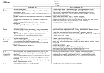 KLASA V Numer i temat lekcji OKRES I UCZEŃ PODSTAWOWE - wyjaśnia termin faktura - wymienia na podstawie obserwacji rodzaje powierzchni występujących w wyjaśnia termin faktura - wymienia na podstawie obserwacji rodzaje powierzchni występujących w przyrodzie - uzyskuje w pracy fakturę poprzez odciśnięcie przedmiotu lub zastosowanie frotażu - określa rodzaje różnych powierzchni na przykładach z najbliższego otoczenia - podaje poznane przykłady otrzymywania faktury w działaniach plastycznych - przedstawia przykłady faktury w rysunku i malarstwie PONADPODSTAWOWE - wymienia rodzaje faktury występujące w dziełach różnych dyscyplin plastycznych - wymienia rodzaje faktury występujące w dziełach różnych dyscyplin plastycznych - omawia różnice w fakturach uzyskanych w różnego typu działaniach plastycznych - realizuje pracę na zadany temat z wykorzystaniem poznanych sposobów uzyskiwania rozmaitych faktur na płaszczyźnie - opisuje sposoby przedstawiania faktury w rysunku i malarstwie - wyjaśnia, czemu służy stosowanie faktury w rysunku i malarstwie - przedstawia rolę faktury w rzeźbie na przykładach popiersia Juliusza Cezara oraz „Popiersia Vienneta” Honoré Daumiera i „Mechanicznej głowy” Raoula Hausmanna - wykonuje dodatkowe zadanie plastyczne 2. Kształt - wyjaśnia termin forma - wyodrębnia i określa kształty przedmiotów z najbliższego otoczenia - zaznacza w działaniach plastycznych kształty przedmiotów o prostej budowie - tłumaczy, jaka jest różnica między formą płaską a przestrzenną - wykorzystuje wybrane formy w działaniach plastycznych - wymienia podstawowe rodzaje form występujących w otoczeniu człowieka - omawia formy rzeźb „Odpoczywający Ares” Lizypa i „Rzeźba parkowa” Barbary Hepworth - tłumaczy, czym się różni forma przestrzenna od rzeźby - wykorzystuje formę jako środek wyrazu plastycznego w działaniach twórczych - przedstawia środki wyrazu zastosowane przez Katarzynę Kobro w „Kompozycji przestrzennej” - wyjaśnia funkcję formy w sztuce 3. Kompozycja centralna - wyjaśnia termin kompozycja - wskazuje przykłady kompozycji centralnej w najbliższym otoczeniu - wymienia zasady tworzenia kompozycji centralnej - wykorzystuje zasady tworzenia kompozycji centralnej w działaniach plastycznych - podaje zasady harmonijnej kompozycji 4. i 5. Kompozycja symetryczna i asymetryczna - wymienia niektóre cechy kompozycji symetrycznej i asymetrycznej - stosuje metodę odbijania elementów przy tworzeniu kompozycji symetrycznej - wskazuje przykłady kompozycji symetrycznej w najbliższym otoczeniu - rozpoznaje układy symetryczne i asymetryczne na płaszczyźnie oraz w przestrzeni - podejmuje próbę tworzenia kompozycji symetrycznej i asymetrycznej za pomocą poznanych środków wyrazu - wymienia cechy kompozycji otwartej i zamkniętej - wyjaśnia, co to jest akcent plastyczny - omawia przykłady kompozycji centralnej w przyrodzie - określa cechy kompozycji centralnej na przykładzie reprodukcji „Błękitny chłopiec” Thomasa Gainsborough - stosuje akcent plastyczny - odróżnia dobrą kompozycję od złej - przedstawia rolę kompozycji jako środka wyrazu plastycznego - twórczo wykorzystuje kompozycję centralną w działaniach plastycznych - porównuje znaczenia terminu kompozycja w plastyce i muzyce - omawia cechy kompozycji symetrycznej na przykładzie ilustracji w podręczniku - twórczo stosuje kompozycję symetryczną i asymetryczną w działaniach plastycznych - porównuje obrazy „Madonna z Dzieciątkiem i świętymi” Sandra Botticellego i „Pani Charpentier z dziećmi” Pierre’a-Auguste’a Renoira pod kątem zastosowanej kompozycji 1. Faktura 6. i 7. - wskazuje różnice między kompozycją otwartą i zamkniętą - tworzy samodzielnie lub w grupie kompozycję otwartą i zamkniętą na płaszczyźnie z zastosowaniem wybranej techniki - przedstawia rolę kompozycji jako środka wyrazu plastycznego - w twórczy sposób stosuje odpowiednie środki wyrazu plastycznego do ukazania kompozycji otwartej i zamkniętej - porównuje reprodukcje dzieł „Wenecja” Edwarda Dwurnika i „Trzej muzykanci” Pabla Picassa pod kątem gamy barwnej oraz kompozycji 8. i 9. - omawia cechy kompozycji statycznej i dynamicznej - wykonuje na płaszczyźnie kompozycję dynamiczną z zastosowaniem wybranej techniki Kompozycja - podaje przykłady kompozycji statycznej i dynamicznej w najbliższym plastycznej statyczna i otoczeniu - omawia obrazy „Portret chłopca z rudymi włosami” Amadea Modiglianiego i „Kościół w dynamiczna - wymienia elementy i układy tworzące kompozycję dynamiczną i statyczną Murnau” Wassilego Kandinskiego pod kątem zastosowanej kompozycji - przedstawia na płaszczyźnie scenę rodzajową z zastosowaniem kompozycji - twórczo wykorzystuje różnorodne techniki i środki wyrazu do tworzenia kompozycji statycznej i statycznej dynamicznej - wskazuje przykłady kompozycji statycznej i dynamicznej w reprodukcjach wybranych dzieł - wskazuje układy rytmiczne w najbliższym otoczeniu - wymienia różne rodzaje rytmów i wyjaśnia, jakie elementy mogą je tworzyć 10. Kompozycja - wykonuje kompozycję rytmiczną poprzez odbijanie wzoru z szablonu - realizuje pracę na zadany temat z zastosowaniem kompozycji rytmicznej, z uwzględnieniem rytmiczna - wyjaśnia, czym się charakteryzuje kompozycja rytmiczna dowolnego rodzaju rytmu - tworzy na płaszczyźnie układy z zastosowaniem kompozycji rytmicznej - omawia reprodukcję obrazu „Port rybacki w Collioure” André Deraina - wyjaśnia, jakie zjawiska można przedstawić na płaszczyźnie z zastosowaniem kompozycji rytmicznej - wskazuje przykłady kompozycji rytmicznej w wybranych dziełach - wyjaśnia termin perspektywa - określa rolę perspektywy w dziele plastycznym 11. Perspektywa - przedstawia na płaszczyźnie kompozycję z zastosowaniem perspektywy - przedstawia perspektywę rzędową w pracach plastycznych o zróżnic