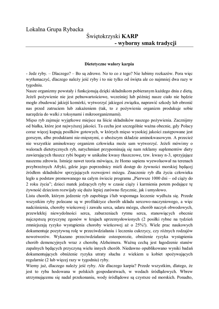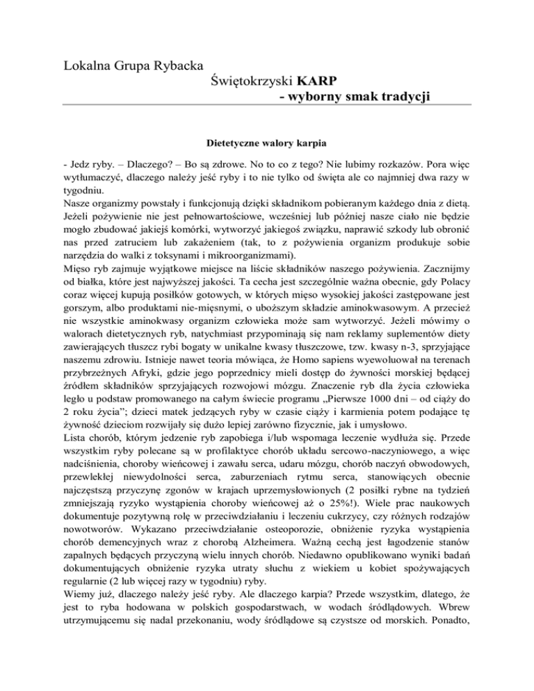Lokalna Grupa Rybacka Świętokrzyski KARP - wyborny smak tradycji Dietetyczne walory karpia - Jedz ryby. – Dlaczego? – Bo są zdrowe. No to co z tego? Nie lubimy rozkazów. Pora więc wytłumaczyć, dlaczego należy jeść ryby i to nie tylko od święta ale co najmniej dwa razy w tygodniu. Nasze organizmy powstały i funkcjonują dzięki składnikom pobieranym każdego dnia z dietą. Jeżeli pożywienie nie jest pełnowartościowe, wcześniej lub później nasze ciało nie będzie mogło zbudować jakiejś komórki, wytworzyć jakiegoś związku, naprawić szkody lub obronić nas przed zatruciem lub zakażeniem (tak, to z pożywienia organizm produkuje sobie narzędzia do walki z toksynami i mikroorganizmami). Mięso ryb zajmuje wyjątkowe miejsce na liście składników naszego pożywienia. Zacznijmy od białka, które jest najwyższej jakości. Ta cecha jest szczególnie ważna obecnie, gdy Polacy coraz więcej kupują posiłków gotowych, w których mięso wysokiej jakości zastępowane jest gorszym, albo produktami nie-mięsnymi, o uboższym składzie aminokwasowym. A przecież nie wszystkie aminokwasy organizm człowieka może sam wytworzyć. Jeżeli mówimy o walorach dietetycznych ryb, natychmiast przypominają się nam reklamy suplementów diety zawierających tłuszcz rybi bogaty w unikalne kwasy tłuszczowe, tzw. kwasy n-3, sprzyjające naszemu zdrowiu. Istnieje nawet teoria mówiąca, że Homo sapiens wyewoluował na terenach przybrzeżnych Afryki, gdzie jego poprzednicy mieli dostęp do żywności morskiej będącej źródłem składników sprzyjających rozwojowi mózgu. Znaczenie ryb dla życia człowieka legło u podstaw promowanego na całym świecie programu „Pierwsze 1000 dni – od ciąży do 2 roku życia”; dzieci matek jedzących ryby w czasie ciąży i karmienia potem podające tę żywność dzieciom rozwijały się dużo lepiej zarówno fizycznie, jak i umysłowo. Lista chorób, którym jedzenie ryb zapobiega i/lub wspomaga leczenie wydłuża się. Przede wszystkim ryby polecane są w profilaktyce chorób układu sercowo-naczyniowego, a więc nadciśnienia, choroby wieńcowej i zawału serca, udaru mózgu, chorób naczyń obwodowych, przewlekłej niewydolności serca, zaburzeniach rytmu serca, stanowiących obecnie najczęstszą przyczynę zgonów w krajach uprzemysłowionych (2 posiłki rybne na tydzień zmniejszają ryzyko wystąpienia choroby wieńcowej aż o 25%!). Wiele prac naukowych dokumentuje pozytywną rolę w przeciwdziałaniu i leczeniu cukrzycy, czy różnych rodzajów nowotworów. Wykazano przeciwdziałanie osteoporozie, obniżenie ryzyka wystąpienia chorób demencyjnych wraz z chorobą Alzheimera. Ważną cechą jest łagodzenie stanów zapalnych będących przyczyną wielu innych chorób. Niedawno opublikowano wyniki badań dokumentujących obniżenie ryzyka utraty słuchu z wiekiem u kobiet spożywających regularnie (2 lub więcej razy w tygodniu) ryby. Wiemy już, dlaczego należy jeść ryby. Ale dlaczego karpia? Przede wszystkim, dlatego, że jest to ryba hodowana w polskich gospodarstwach, w wodach śródlądowych. Wbrew utrzymującemu się nadal przekonaniu, wody śródlądowe są czystsze od morskich. Ponadto, polskie restrykcyjne przepisy środowiskowe wymuszają ścisłe przestrzeganie przez hodowców zasad chroniących te wody. Spożywanie ryb hodowanych w czystej wodzie jest zdrowe i bezpieczne. Karp jest w Polsce najczęściej hodowany w sposób, który powinien zadowalać wszystkich obrońców środowiska naturalnego - żywi się naturalnym pokarmem stawu i jedynie w okresie największego żerowania dokarmiany jest pokarmem roślinnym (głównie zboża), w przeciwieństwie do ryb drapieżnych, które cały czas karmione są sztucznymi paszami. Trzeba jedynie kupować go z wiadomego źródła. Taki karp ma zawsze przyjemny smak. Żeby tego nie stracić, nie powinniśmy żywego karpia długo nosić bez wody i dostępu do powietrza – np. zawiniętego szczelnie w folię, gdyż wtedy pojawiają się obce posmaki wskutek działania kwasu mlekowego. A komu przeszkadza obecność ości, temu proponujemy pocięcie fileta, albo w specjalnej maszynie w sklepie rybnym, albo w domu, nożem (naciąć trzeba grzbietową i ogonową część fileta co ok. 0,4 cm bez przecięcia skóry). Prof. dr hab. Krystyna A. Skibniewska, Katedra Podstaw Bezpieczeństwa Uniwersytetu Warmińsko-Mazurskiego w Olsztynie Lokalna Grupa Rybacka Świętokrzyski Karp poleca wyśmienitą rybę na świąteczny stół Zakup i przenoszenie żywego karpia ze sklepu do domu jest zgodne z polskim prawem. __________________________________________________________________________________ Operacja współfinansowana przez Unię Europejską ze środków finansowych Europejskiego Funduszu Rybackiego zapewniającą inwestycję w zrównoważone rybołówstwo