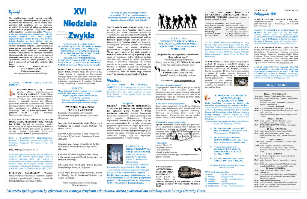 Dzisiaj … We współczesnym świecie wartość człowieka mierzy się jego zdolnością produkcji, posiadanym majątkiem lub zarobkiem. Ale ci, którzy wiele posiadają lub zarabiają, czy są naprawdę szczęśliwi? Życie pędzi ich od interesu do interesu w gorączkowym pośpiechu. Żyją obok samych siebie, zagubieni – pożałowania godni. Większość z nas jest zabiegana nie z własnej winy; nie dla zbijania majątku, lecz aby osiągnąć najpotrzebniejsze środki do życia. Nie możemy jednak dopuścić do tego, abyśmy stali się niewolnikami codziennych trosk. Przecież Bóg stworzył nas ludźmi wolnymi. Uczciwa i sumienna praca zawsze pozostanie naszym obowiązkiem. Powinniśmy jednak starać się zachowywać tyle wolności i niezależności od trudnych warunków ekonomicznych, aby czynić coś, co nie przynosi nam zysku, materialnej korzyści – na przykład jak Apostołowie „pójść na miejce pustynne”, by w ciszy i samotności usłyszeć głos sumienia, głos Boga. I czyt.: Jr 23,1-6 II czyt.: Ef 2,13-18 Ew. Św. Marka 6:30-34 Psalm responsorialny: Pan mym pasterzem, nie brak mi niczego Na KAWĘ DOMOWY. I PĄCZKI zaprasza KOŚCIÓŁ ROZPROWADZANE są również zdrowe chipy warzywno-owocowe "CHRISPY NATURAL" z Polski. Chipsy są wytwarzane w Kaliszu z wielkopolskich owoców i warzyw. Jest wiele różnych rodzajów chipsów i suszonych owoców jak jabłkowe, pomidorowe, burakowe czy marchewkowe. Chipsy te posiadają wszystkie zdrowotne europejskie atesty i są także sprzedawane w lokalnych sklepach w Mississauga. Cena za jedno opakowanie 15-20 gramowe $1.00. Więcej informacji: http://www.crispynatural.pl/ Na stałe działa PUNKT ZBIORU BUTELEK PO PIWIE, WINIE, ALKOHOLU ORAZ PUSZEK PO PIWIE. Dochód ze sprzedaży butelek przeznaczony jest na wyjazd młodzieży na Światowe Dni Młodzieży. Butelki przywozimy do garażu na parkingu i składamy obok drzwi. Do tej pory młodzież zarobiła $2433 ze sprzedanych butelek. DVD z WARSZTATÓW MAŁŻEŃSKICH. Komplet 5 konferencji opracowanych przez Dr. Waldemara Paligę jest do nabycia w sali pod kościołem. RÓŻANIEC prowadzi Róża nr. 12. Serdecznie zapraszamy dzisiaj na wieczór modlitw w duchu TAIZÉ. Podstawą spotkań grupy Taizé jest modlitwa śpiewana, która jest jednym z najistotniejszych sposobów ekspresji w poszukiwaniu bliskości Boga. Są to krótkie śpiewy kanonów, wielokrotnie powtarzanych. Spotkanie rozpocznie się w kościele o godz. 20 i będzie trwać do godz. 21:00. BIULETYN PARAFIALNY. Wszelkie zmiany dotyczące nazwisk i telefonów liderów organizacji parafialnych prosimy zgłaszać do biura parafialnego do końca VIII br. 12 VIII środa. MSZE ŚWIĘTE NA KATOLICKICH CMENTARZACH ARCHIDIECEZJI TORONTO odprawione zostaną w intencji zmarłych o 19:00. W środę, 22 lipca przypadają urodziny Sr Karoliny. Wraz z życzeniami zdrowia, radości i pomyślności w pracy duszpasterskiej życzymy siostrze obfitości łask Bożych. MINISTRANCI Z NASZEJ PARAFII WYJEŻDŻAJĄ W TYM TYGODNIU NA OBÓZ. ŻYCZYMY IM DOBREGO I OWOCNEGO WYPOCZYNKU, A W SZCZEGÓLNOŚCI DUCHOWEGO PRZEŻYCIA TEGO CZASU. PARAFIAN PROSIMY O MODLITWĘ W ICH INTENCJI. DZIĘKUJEMY Firmie EDDIE’S EUROPEAN & DELI MARKET za podarowanie SAMOCHODU CHŁODNI na wyjazd Ministrantów na Kaszuby. SERDECZNIE WITAMY w naszej parafii ks. prof. nadzw. dr hab. Norberta Pikułę z Częstochowy. Ks. Norbert pracuje w Krakowie na Uniwersytecie Pedagogicznym i jest dyrektorem Instytutu Pracy Socjalnej. Ks. Pikuła będzie nam pomagał przez okres wakacyjny i pozostanie do 2 września. Serdecznie witamy i dziękujemy za pomoc duszpasterską. CHRZTY Mocą działania Ducha świętego i przez polanie wodą, dar chrztu świętego otrzymają: Sophie Angeline Marana Kosiorkiewicz córka Erma i Ireneusza Dzieciom, rodzicom i chrzestnym życzymy dużo zdrowia i błogosławieństwa Bożego. ZWIĄZEK MAŁŻENSKI PLANUJĄ ZAWRZEĆ Katarzyna Drozd córka Ireny i Józefa & Antonio Christopher Palermo syn Mirella i Francesco Weronika Sara Kruszyńska córka Małgorzaty i Waldemar & Michael Joseph McCann syn Donna i David Justyna Czyżewska córka Heleny i Wiesława & Matthew Tyler Lotoski Gordon syn Joanne i Douglas Salvacion Maer Bascos córka Glorii i Teofilo & Wojciech Nornert Podlewski syn Janiny i Henryka Katharine Elizabeth Karpinski córka Heleny i Edwarda & Krzysztof Paweł Kasiulewicz syn Danuty i Antoniego Julie Anne Klin córka Elaine i Burnie & Justin Stróżyński syn Danuty i Zbigniewa Nicole Maria Switalski córka Grażyny i Pawła & Timothy Jacob Stankowski-Rośniak syn Teresy i Tomasza Wymienionym parom życzymy Bożego Błogosławieństwa. NASZA WSPÓLNOTA PARAFIALNA dołącza do historycznej akcji “rodzina wiary”, której zadaniem jest pomoc finansowa archidiecezji Torontońskiej. Aby uzyskać potrzebną sumę 105 milionów, potrzebujemy kontynuować zbiórkę funduszy przez kolejne trzy do pięciu lat. Zadaniem akcji “rodzina wiary” jest finansowe wspomaganie bieżących potrzeb archidiecezji Toronto mając na uwadze dziedzictwo pozostawiające kolejnym pokoleniom kościoła. Wasza partycypacja w tej akcji pomoże w rozwoju i umocnieniu naszej wspólnoty wiary. Akcja ta wspomagać będzie młodzież, posługę osób świeckich, zapewni, że katolicki głos będzie obecny w przestrzeni publicznej, jak również pomoże w utrzymaniu naszej katedry pw. św. Michała w Toronto. Będzie ona wspomagała również potrzeby wszystkich parafii archidiecezji Torontońskiej. Info: na temat akcji “rodzina wiary” na stroniewww.ourFamilyofFaith.ca Wkrótce… Assumption, Mississauga - Rev. Vincent Nguyen Chris the King, Markham - Thomas Cardinal Collins Holy Cross, Thornhill - Most Rev. Wayne Kirkpatrick Mount Hope, Toronto - Rev. Msgr. Paul A. Zimmer Woodbridge - Most Rev. John A. Boissonneau Resurrection, Whitby - Rev. Msgr. Ambrose Sheehy St. Mary’s, Barrie - Rev. Msgr. Lawrence Bordonaro 3 - 9 VIII 2015 TRZYDZIESTA TRZECIA PIESZA PIELGRZYMKA DO